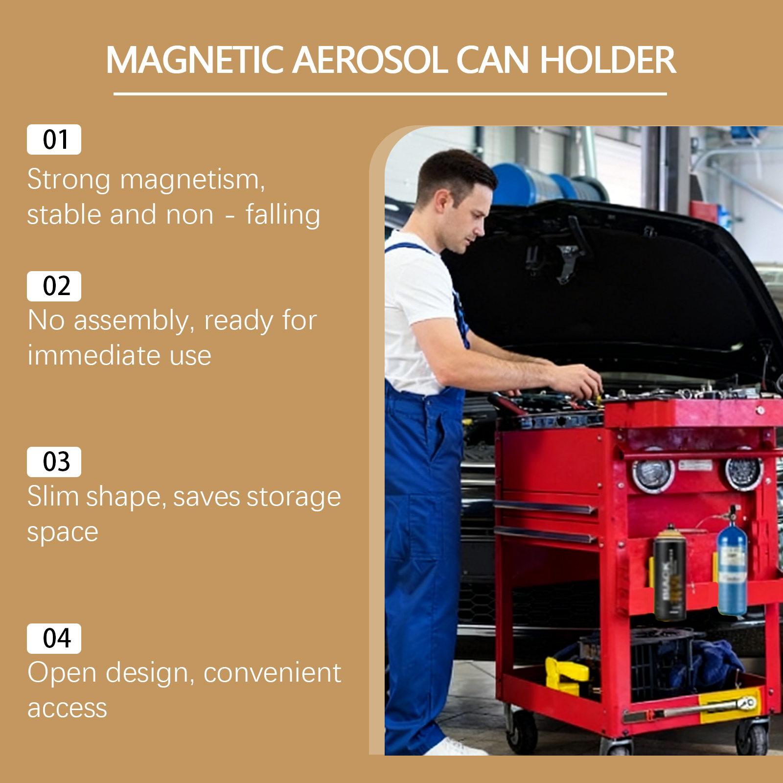 我们的绿色磁性气雾罐支架,由塑料、磁铁精心调配而成。专为牢固吸附在金属表面以储存喷雾罐设计。使用方法极为便捷:将支架固定在干净的金属表面上,将气雾罐放入支架中以保持稳定。并且它是纤薄机身,便于携带和移少,无需组装,几秒钟内即可安装完成。