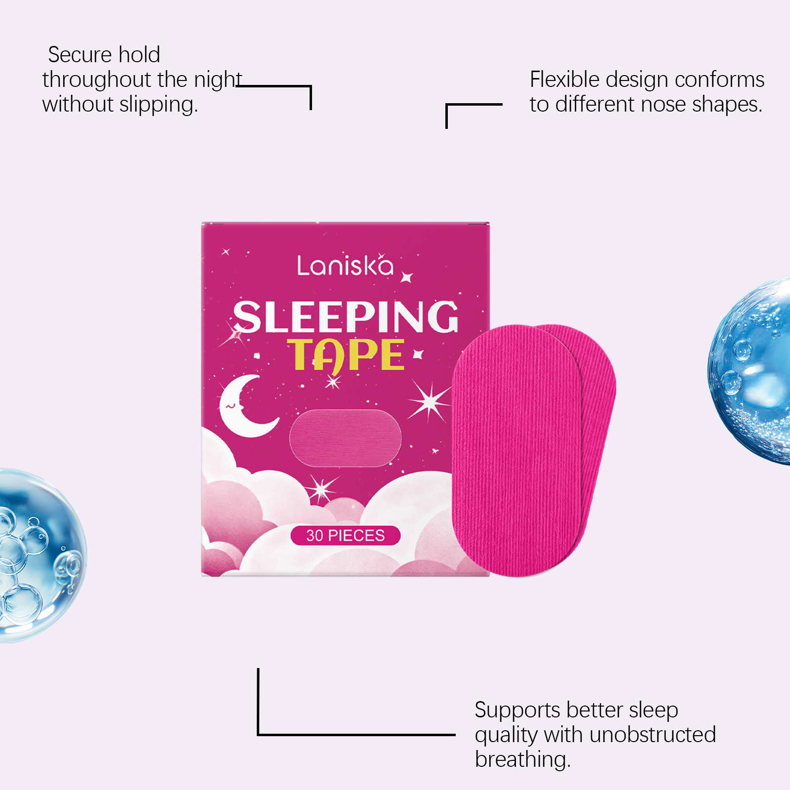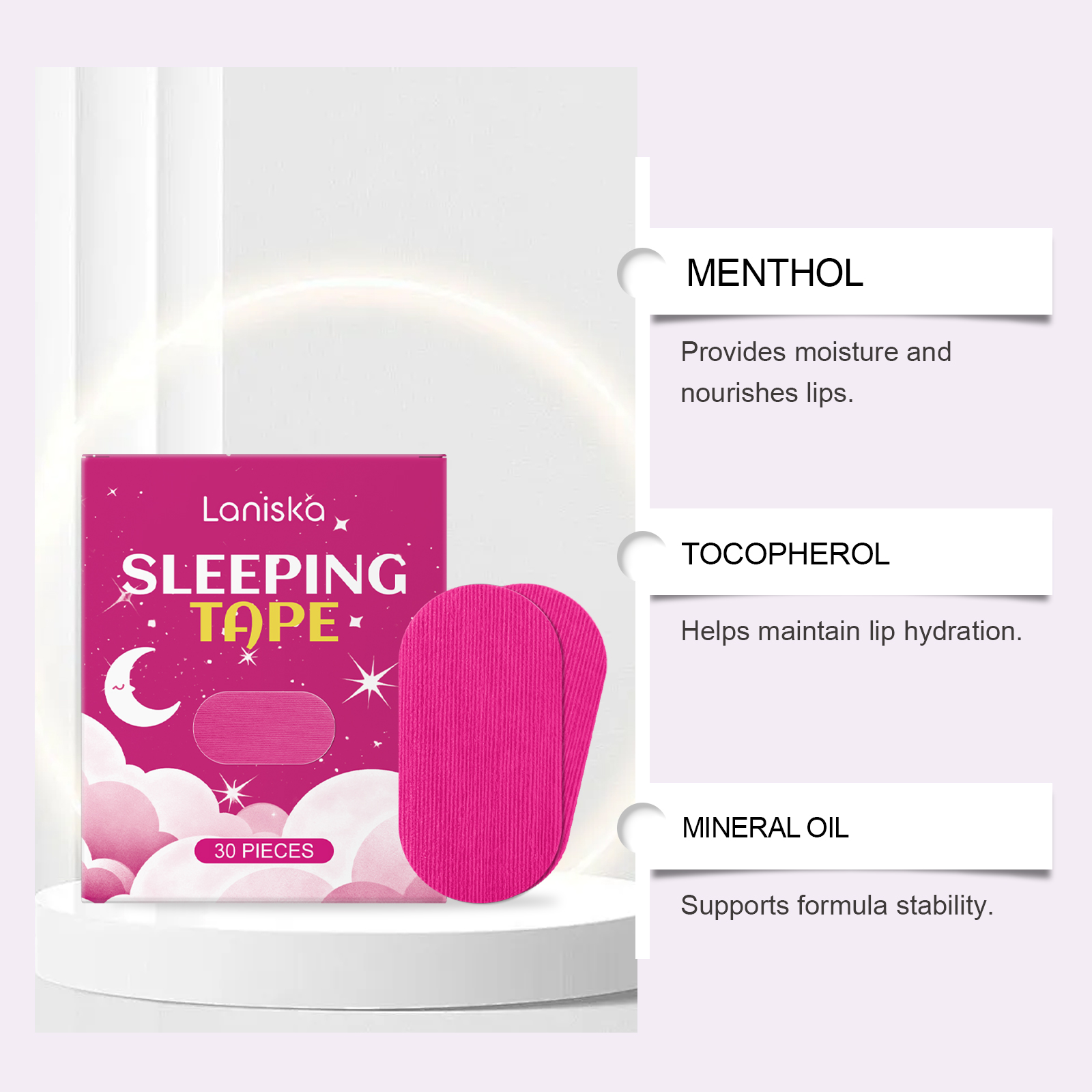 我们的睡眠贴,由矿油、蜂蜡精心调配而成。专为缓解因感冒或过敏引起的打鼾设计。使用方法极为便捷:1.清洁嘴巴周围的肌肤并干燥。2.睡觉前撕下背胶并把本产品贴在嘴巴上。3.睡醒取下胶带即可。并且它可以适合睡眠、锻炼和过敏期使用,温和适用于所有肤质,带来舒适体验。