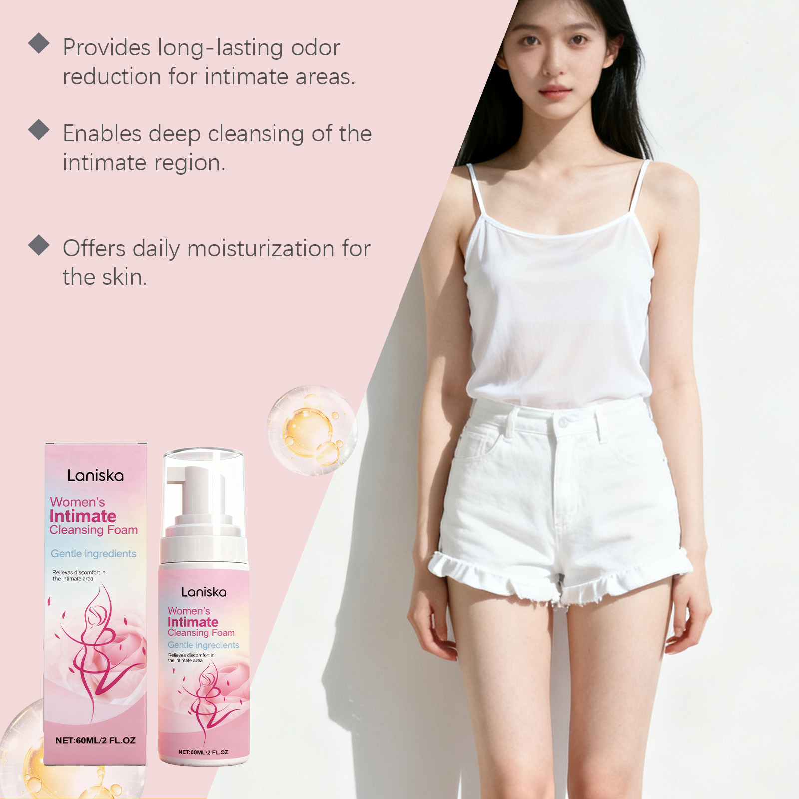 我们的女性私处慕斯,由蓖麻籽油、椰子油精心调配而成。专为减少私处异味设计。使用方法极为便捷:1. 将外阴周围的皮肤彻底冲洗一遍,使其充分湿润。2. 按下泵头,挤出适量的乳液,然后将其均匀涂抹在阴道周围的皮肤上。轻轻清洗约 30 秒。并且可彻底清洁私密部位。