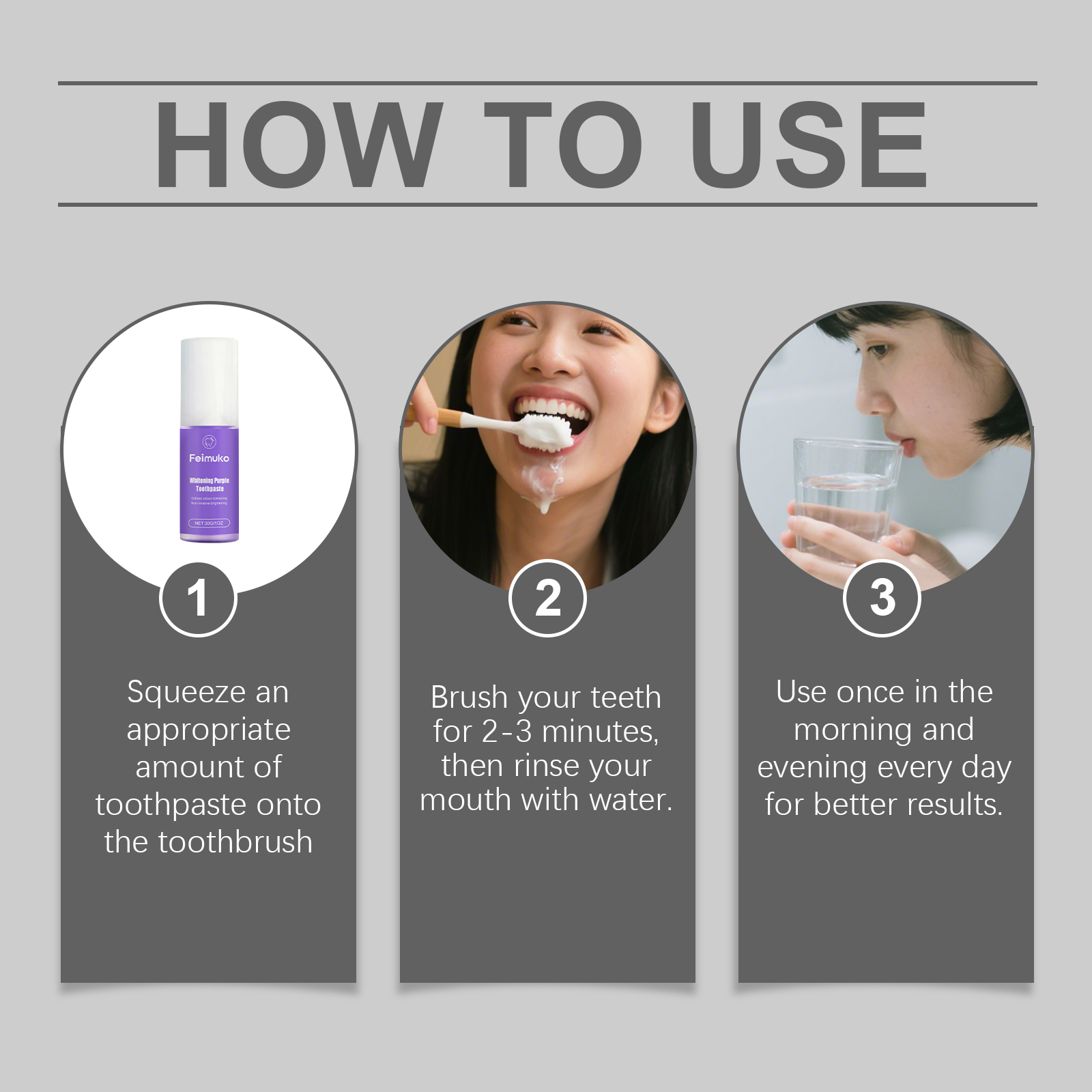 我们的紫色牙膏,由尿囊素、薄荷醇精心调配而成。专为增强牙齿亮度设计。使用方法极为便捷:挤出适量牙膏到牙刷上。刷牙2-3分钟,然后用水漱口。每天早晚各使用-次,以获得更好的效果。并且可以减少刺激,带来更温和的刷牙体验。