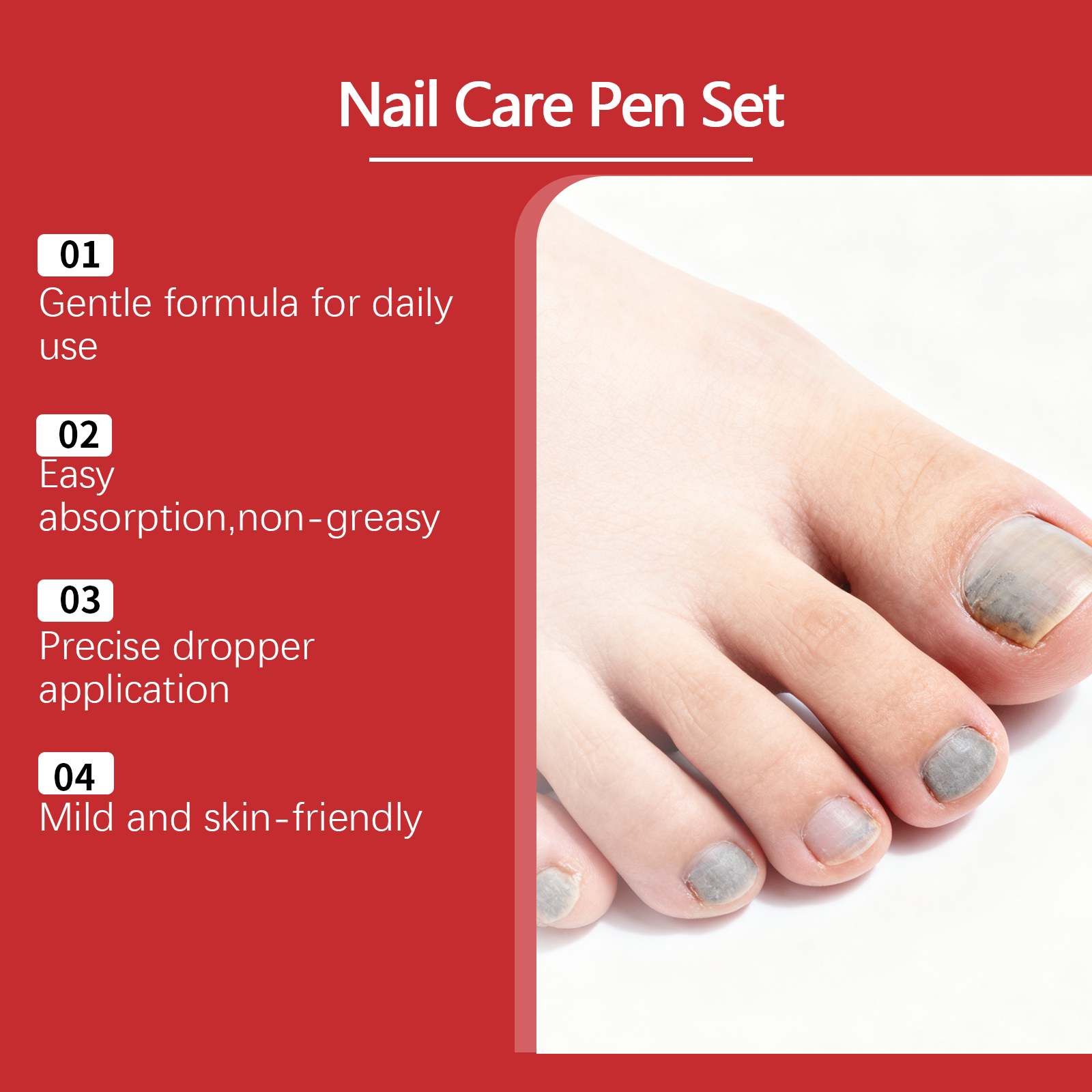 我们的指甲护理笔套装,由甘油、1,2-己二醇精心调配而成。专为方便日常指甲维护,滴管设计,便于精准使用设计。使用方法极为便捷:1.清洁直接表面并保持干燥,用指甲搓条打磨指甲表面。2.打开指甲护理笔盖子,将适量本品涂抹在指甲表面,等待吸收即可。并且它具备轻盈的质地不会压倒指甲。