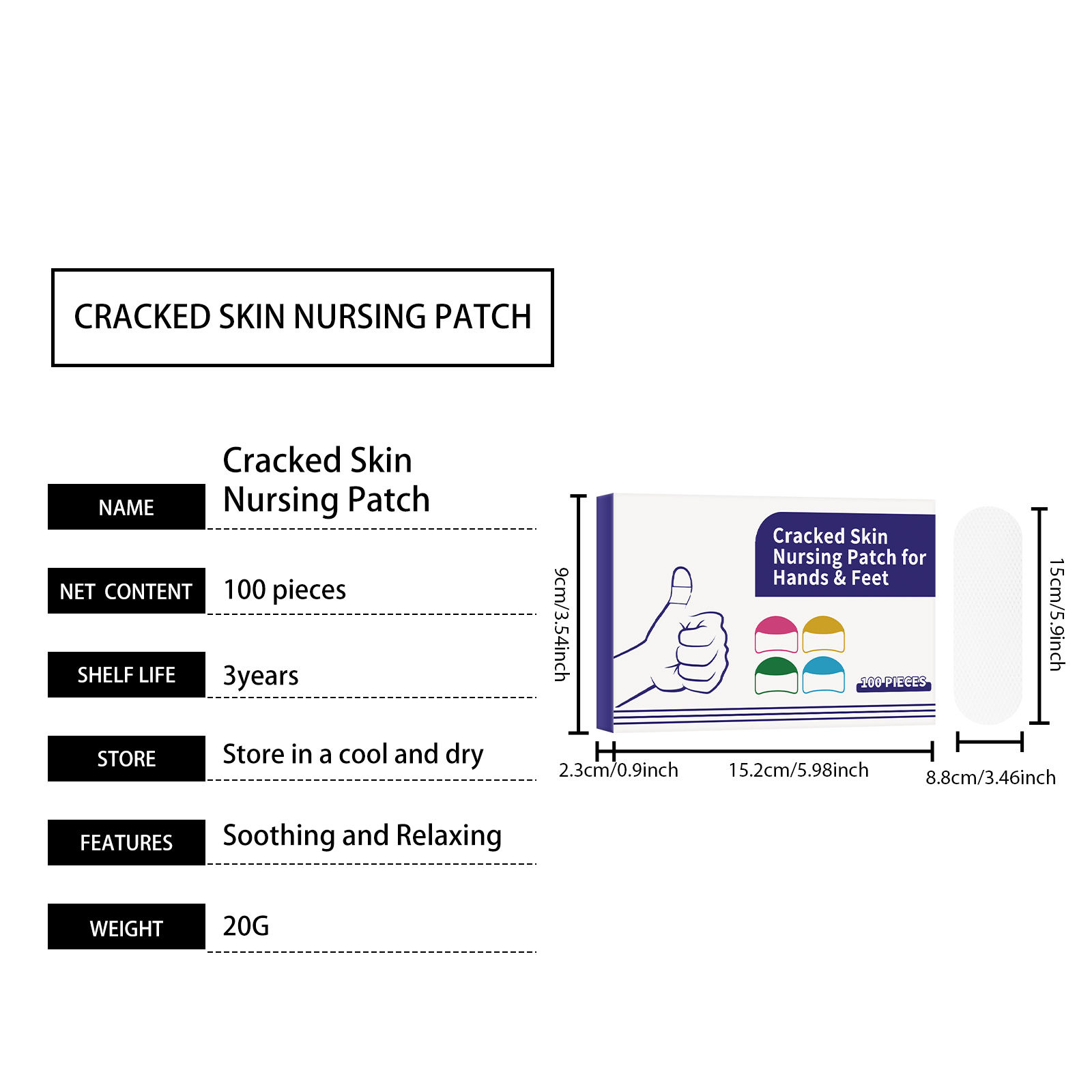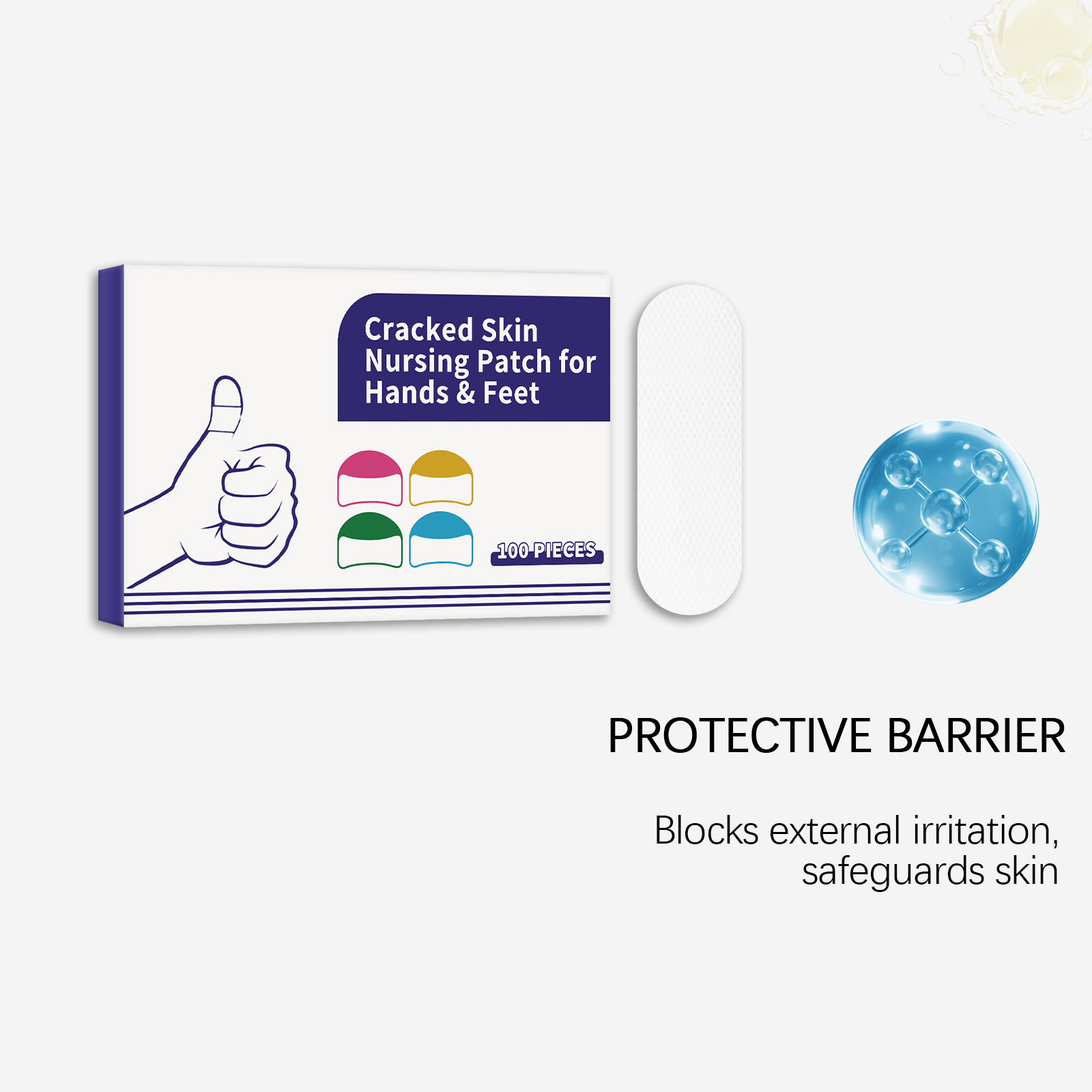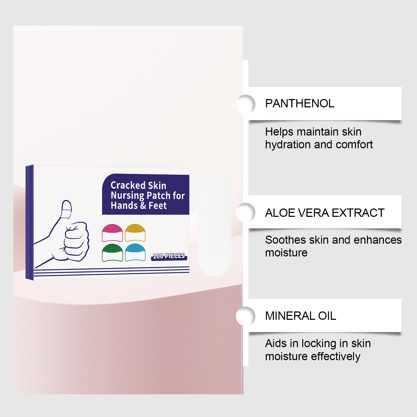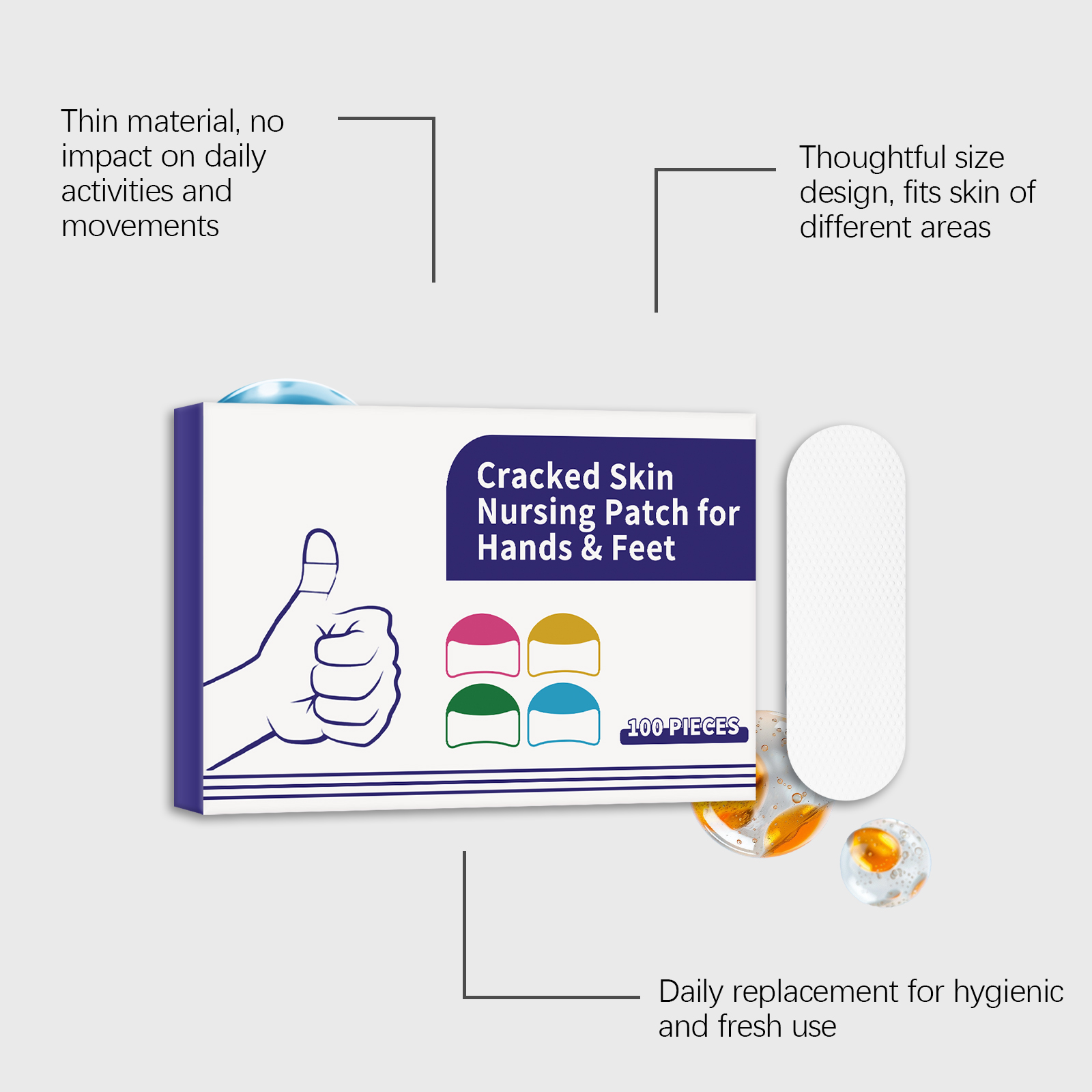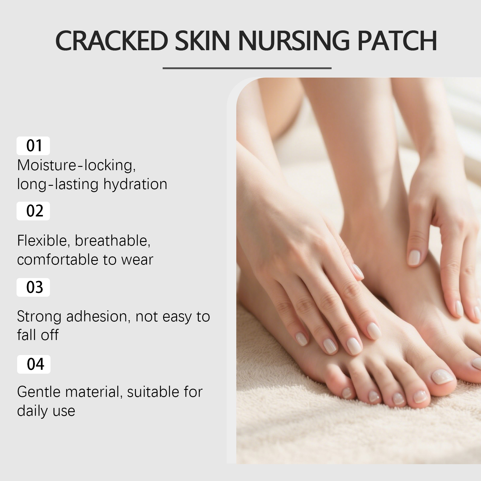 我们的手足护理贴,由矿油、蜂蜡精心调配而成。专为牢牢锁住水分,保持皮肤水润,适用于手部、脚部及易干燥区域设计。使用方法极为便捷:清洁手足肌肤并保持干燥,取出一张本品贴于手部干裂的肌肤,轻轻按压确保其粘合。并且它可以缓解与干燥相关的疼痛和不适。