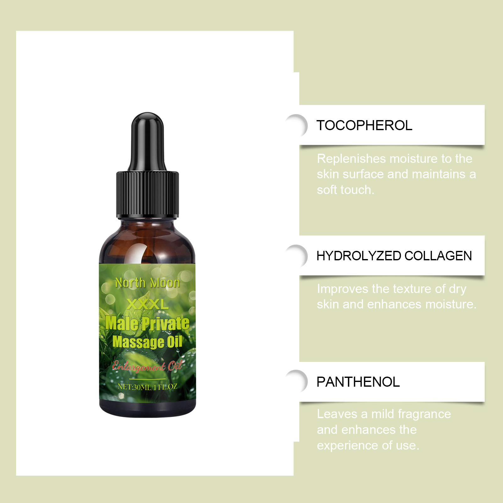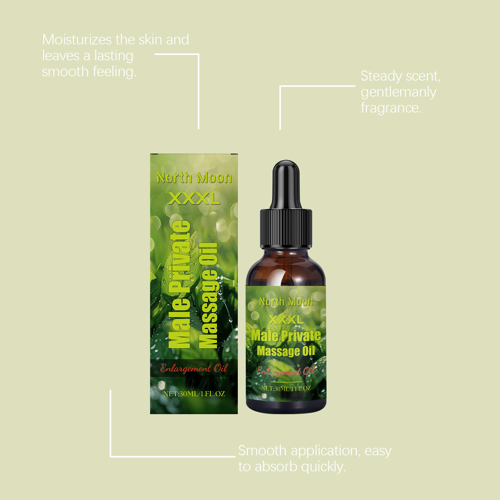 我们的男士草本精油,由甘油、1,2-己二醇精心调配而成。专为改善干燥皮肤的质地并增强保湿效果设计。使用方法极为便捷:1.清洁私处肌肤并保持干燥。2.取适量本品均匀涂抹私处肌肤上,待其吸收即可。并且它具有持久的香味,突出成熟魅力,适合所有季节,满足各种护肤需求。
