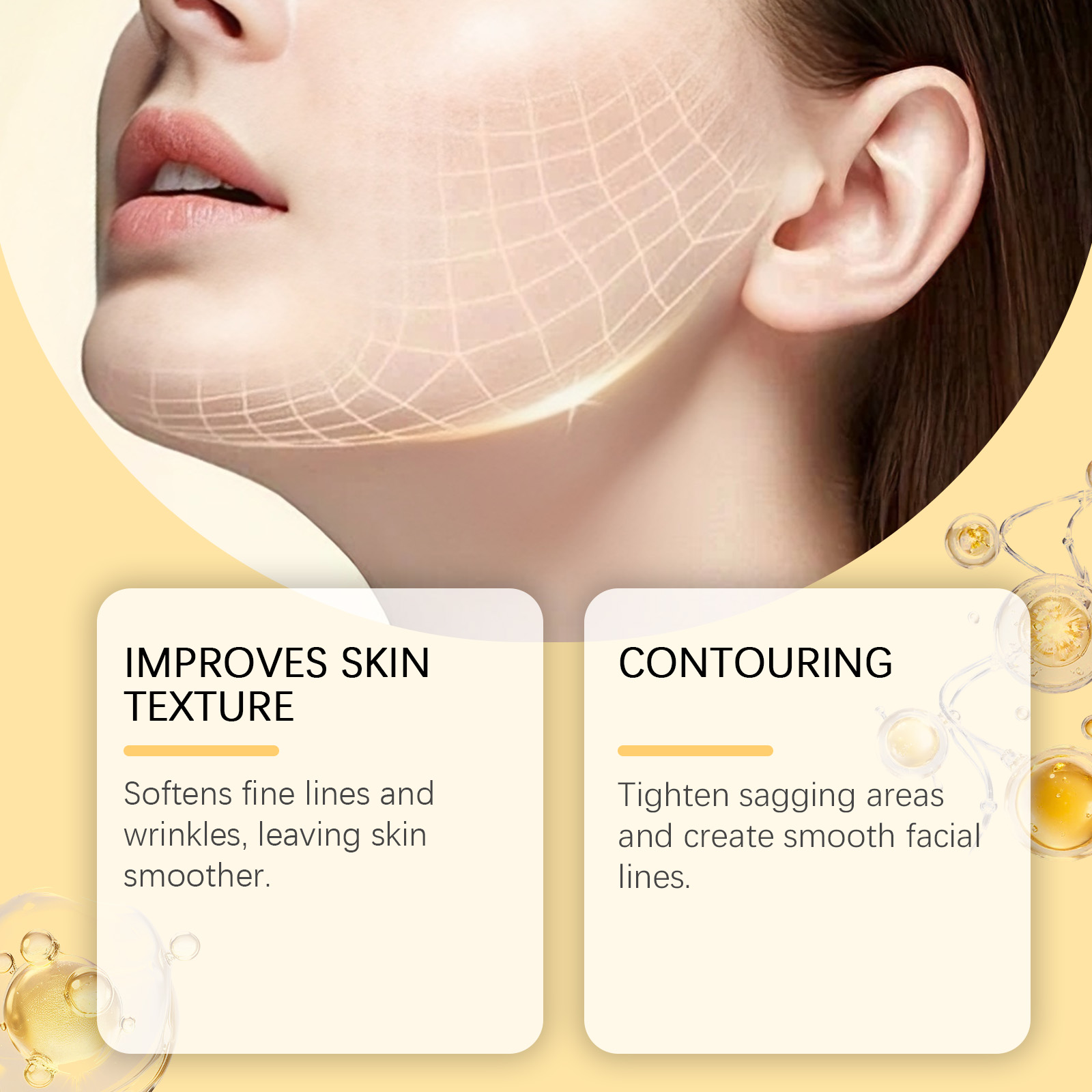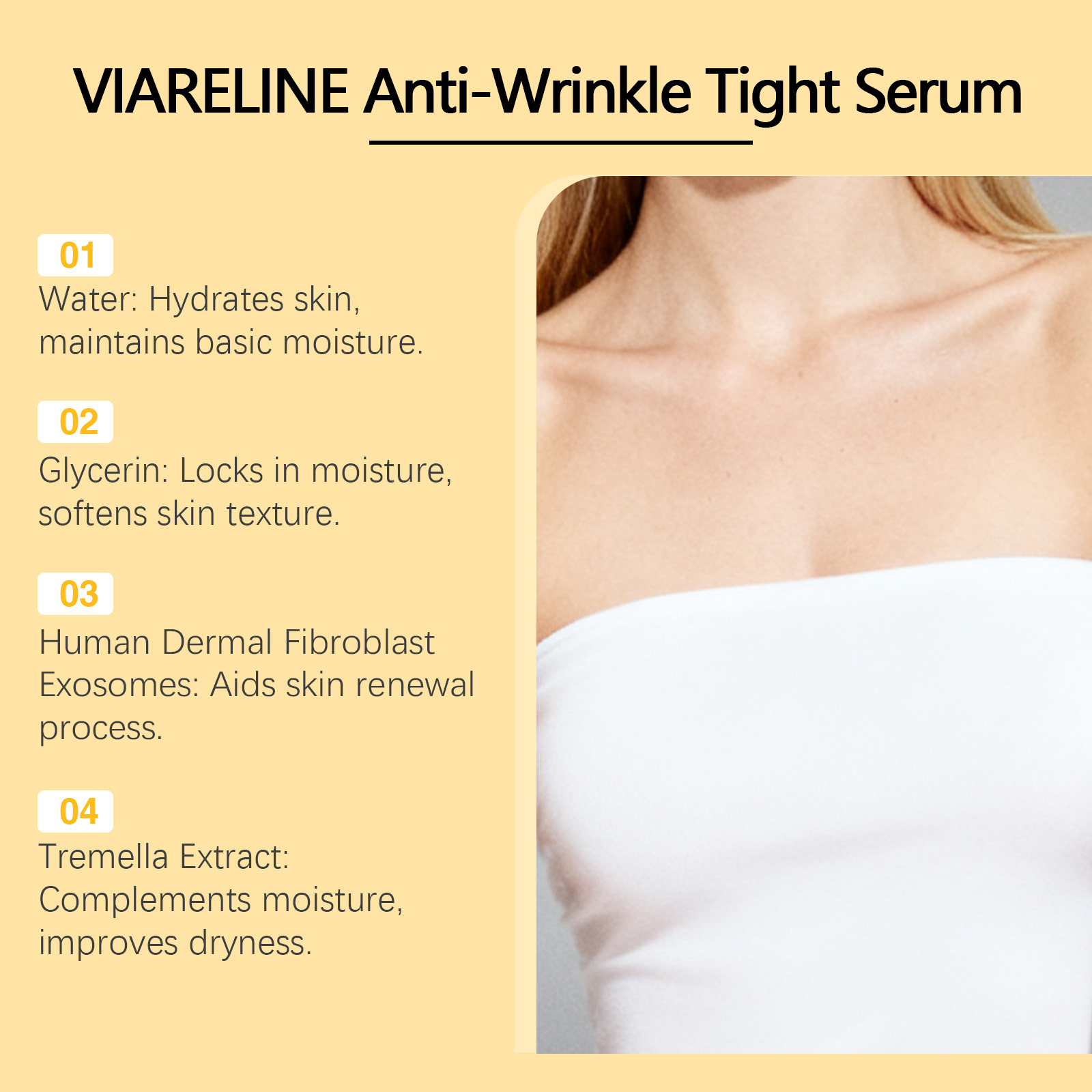 我们的面部精华液,由矿油、棕榈酸乙基己酯精心调配而成。专为软化细纹和皱纹使皮肤更光滑,紧致松弛区域,打造平滑面部线条设计。使用方法极为便捷:清洁并擦干你的脸。取适量本品均匀涂抹于面部。轻轻按摩以促进吸收。并且它可以促进健康肌肤,维持良好状态,滋养皮肤深层,并保持健康稳定的状态。