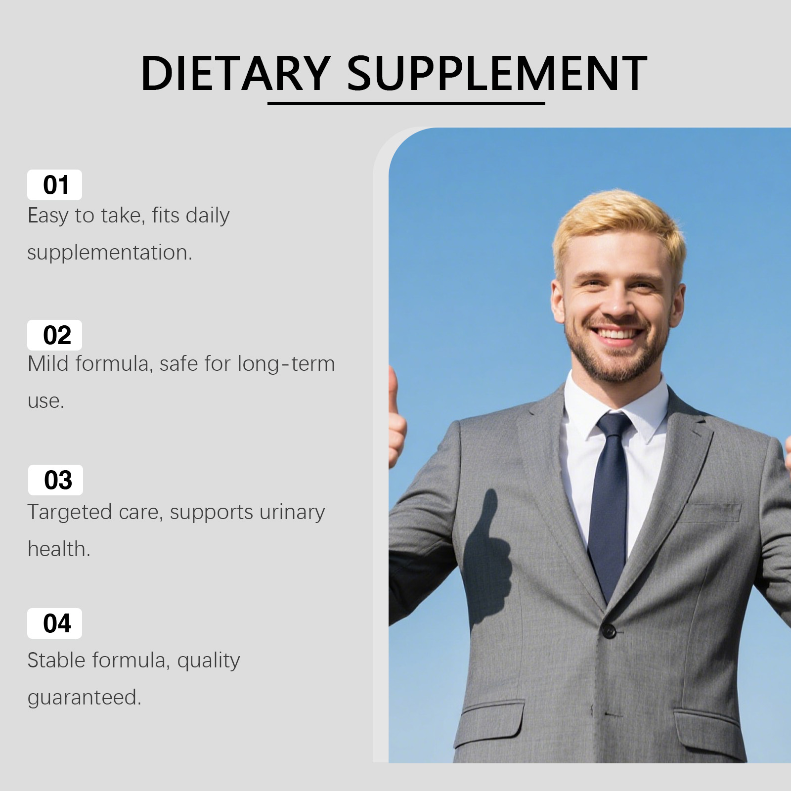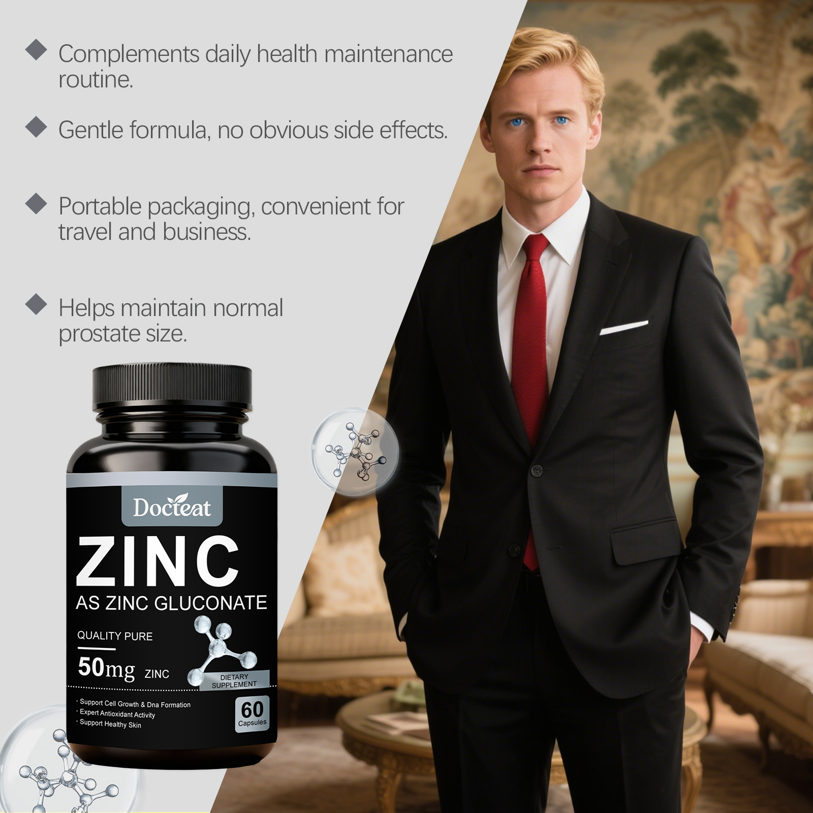 我们的锌补充胶囊,由锌(以葡萄糖酸锌的形式)精心调配而成。专为支持前列腺健康,维持正常尿流,稳定养护膀胱功能状态设计。使用方法极为便捷:每天一次,每次2粒。并且它可以助力维持泌尿道健康,支持身体抗氧化活性。