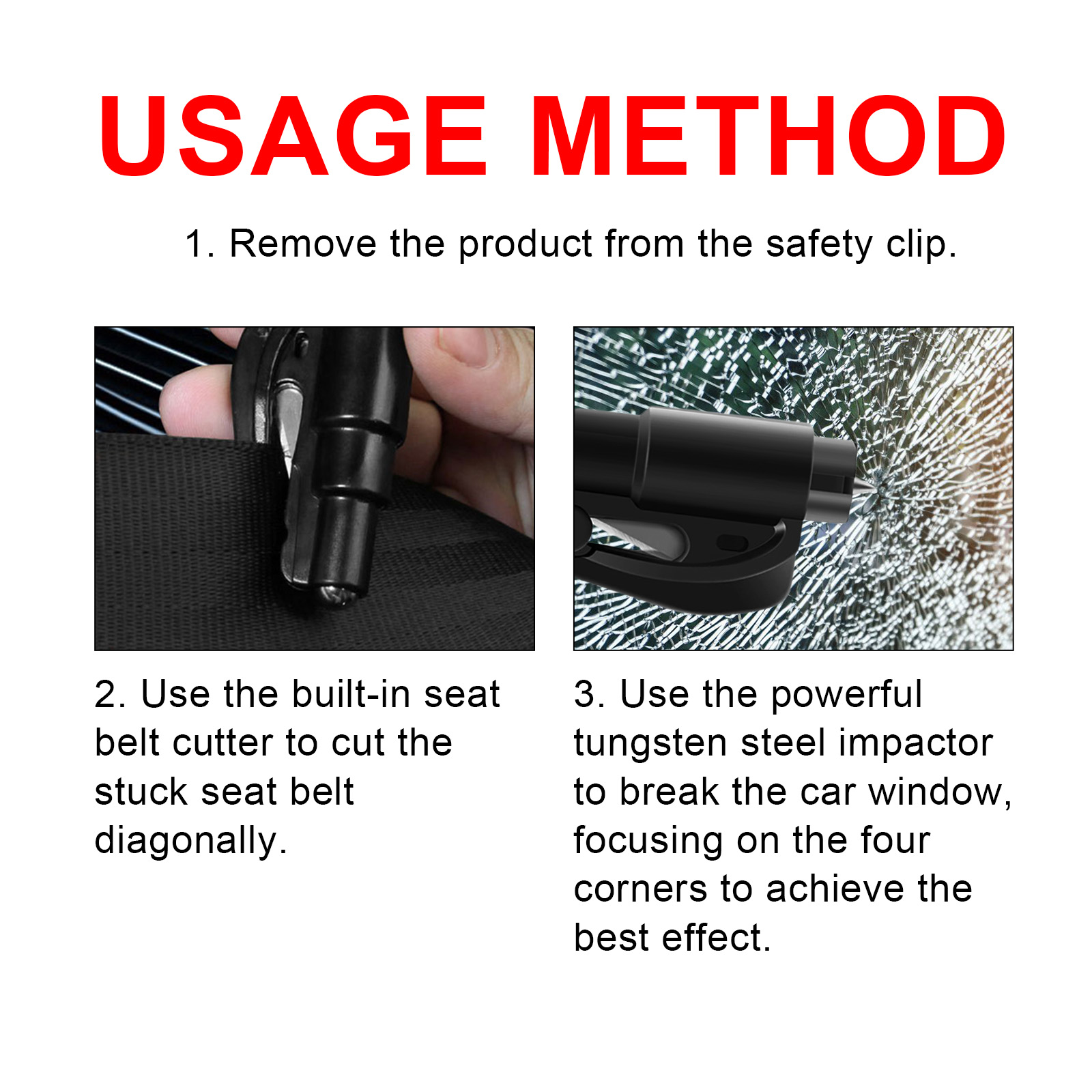 我们的二合一紧急汽车用品含有钢制锤头、ABS。它可以在车辆遇到紧急情况时提供安全保障,让车内人员在最短时间内安全逃生。它的使用方法很简单:将产品从安全夹上取下,使用内置的安全带切割器将卡住的安全带斜切,再使用强大的钨钢冲击器来打破车窗,重点放在四个角上,以达到最佳效果。可以用来打破车窗玻璃和切断安全带,使用方便,结构紧凑,重量轻,放在车门口袋或中控台都很方便,让您每次开车时都能安心。