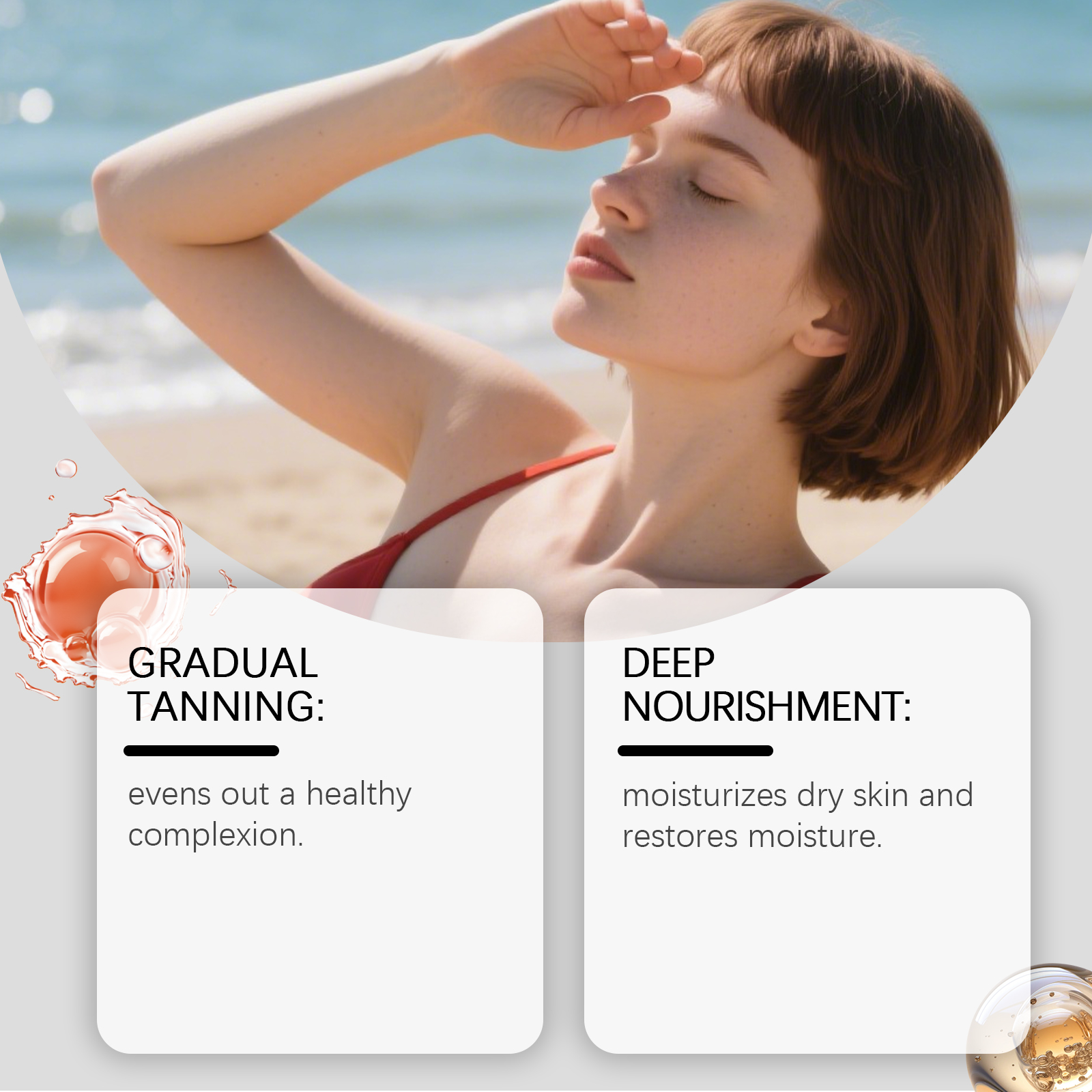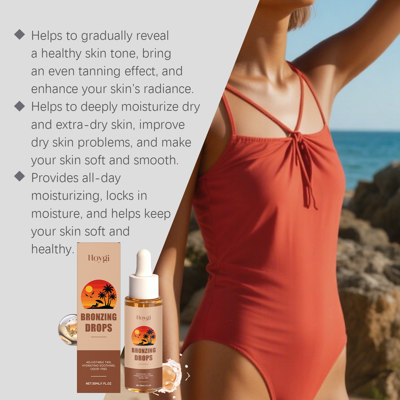 Hoygi The Tanning Care Drops Gently Moisturize The Body And Skin. The Wheat-Colored Texture Is Soft And Comfortable To Apply