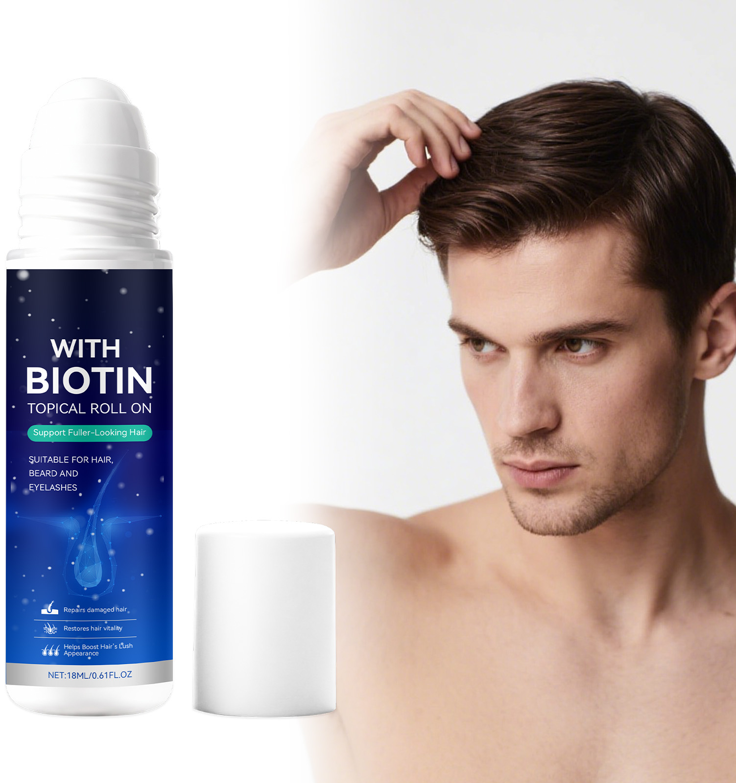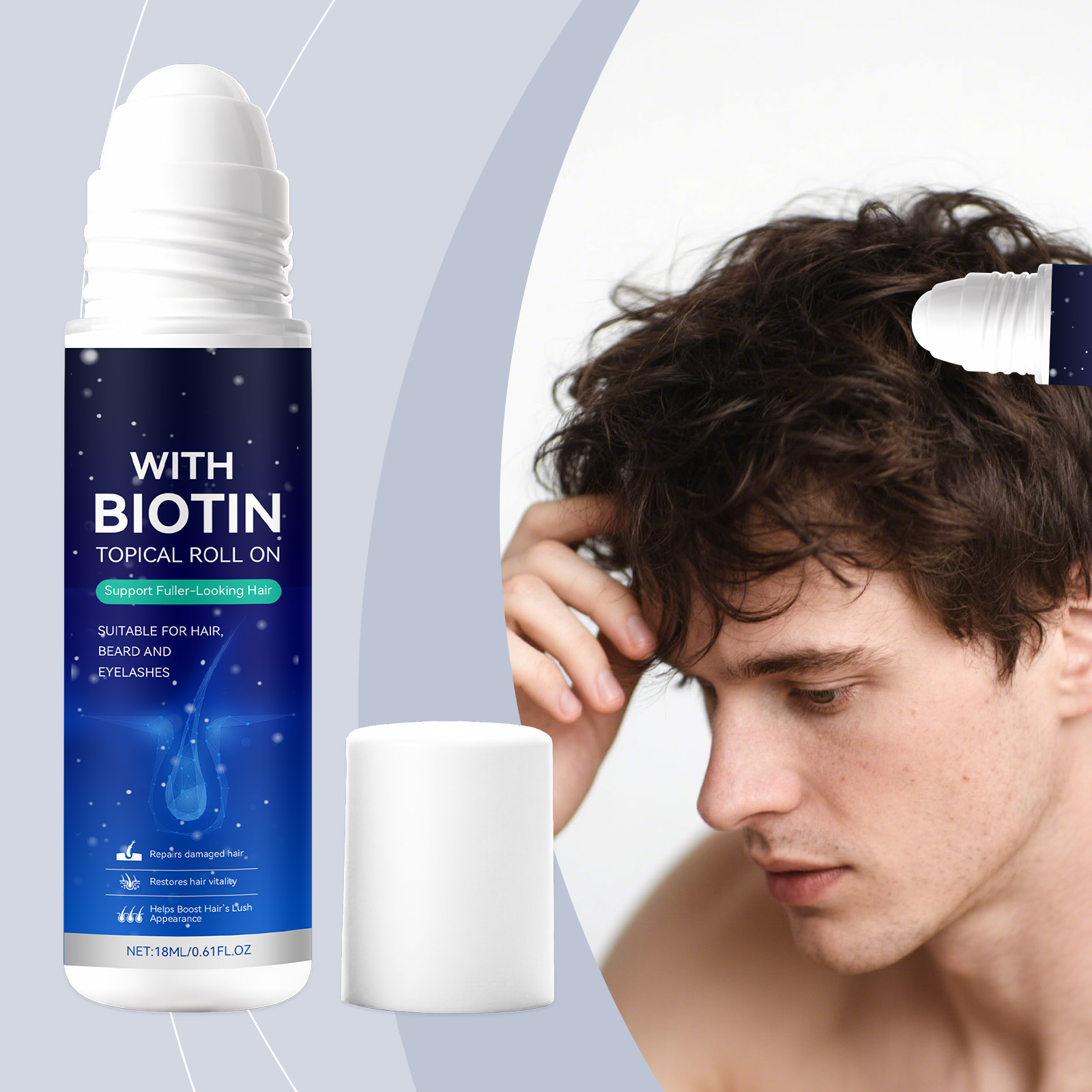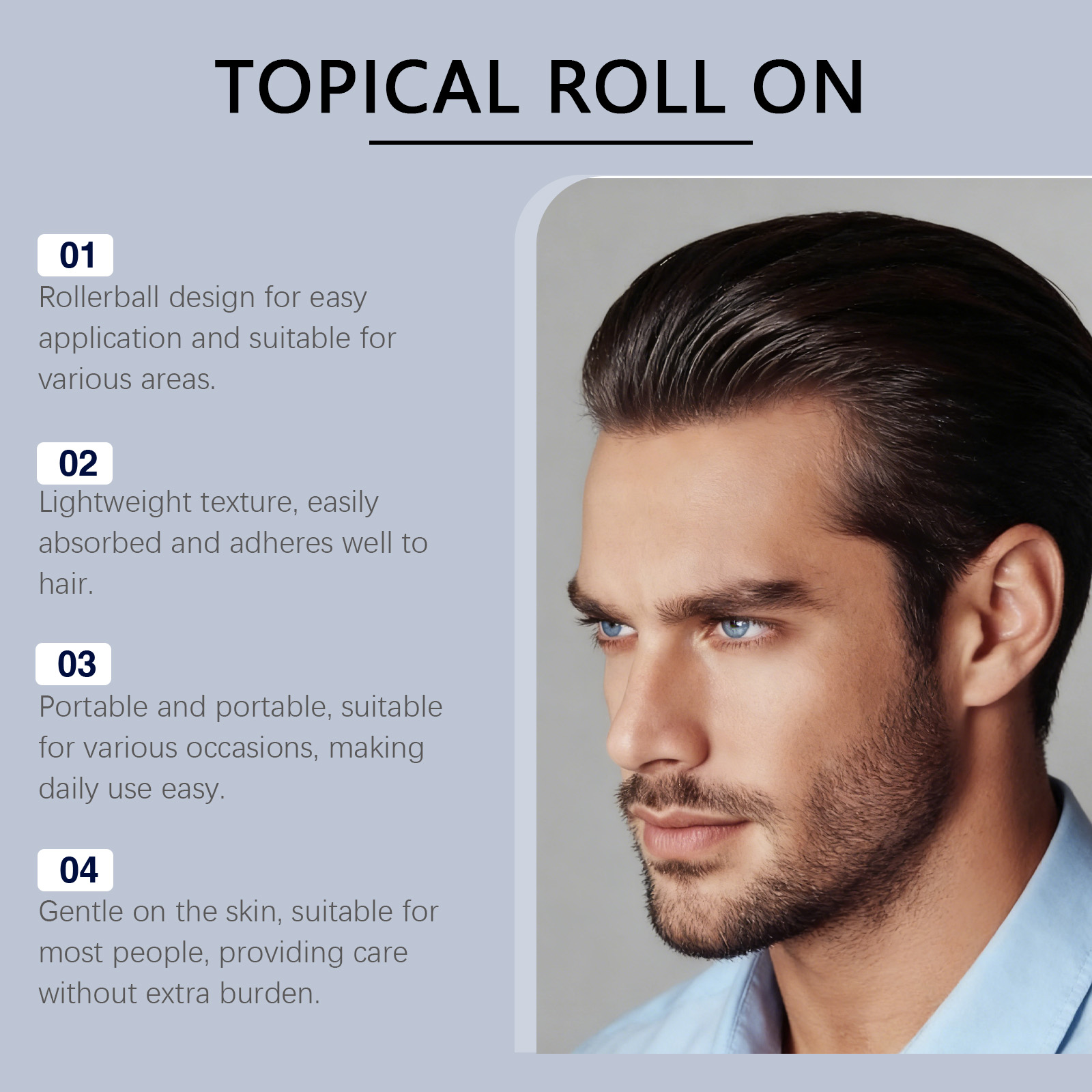我们的男士护发滚珠,由侧柏叶提取物、迷迭香叶油精心调配而成。专为增加头发顺滑度并提升使用后的舒适感设计。使用方法极为便捷:1.清洁并擦干头皮。2.打开瓶盖,将产品轻轻滚涂于头皮上。3.让其吸收。并且能轻松附着于头发,留下清爽不粘腻的感觉。