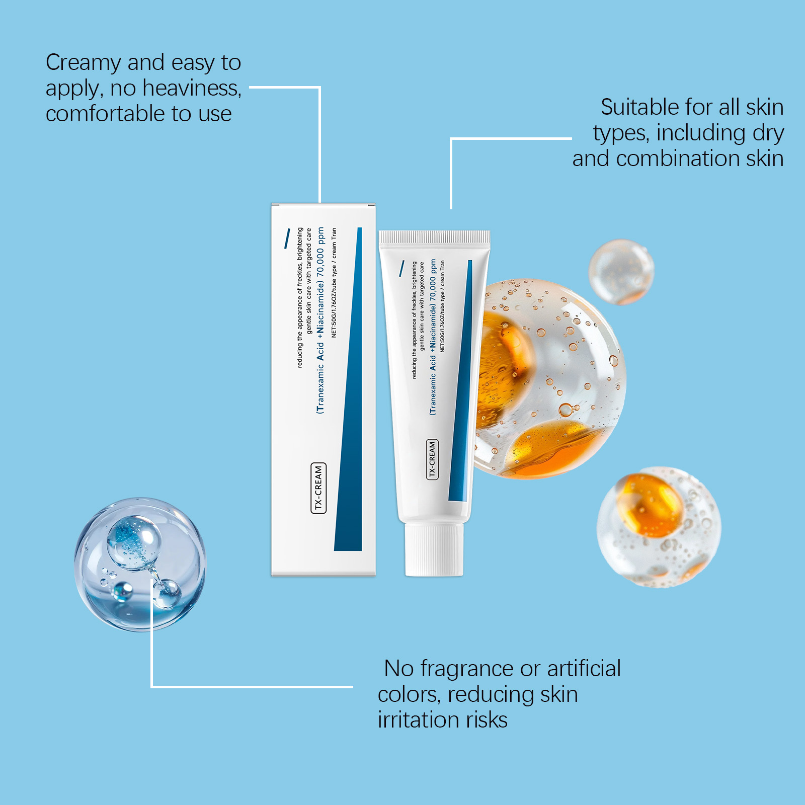 我们的面部保湿霜 ,由烟酰胺、凝血酸精心调配而成。专为改善肤色不均,打造通透肌肤设计。使用方法极为便捷:1.彻底清洁并擦干皮肤。2.取适量均匀涂抹于面部。3.轻柔按摩,以促进最佳吸收。并且可以提升肌肤光泽,呈现明亮健康的外观。