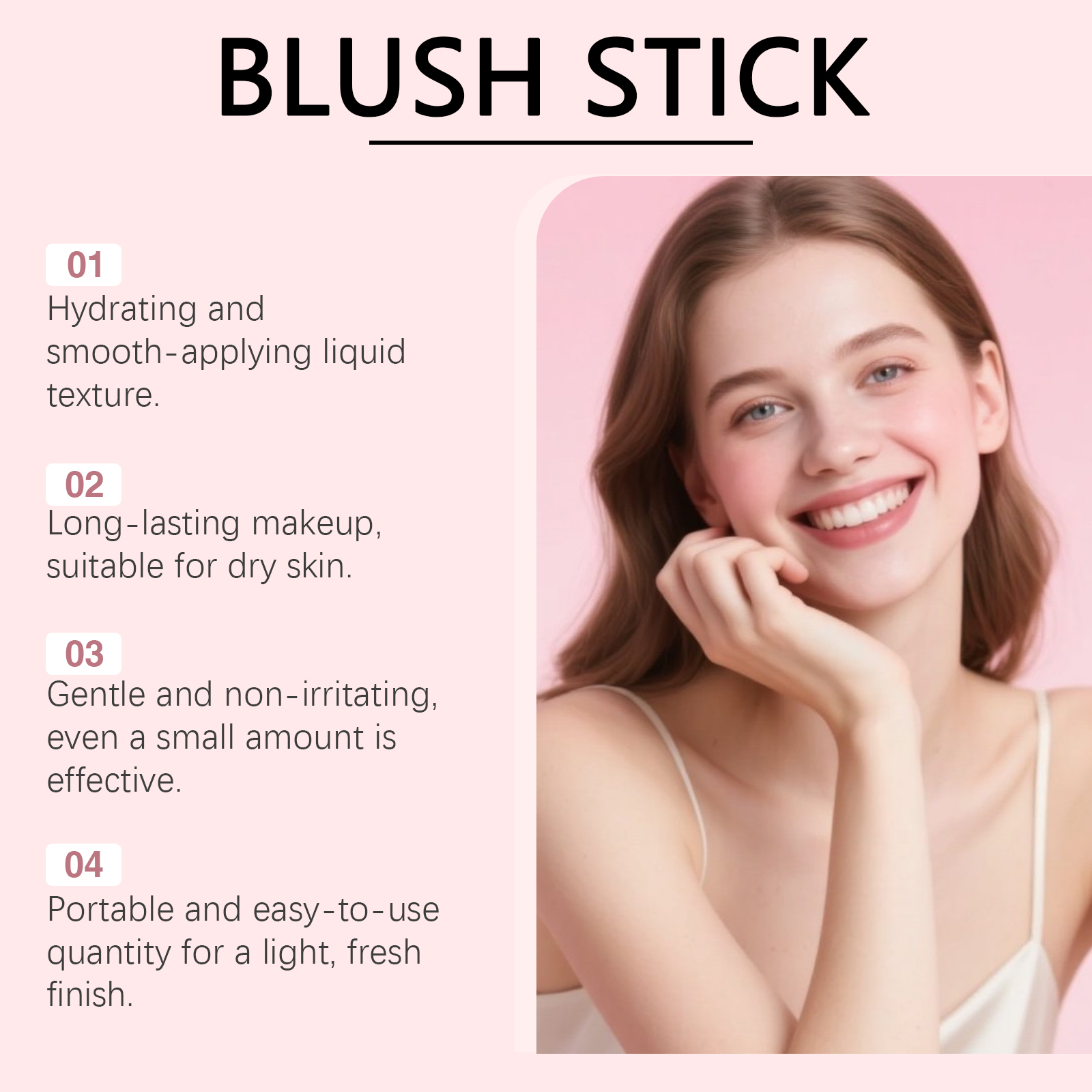 我们的柔雾持妆腮红棒(Dushy Rose),由矿油、蜂蜡精心调配而成。专为滋润脸颊肌肤,保持水润外观并减少皱纹设计。使用方法极为便捷:底妆完成后,打开盖子,旋转出适量膏体,少量多次叠加于脸上,用指腹或粉扑轻轻拍开。并且它上妆后迅速形成一层薄膜即使叠加散粉也不会产生堆积感。