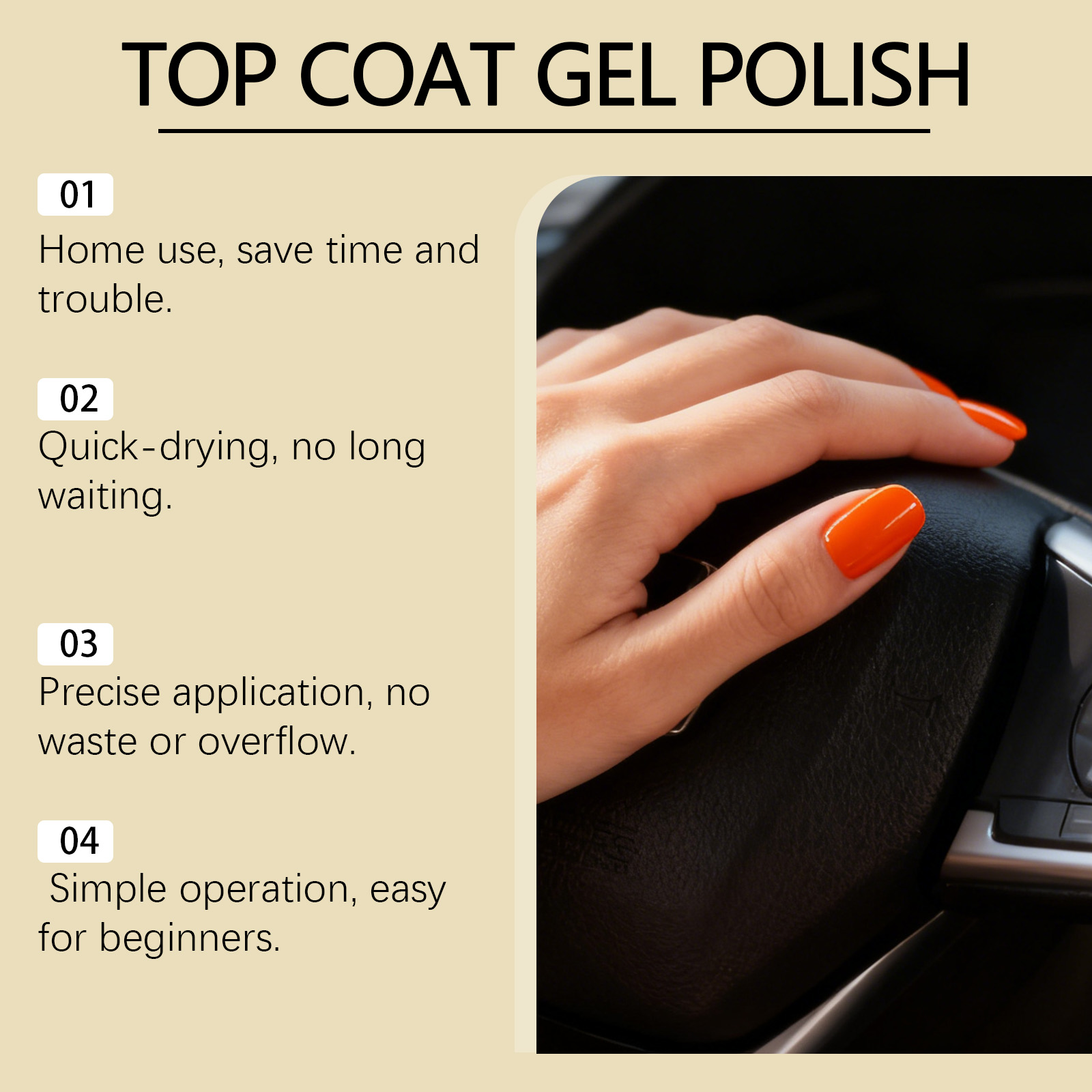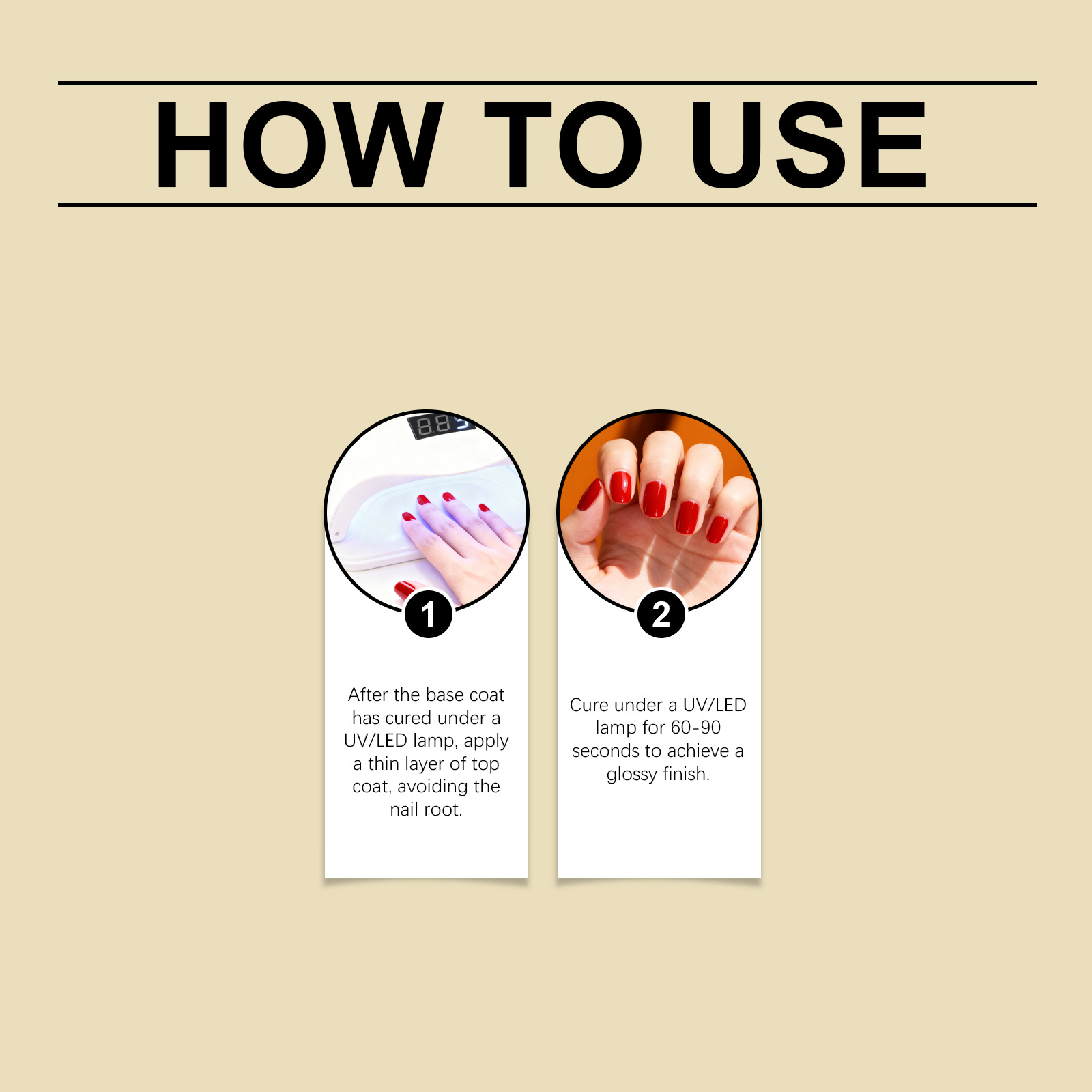 我们的美甲封层亮油,由乙酸乙酯、乙酸丁酯精心调配而成。专为形成保护膜以增强附着力,滋润指甲表面以提供舒适感设计。使用方法极为便捷:在底漆在紫外线/LED 灯照射下完全固化后,涂抹一层薄薄的面漆,但要避开指甲根部。在紫外线/LED 灯下照射 60 至 90 秒,即可达到光滑的表面效果。并且无需前往沙龙,居家打造精致美甲,几秒钟内完成,无需长时间等待。