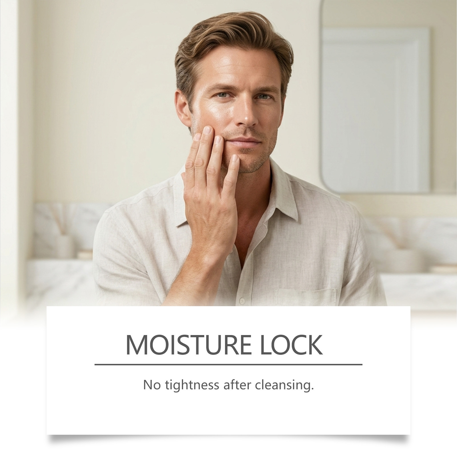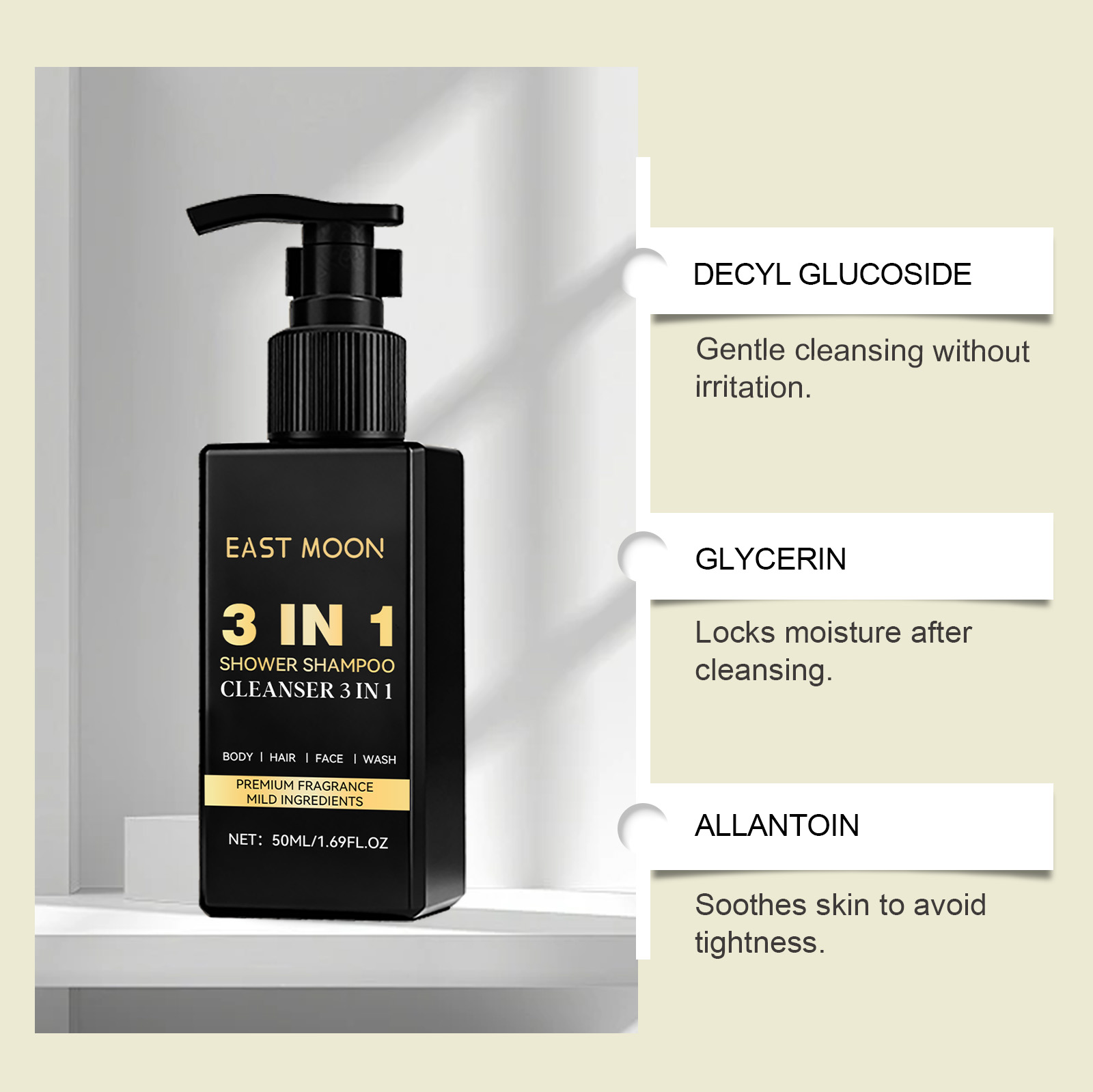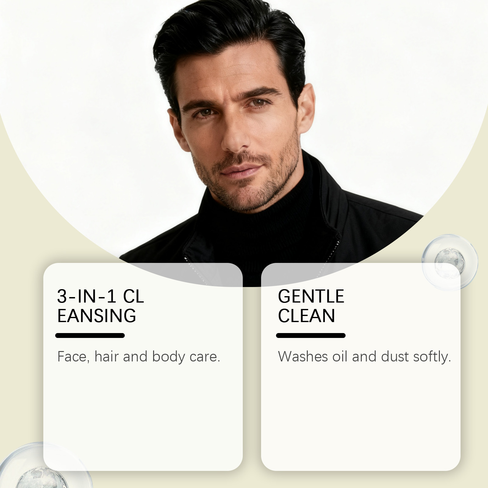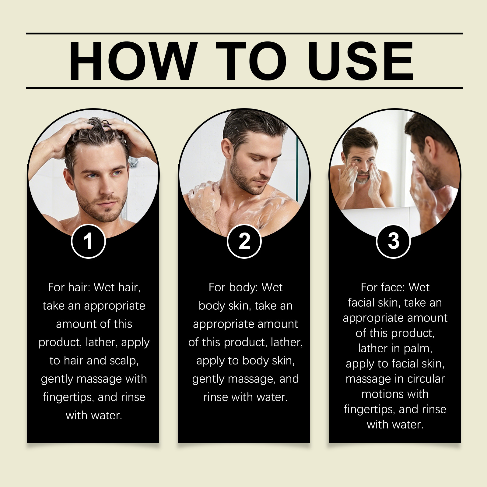 我们的男士三合一洁面乳,由羟丙基甲基纤维素、尿囊素精心调配而成。专为温和清洁油脂和灰尘设计。使用方法极为便捷:用于头发:打湿头发,取适量本品起泡,涂抹于头发和头皮,用指尖轻柔按摩,再用水冲洗干净。用于身体:湿润皮肤,取适量本品起泡,涂抹于身体肌肤,轻柔按摩后用水冲洗。用于面部:湿润面部皮肤,取适量本品于掌心揉搓起泡,涂抹于面部肌肤,用指尖以打圈方式按摩,再用水冲洗干净。并且清洁后可以锁住水分。