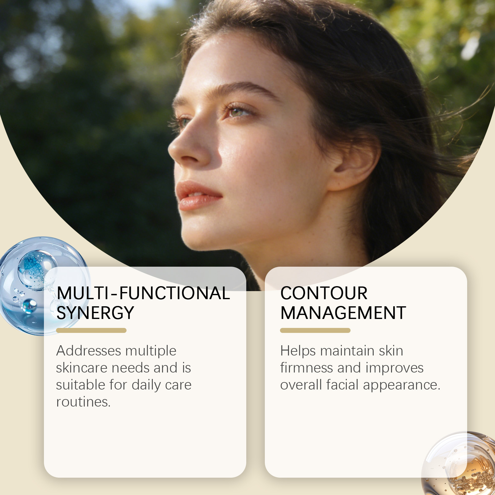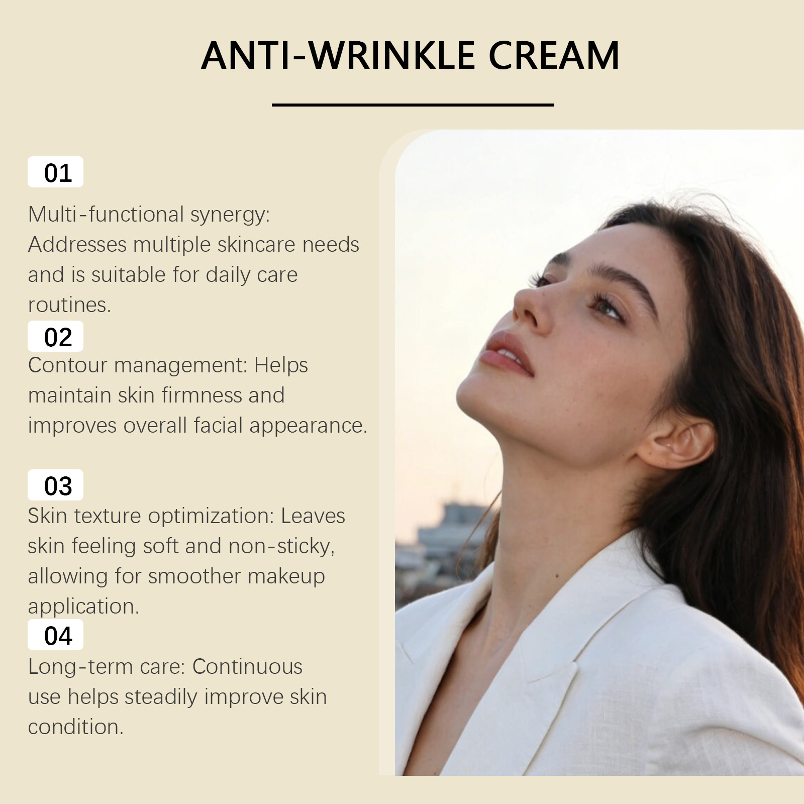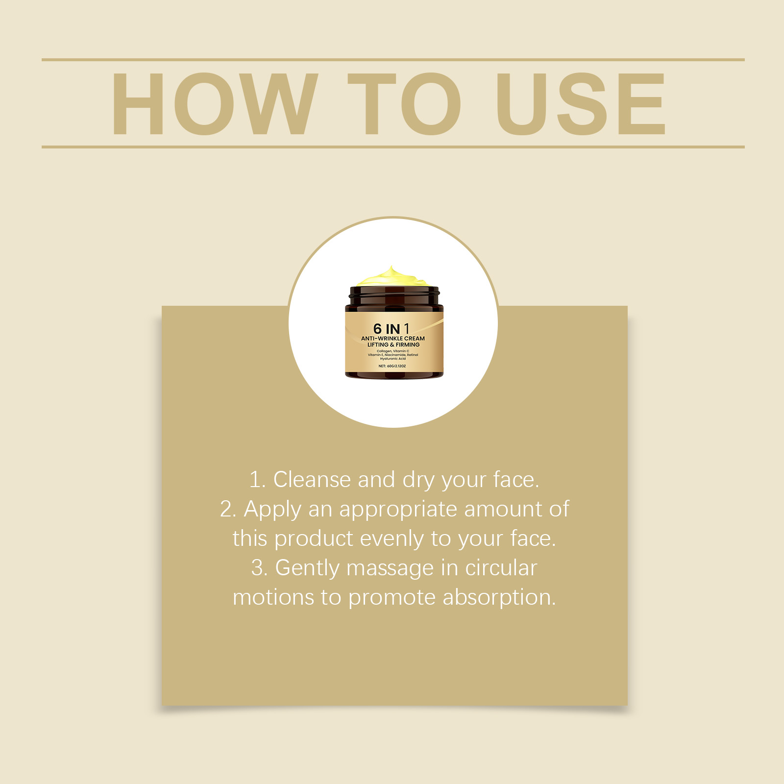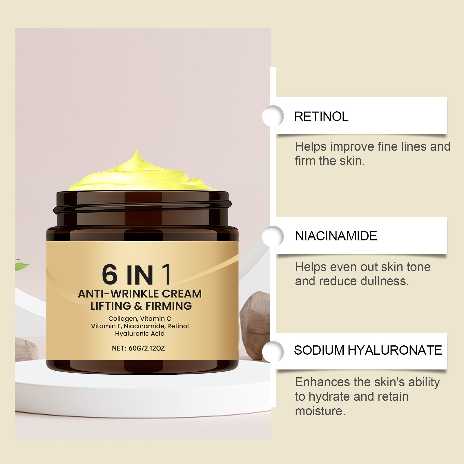 我们的六合一保湿面霜,由烟酰胺、生育酚(维生素 E)精心调配而成。专为维持皮肤紧致度并改善整体面部外观设计。使用方法极为便捷:1.清洁并擦干面部。2.将适量本品均匀涂抹于面部。3.以打圈方式轻柔按摩,促进吸收。并且可以使皮肤感觉柔软且不粘腻,便于更顺滑地上妆。