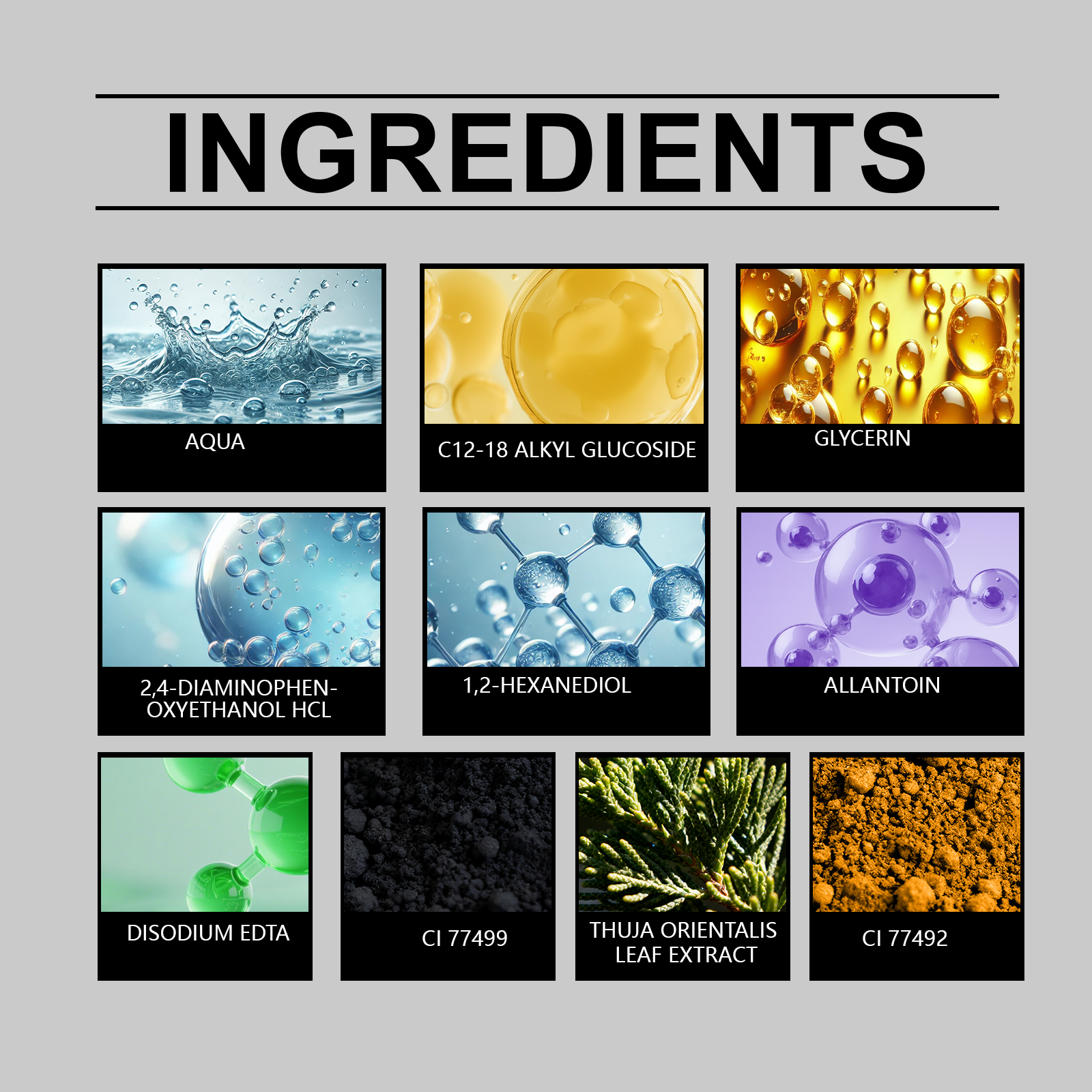 我们的咖啡色植物美发剂,由C12-18烷基葡糖苷、甘油精心调配而成。专为保持鲜艳的色泽,让头发柔软不卷曲设计。使用方法极为便捷:【染发前测试】使用前请务必进行皮肤敏感性测试。如果出现发红、肿胀、瘙痒或烧灼感等症状,请立即停止使用并洗掉残留的产品。【指示】1. 使用前确保头发干燥。2、操作时穿戴好防护用品,在面部、颈部、耳后、手臂等可能接触皮肤的部位涂抹面霜。3.将染发剂均匀涂抹在头发上,确保覆盖每一根发丝,等待30分钟让染料完全渗透头发。4. 用温水彻底冲洗头发,直至水流清澈。并且它可以精确均匀地隐藏白发。
