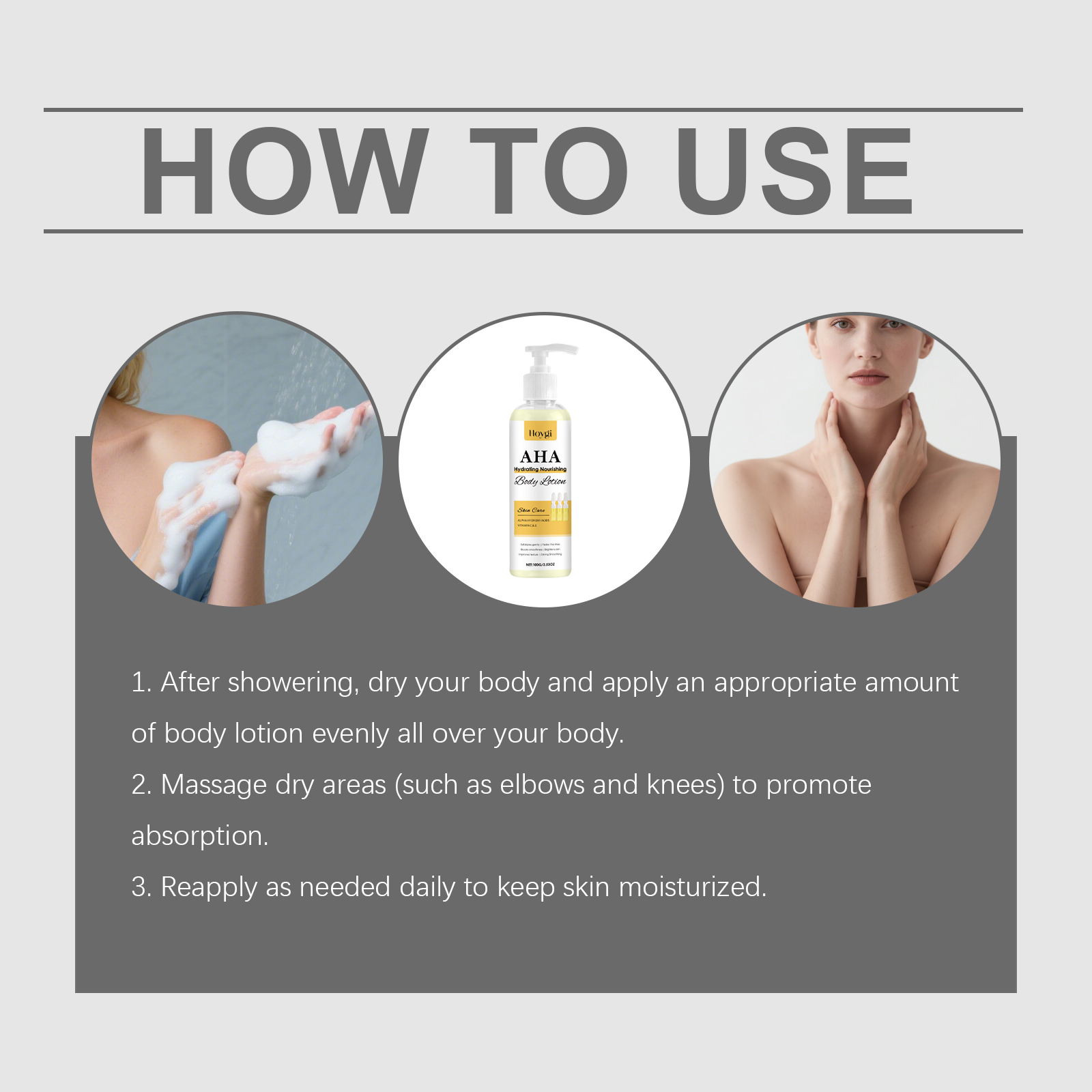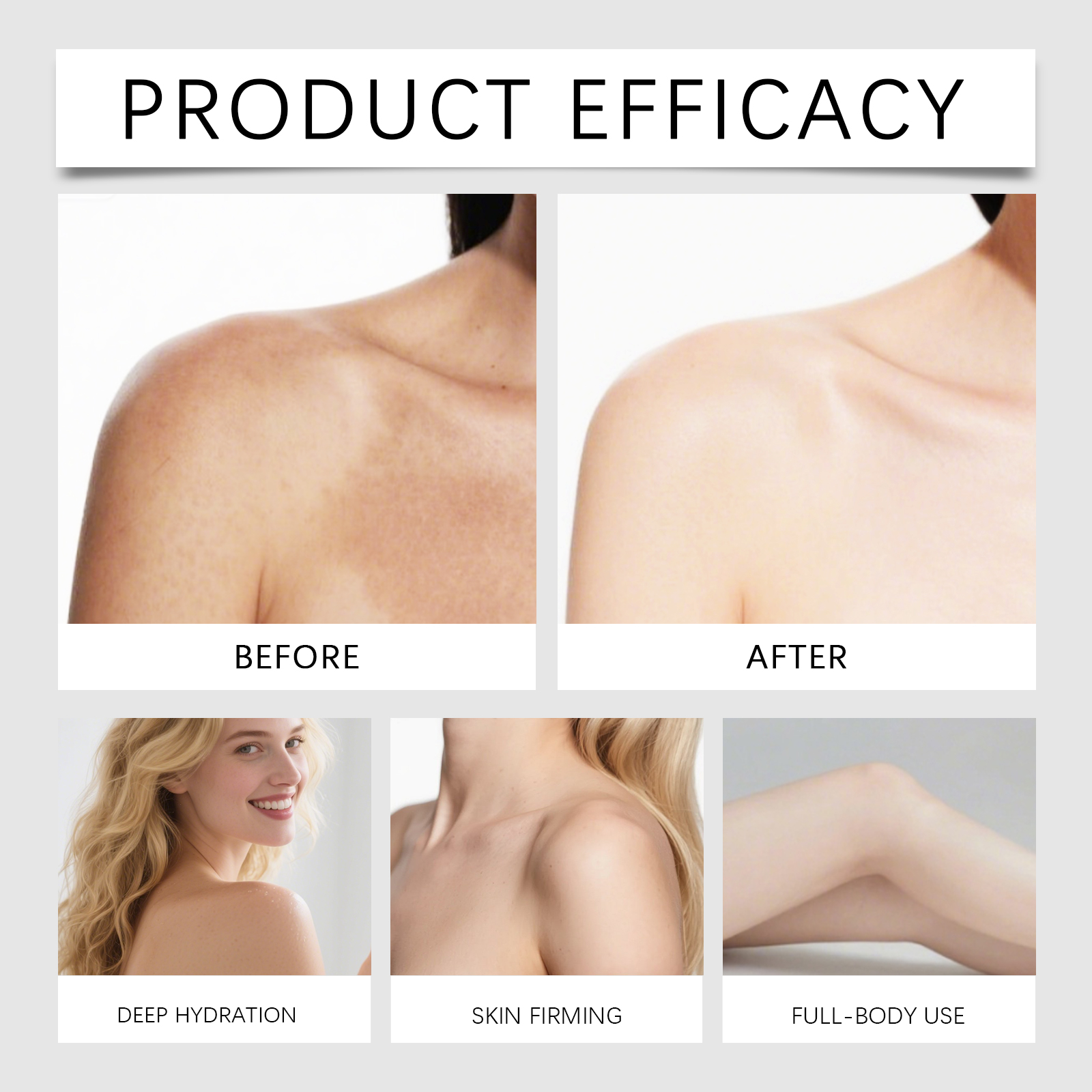 我们的保湿身体乳,由抗坏血酸(维生素C)、生育酚(维生素E)精心调配而成。专为彻底滋润皮肤设计。使用方法极为便捷:1.洗澡后,擦干身体,并在全身均匀涂抹适量的身体乳液。2.按摩干燥部位(如肘部和膝盖),以促进吸收。3.根据需要每日重复涂抹,以保持皮肤湿润。并且可以提升紧致度和弹性。