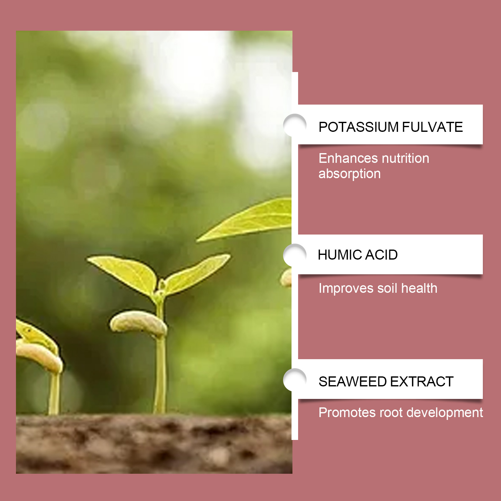 我们的植物生根粉,由黄腐酸钾、膨润土精心调配而成。专为提升生长速率,支持稳健系统设计。使用方法极为便捷:将本产品用水稀释,每3-5升水中加入10克。在作物生长期间每隔10天施用一次。10克大约足够覆盖10平方米的面积。可根据需要调整用量。并且它可以满足种植需求,专为植物根系发育和生长而配制。