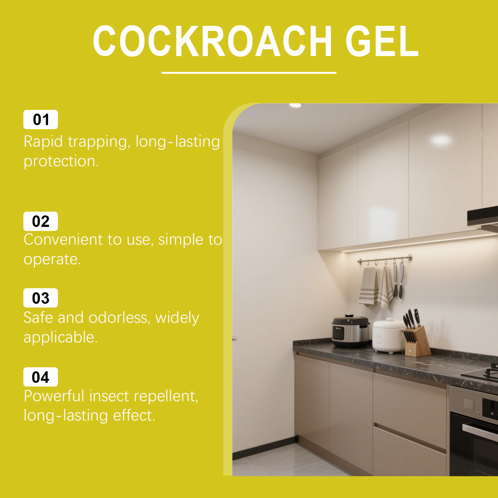 我们的蟑螂凝胶饵剂,由香柠檬果油、姜根油精心调配而成。专为蟑螂设计的活性成分,可快速杀死蟑螂且不留任何残留。使用方法极为便捷:将凝胶挤到一张纸上,并将其放置在蟑螂经常出没的区域。并且采用温和配方,适用于家庭、办公室及其他场所。