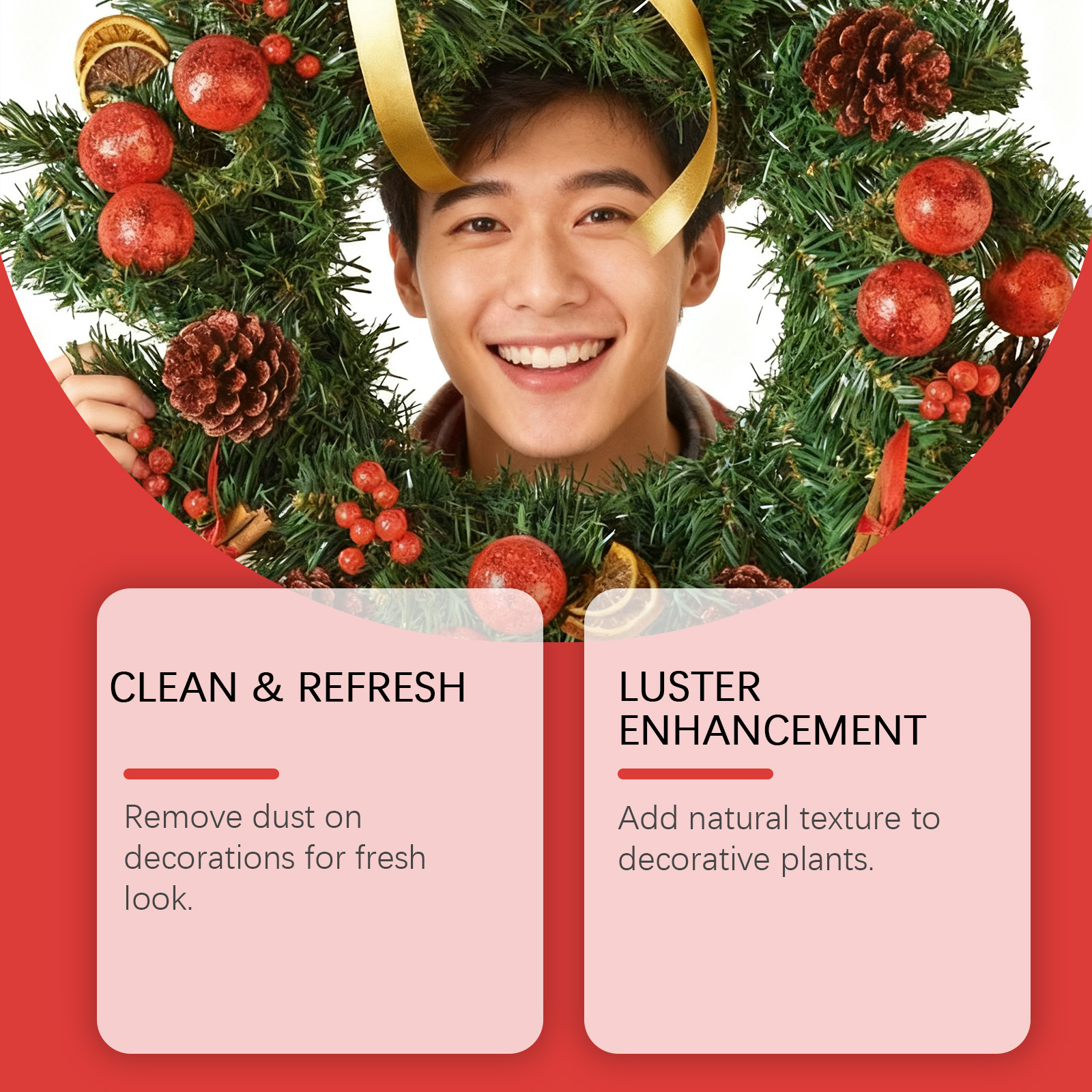 我们的仿真植物光泽喷雾,由聚乙烯蜡乳液, 1,2-己二醇精心调配而成。专为清除装饰品上的灰尘,保持清新外观设计。使用方法极为便捷:轻轻摇晃喷雾瓶,均匀喷洒于人造植物、花环或装饰绿植上。静置片刻,让清洁剂自然去除灰尘和污垢。轻轻摇晃喷雾瓶,均匀喷洒于人造植物、花环或装饰绿植上。并且可以为装饰植物添加自然纹理。