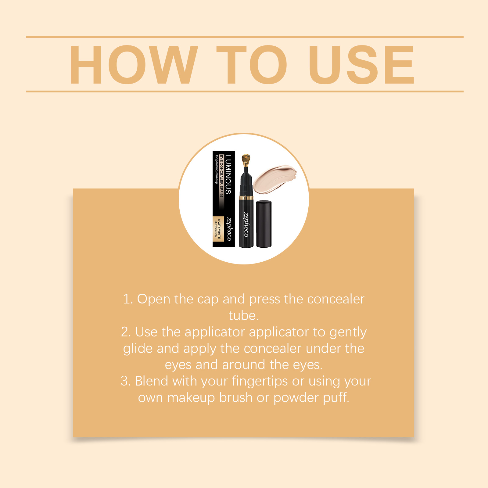 我们的象牙白眼部遮瑕膏,由丙二醇、矿油精心调配而成。专为明显增强皮肤光泽,有效隐藏面部感染设计。使用方法极为便捷:1. 打开盖子,按压遮瑕膏管。2. 使用涂抹棒轻轻涂抹于眼下及眼周。3. 用指腹或您自己的化妆刷或粉扑晕开。并且它可以创造光滑的皮肤外观。