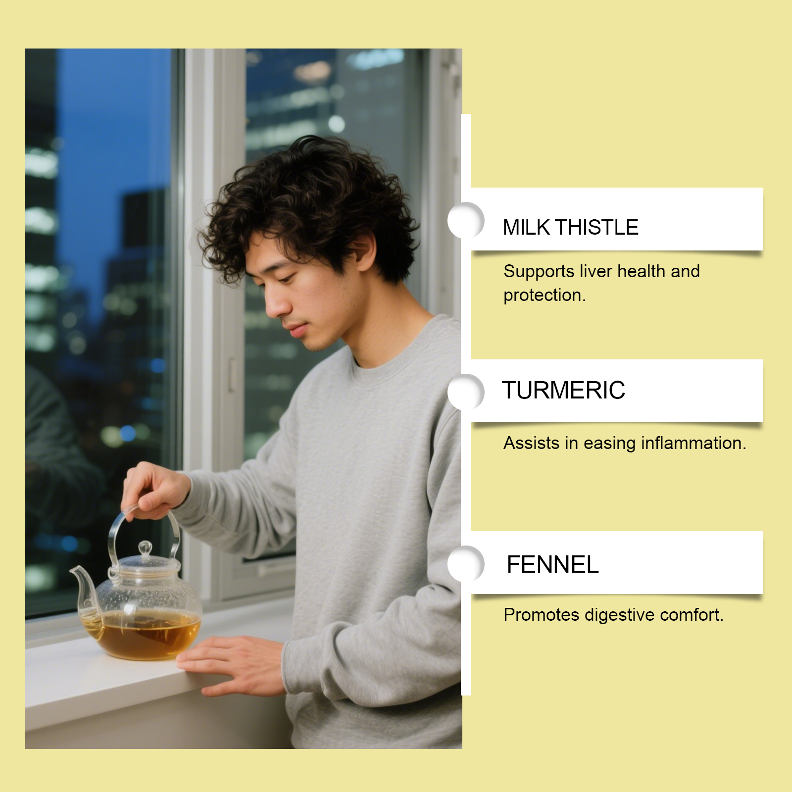 我们的草本茶,由水飞蓟、姜黄精心调配而成。专为提升日常能量水平,促进舒适的消化设计。使用方法极为便捷:1.打开包装袋,将茶包放入杯中。2.将水煮至约90°C,倒入杯中浸泡茶包。3.静置浸泡3-5分钟,尽情享受香醇茶饮。并且它可以辅助维持内部平衡。