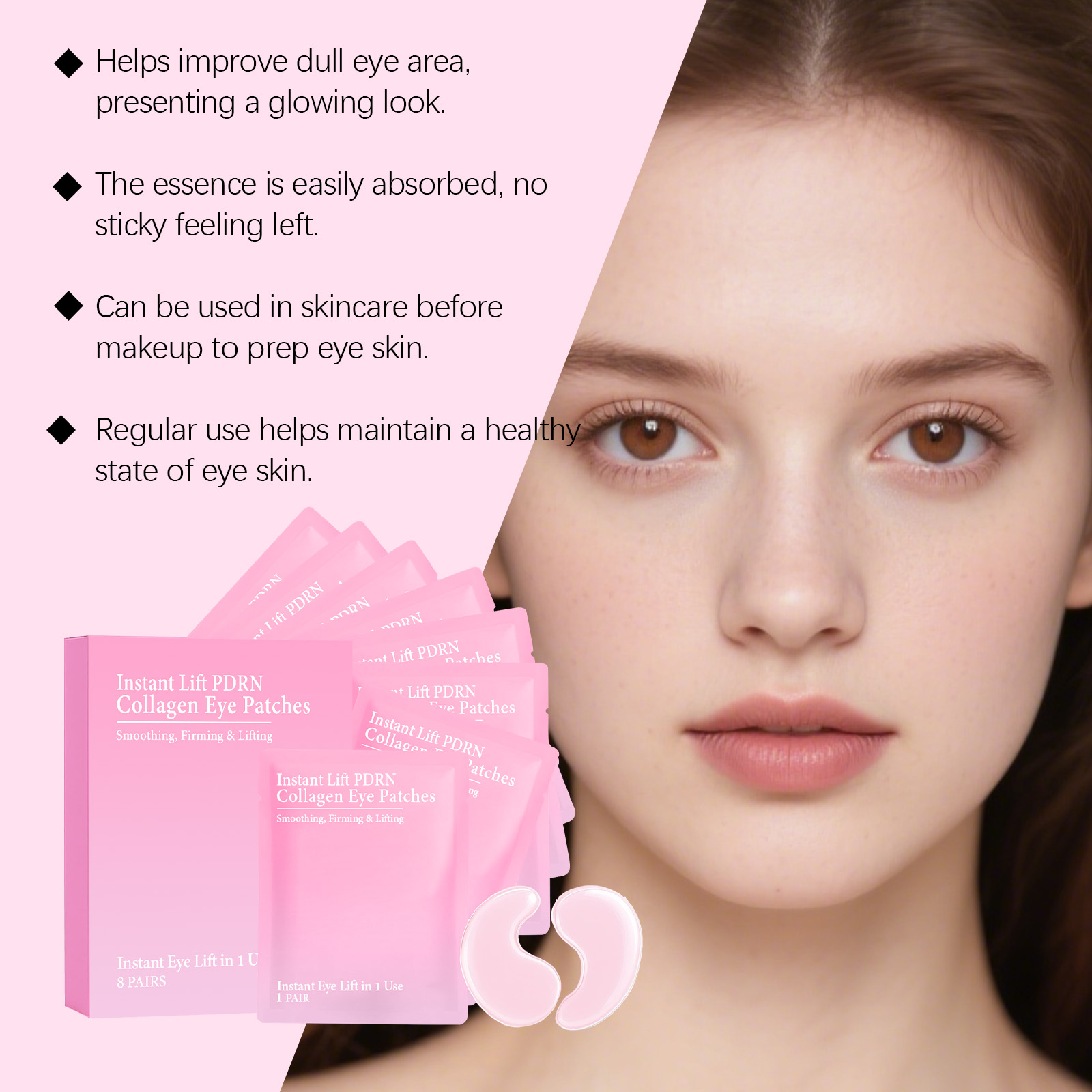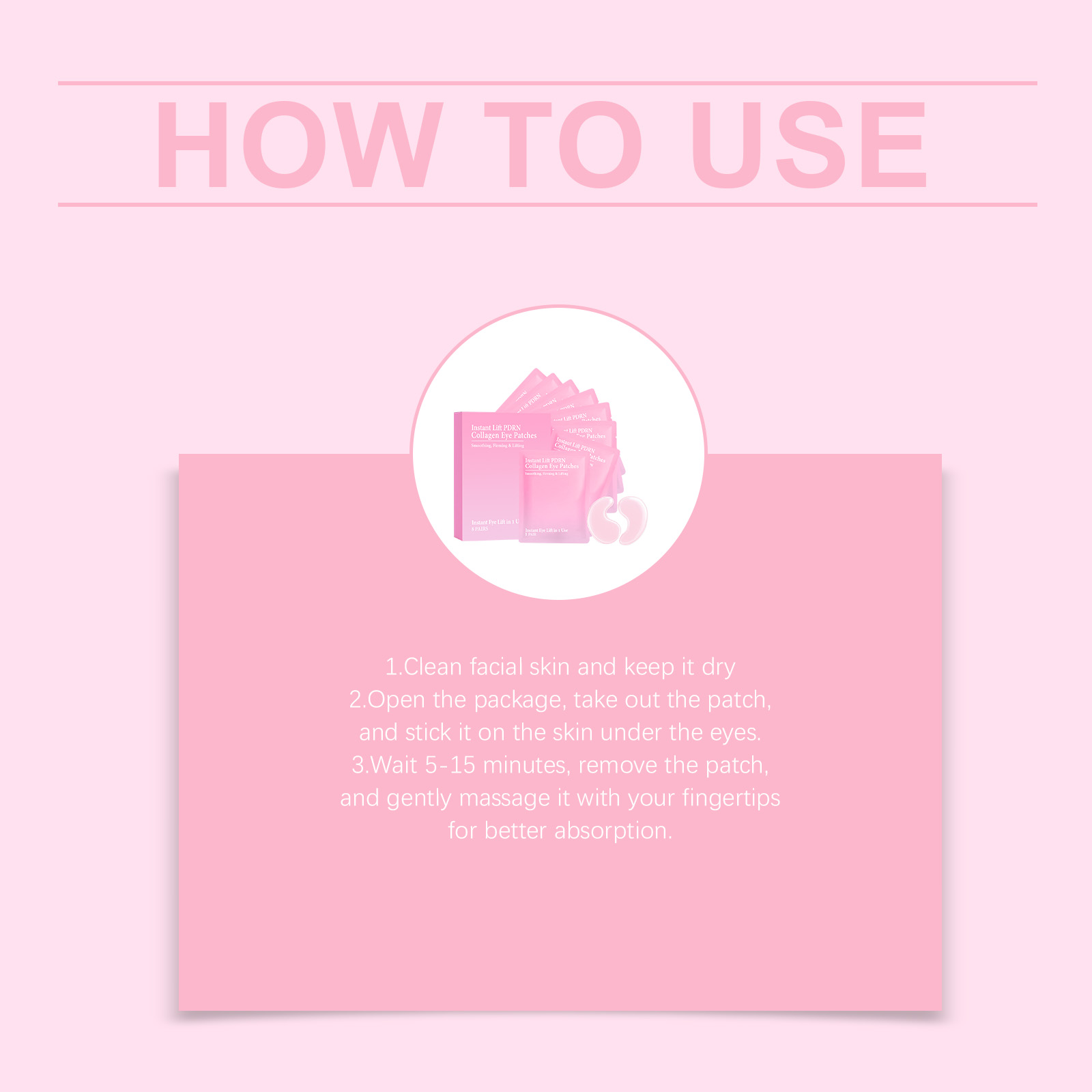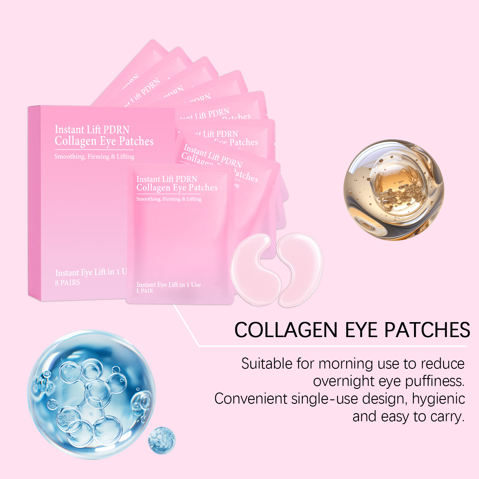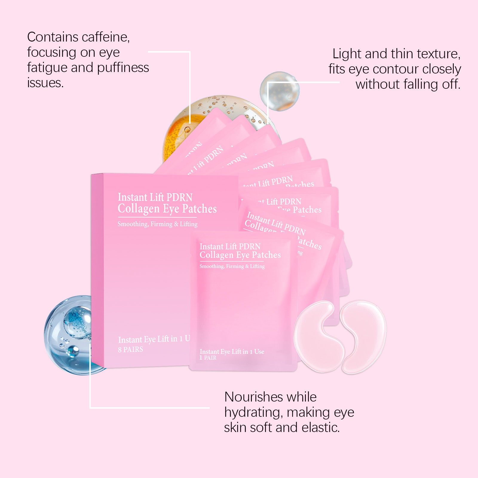 我们的胶原蛋白眼膜,由甘油、海藻酸精心调配而成。专为为疲惫的眼睛注入活力恢复明亮,针对眼部浮肿,打造紧致眼周轮廓设计。使用方法极为便捷:1.清洁面部肌肤并保持干燥。2.打开包装,取出眼膜,贴于眼下肌肤。3.等待5-15分钟后取下眼膜,用指腹轻轻按摩至吸收。并且它可以为娇嫩的眼部肌肤提供持久保湿。