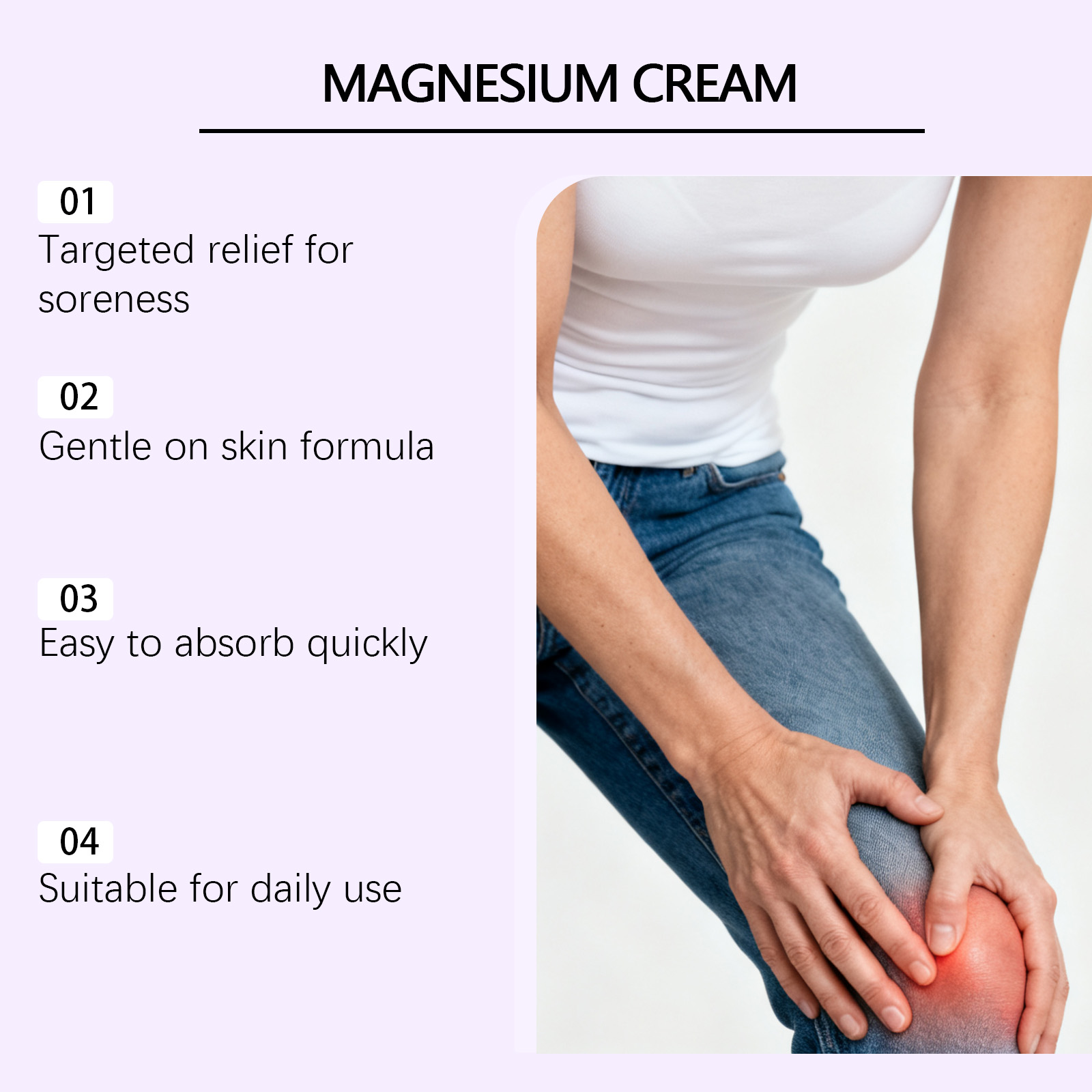 我们的关节护理霜,由氯化镁、薰衣草花提取物精心调配而成。专为酸痛的关节提供舒适感设计。使用方法极为便捷:清洁并擦干皮肤,取适量本品涂抹于患处关节,并按摩至吸收。并且可以辅助关节顺畅运动。