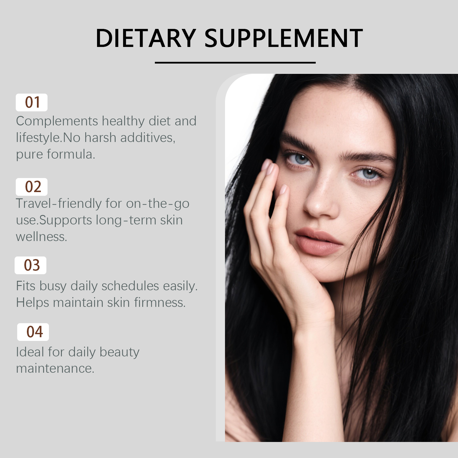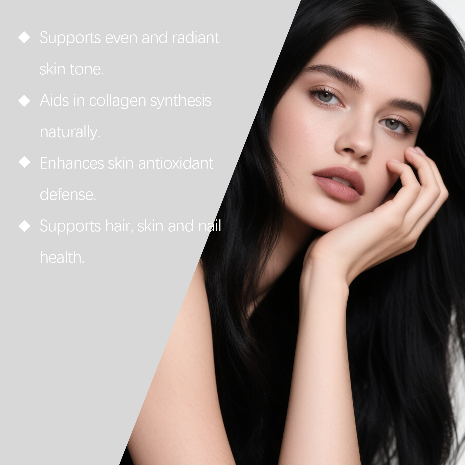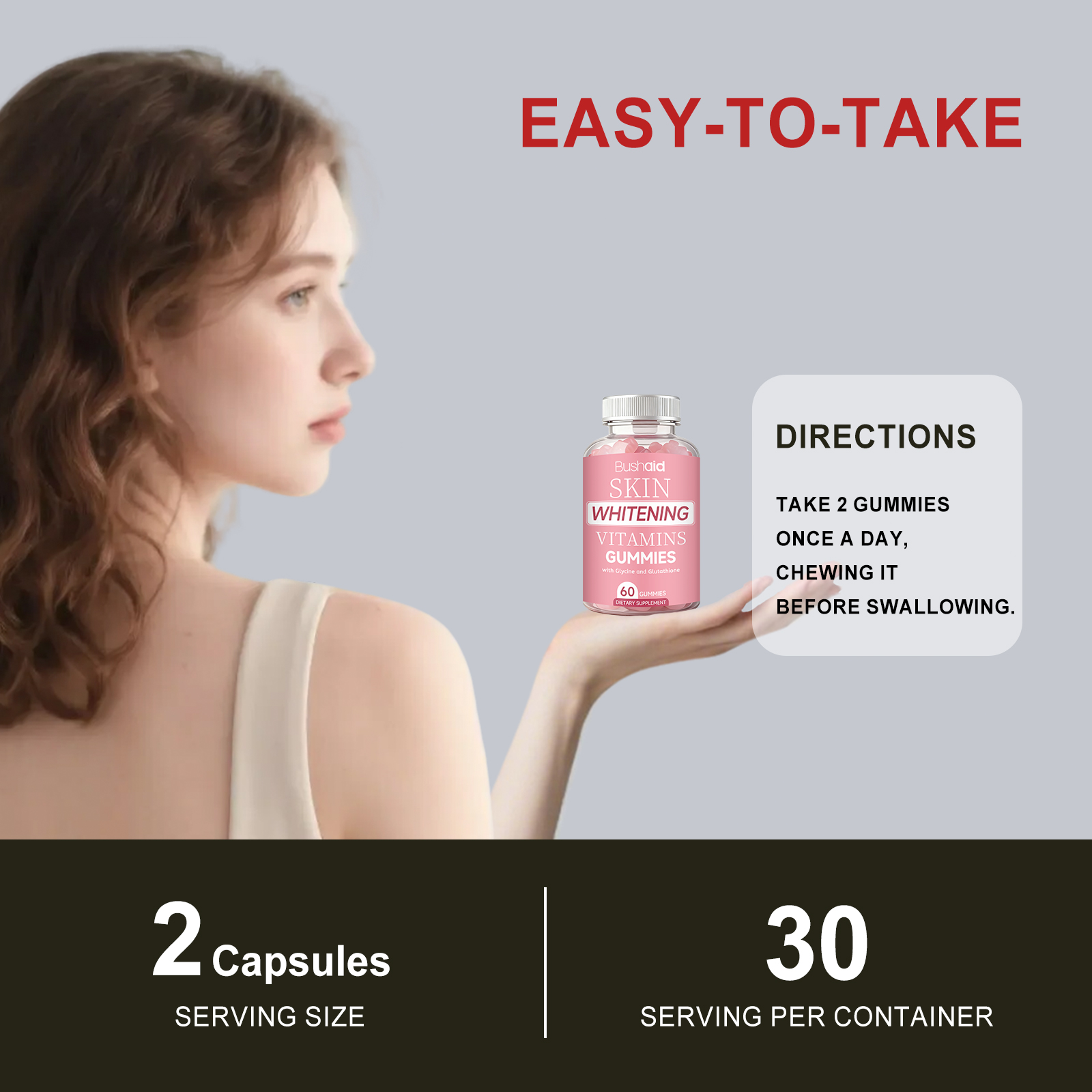 我们的亮泽维他命软糖,由维生素C(抗坏血酸)、生物素精心调配而成。专为支持均匀焕亮肤色,自然助力胶原蛋白合成设计。使用方法极为便捷:每日服用2颗软糖,服用前先咀嚼,然后吞咽。并且它可以增强肌肤抗氧化防御,支持头发、皮肤和指甲健康。