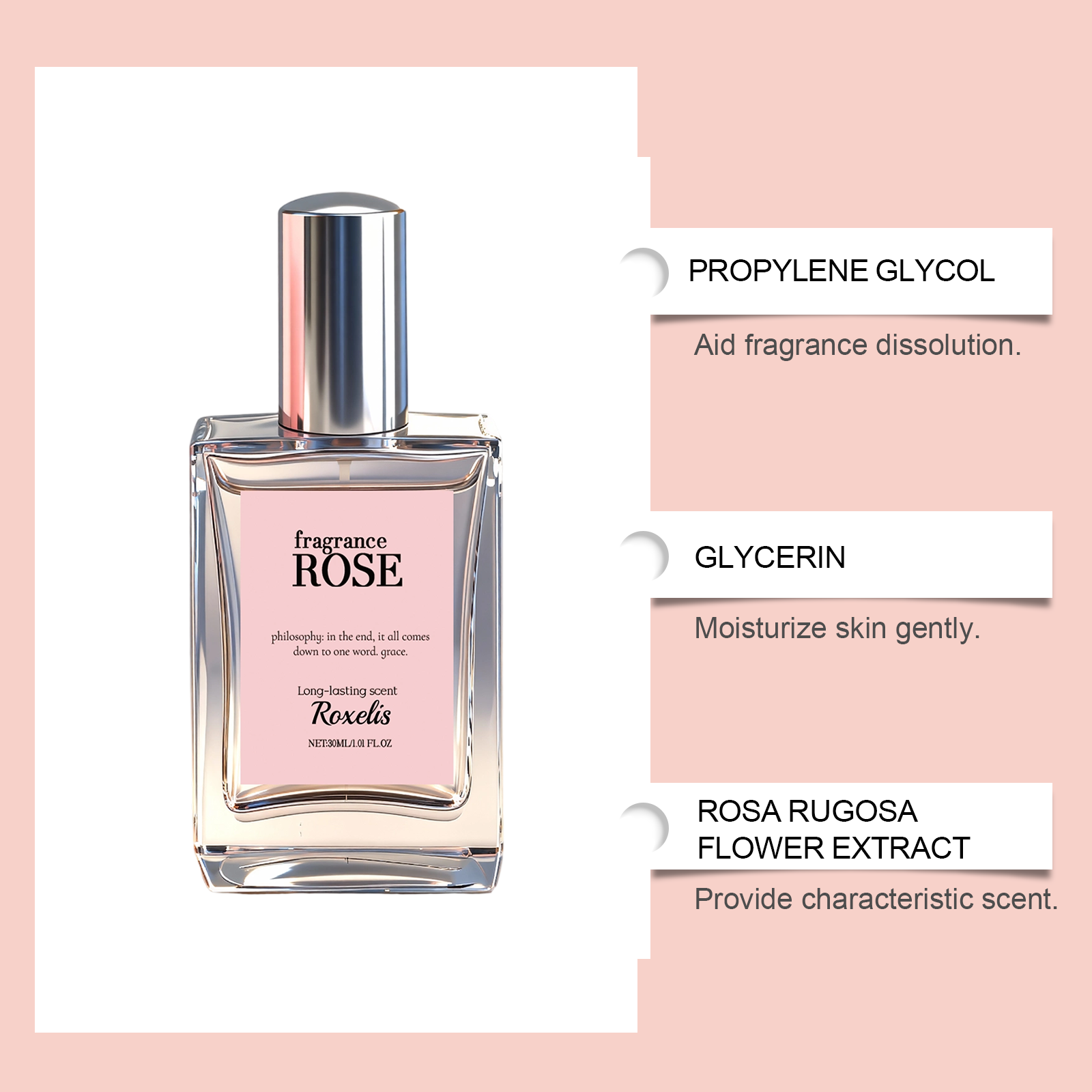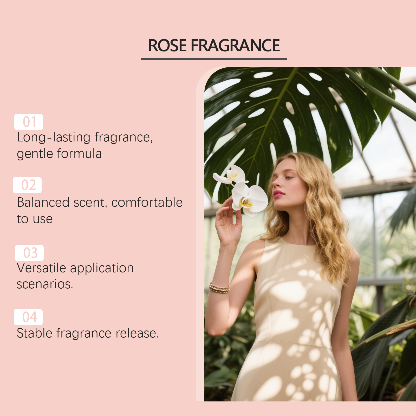 我们的玫瑰柔息淡香水,由丙二醇、甘油精心调配而成。专为温和的皮肤香味,清新的香味体验,平衡的香味释放设计。使用方法极为便捷:将香水喷洒在头发、手腕、颈部和耳后等部位或是可以将香水喷雾喷洒在空中再走进香雾中,让香水喷雾均匀地弥漫全身,留下芳香。并且它可以保持香味数小时。