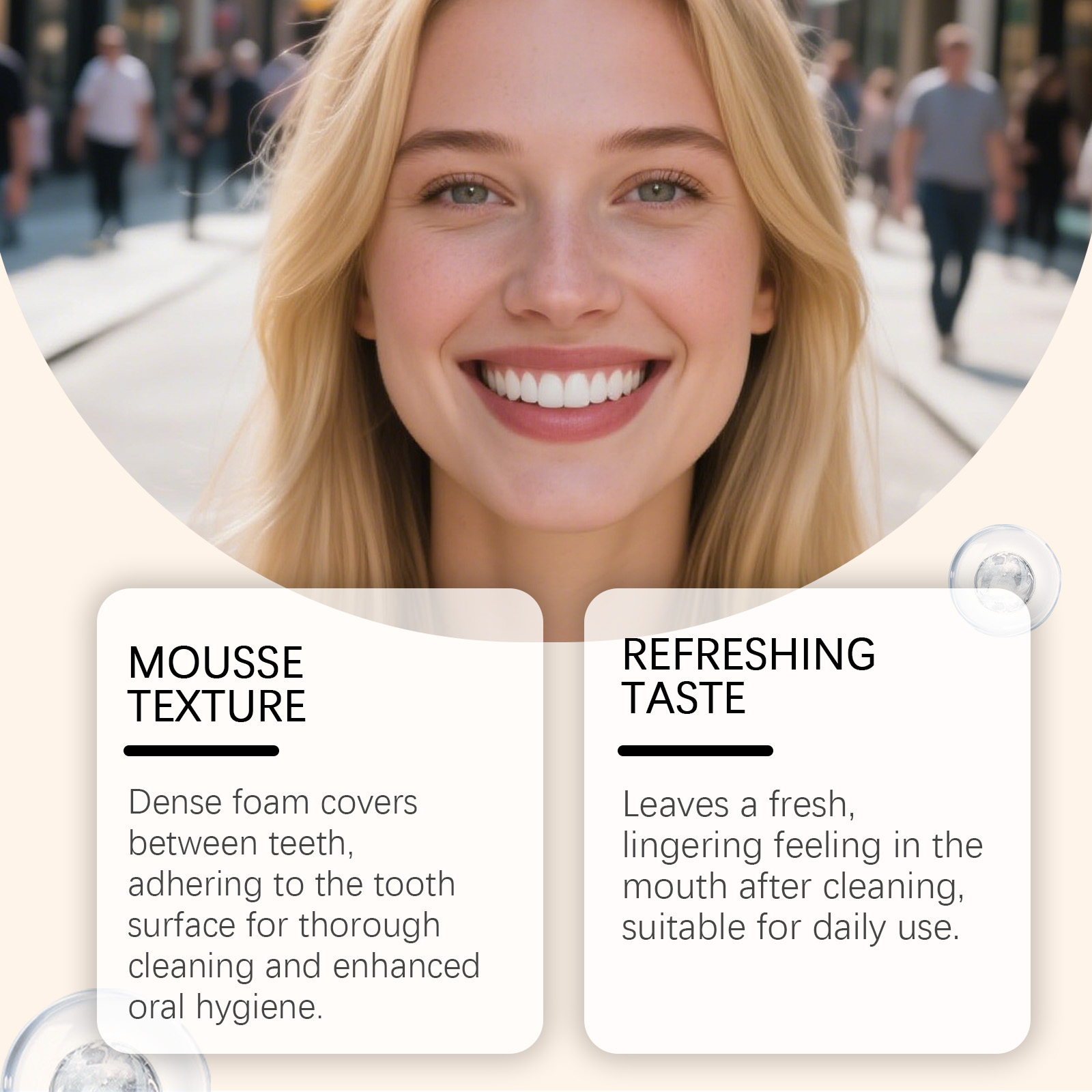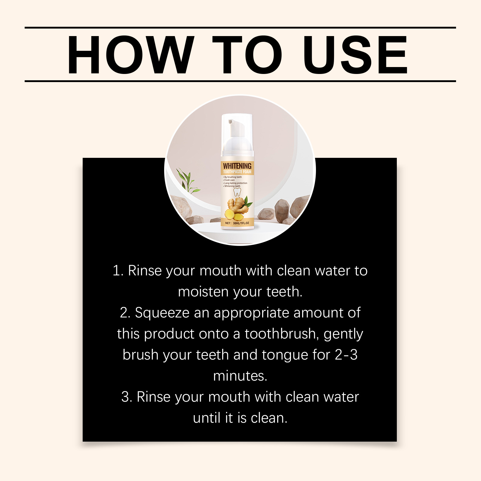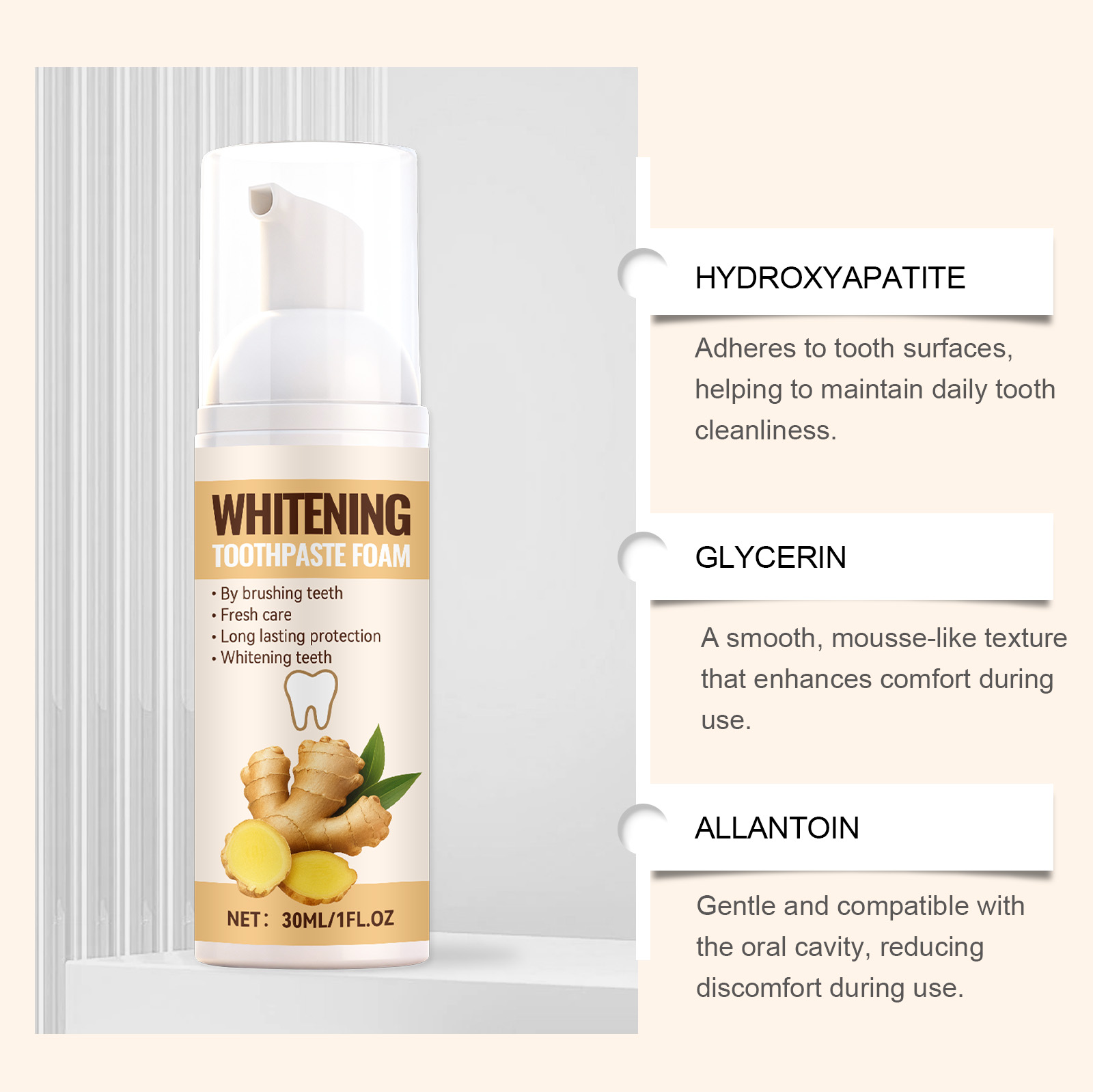 我们的生姜洁牙慕斯,由尿囊素、薄荷醇精心调配而成。专为保持日常牙齿清洁设计。使用方法极为便捷:1.用清水漱口,以湿润牙齿。2.将适量本产品挤在牙刷上,轻轻刷洗牙齿和舌头2-3分钟。3.用清水漱口直至口腔干净。并且它是一种光滑、慕斯般的质地,使用时能提升舒适感。