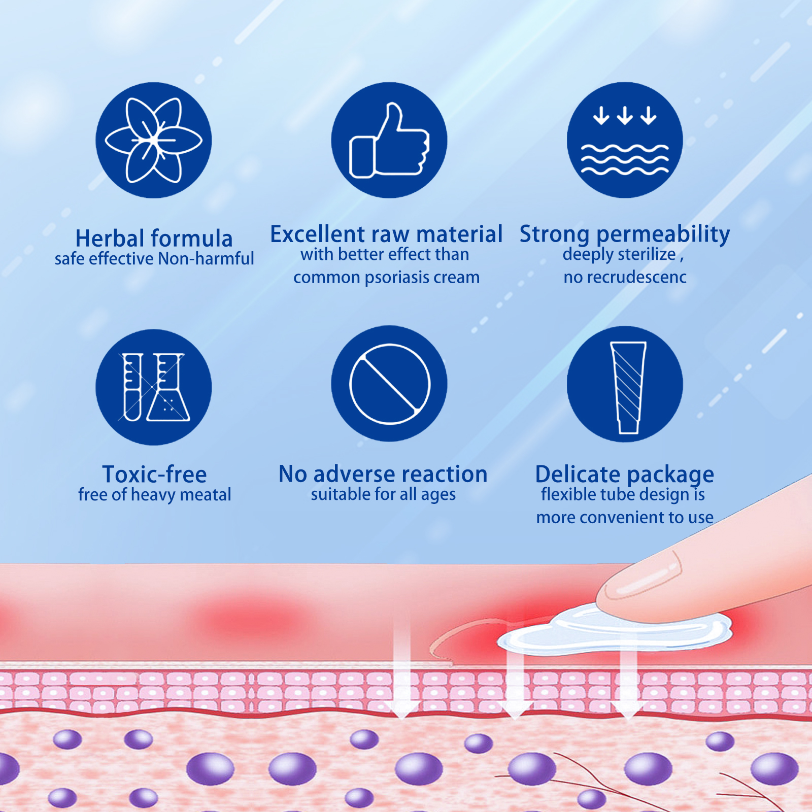 我们的皮肤护理膏含有矿物油、硬脂酸甘油酯。它可以即刻止痒,深度穿透,针对性恢复皮肤,拒绝重复。它的使用方法很简单:外用时,将本品涂抹于患处,每天2-3次。并且可以护理干痒骚痒皮癣痱子。