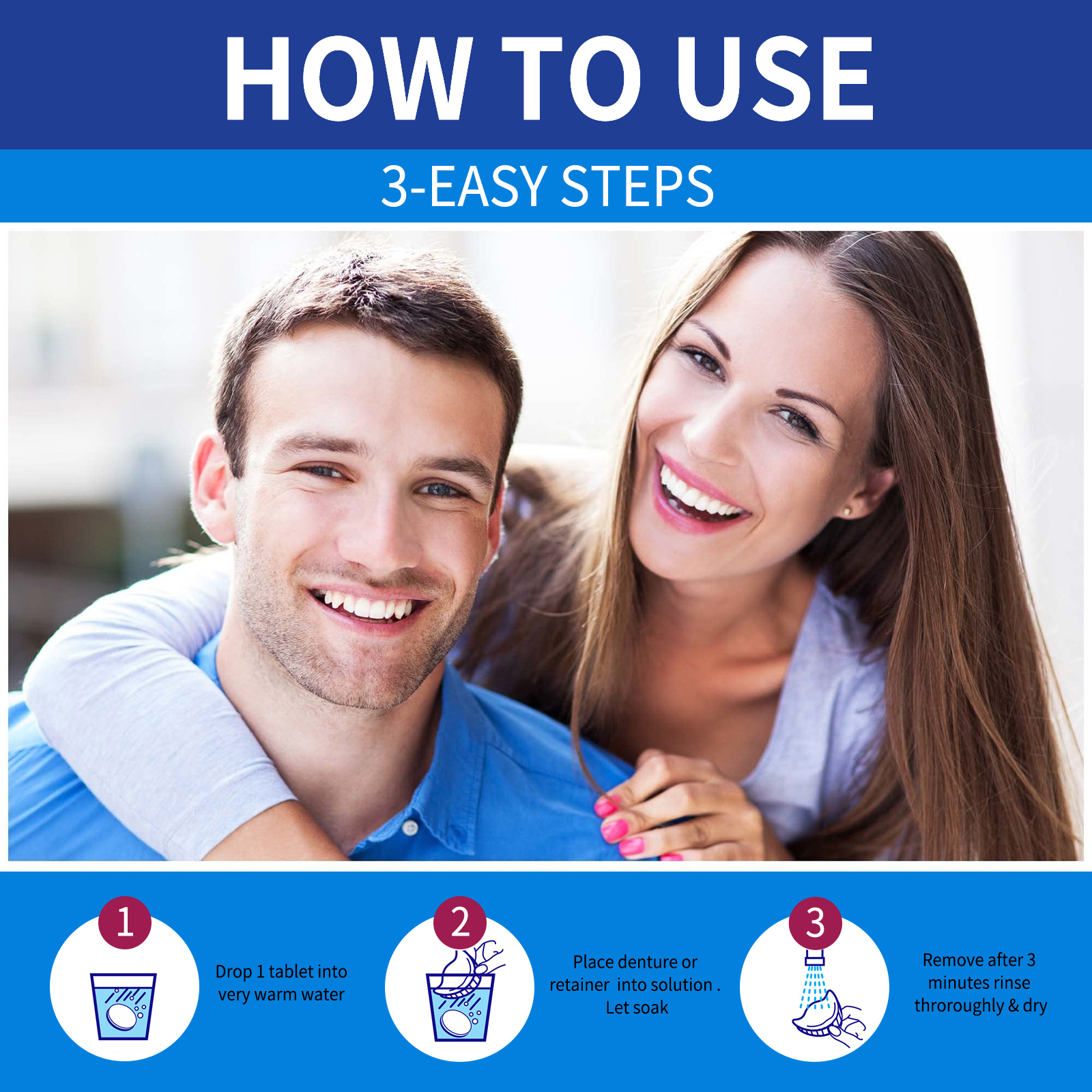 我们的假牙清洁片含有十二烷基苯磺酸钠、EDTA 二钠、铝粉。它可以有效的去除污渍和菌斑,简单的步骤去保护牙齿,没有更多的坏细菌和气味,去除异味,菌斑和牙垢。它的使用方法很简单:将1片滴入温水中,将义齿或固位器放入溶液中浸泡,3分钟后取出,彻底清洗并擦干。去除污渍,杀死99%产生异味的细菌,快速简便清洁你的假牙,让你的假牙、固位器或护齿器像新的一样好。