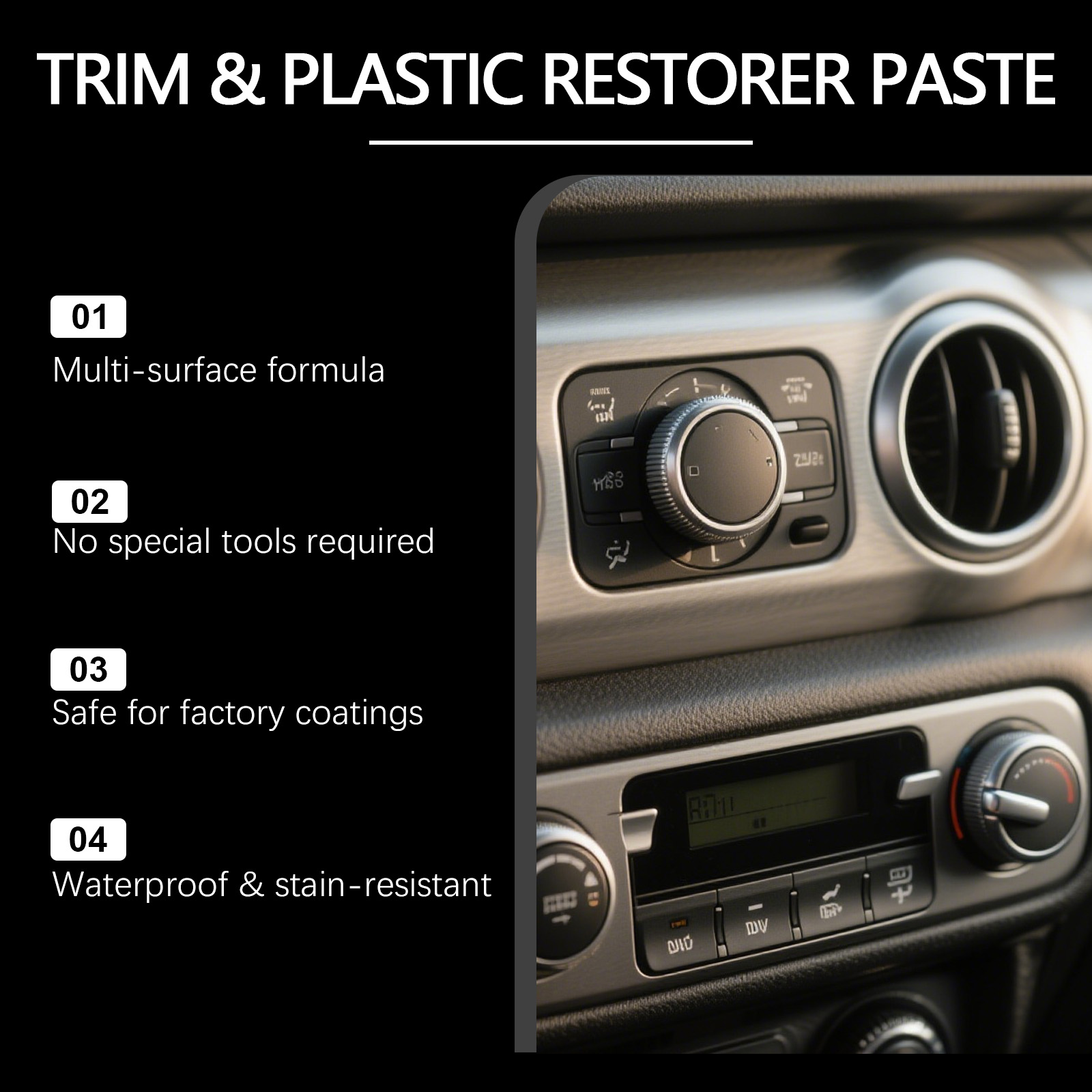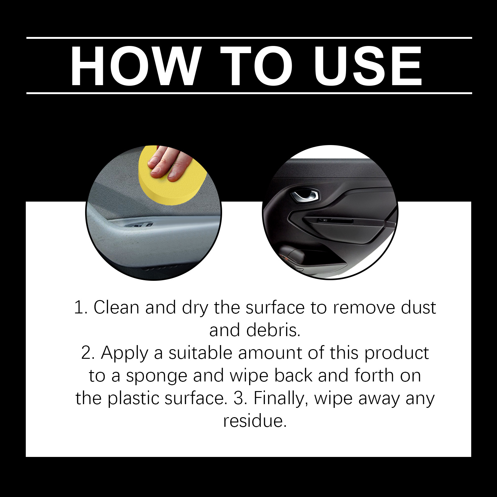 我们的内饰翻新护理套装,由甘油硬脂酸酯 、1,2-己二醇精心调配而成。专为恢复内饰塑料表面的原始光泽设计。使用方法极为便捷:1.清洁并擦干表面,以去除灰尘和碎屑。2.将适量本产品涂抹于海绵上,来回擦拭塑料表面。3.最后,擦去任何残留物。并且可以防止紫外线褪色和表面开裂。
