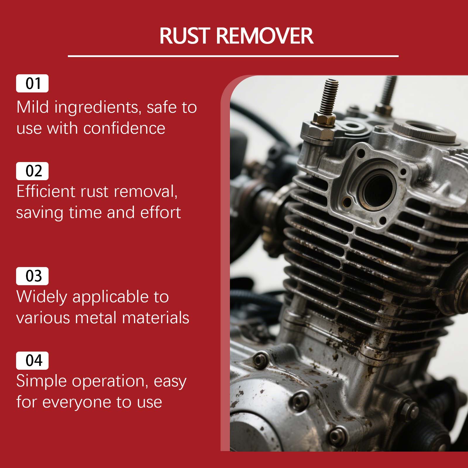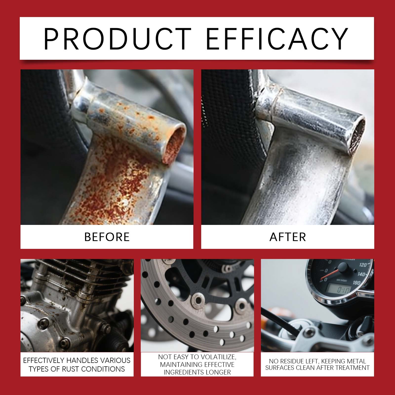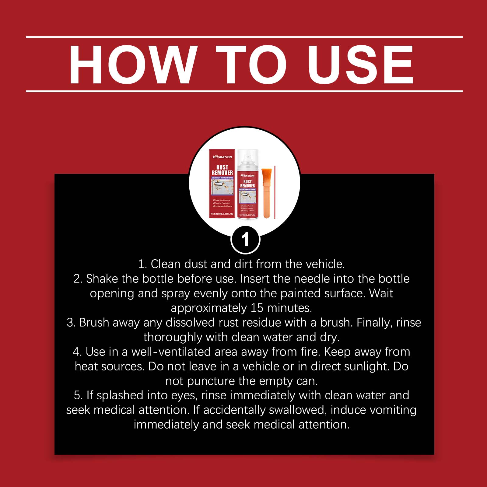 我们的除锈套装,由柠檬酸、氨基磺酸精心调配而成。专为在保护金属的同时去除锈迹设计。使用方法极为便捷:1.清洁车辆上的灰尘和污垢。2.使用前摇匀瓶子。将针头插入瓶口,均匀喷洒于漆面。等待约15分钟。3.用刷子清除所有溶解的锈迹。最后,用清水彻底冲洗并擦干。4.在通风良好的区域使用,远离火源。远离热源。不要留在车内或阳光直射处。请勿刺穿空罐。5.若溅入眼睛,立即用清水冲洗并寻求医疗帮助。若不慎吞服,请立即催吐并寻求医疗帮助。并且它可以快速起效,不留锈迹,喷洒后等待,无需复杂步骤。