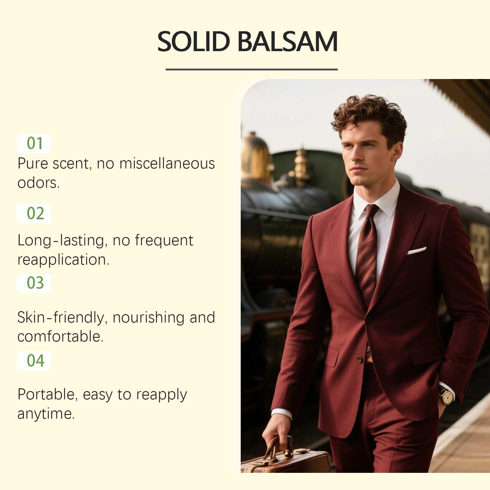 我们的雅致固体香膏套装,由矿油、白蜂蜡精心调配而成。专为滋养肌肤的同时散发香气,适合商务、日常和正式场台设计。使用方法极为便捷:1. 开盒取少量膏体,涂于手腕、耳后等脉搏处。2. 指腹轻揉按摩,助膏体吸收,避免过量。3. 外出香气弱时,随时开盒补涂,无需担心漏洒。4. 避开破损肌肤,用后存阴凉干燥处。并且它可以缓释配方全天候保持香味。