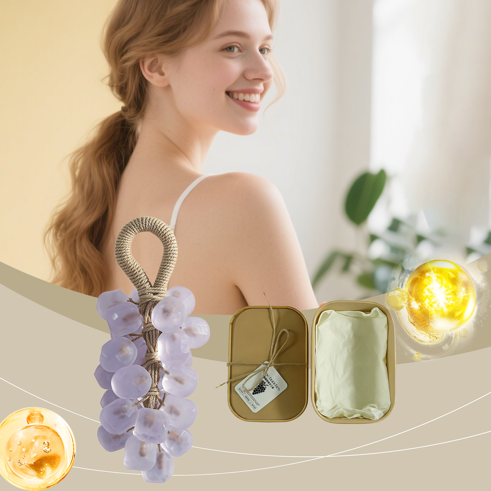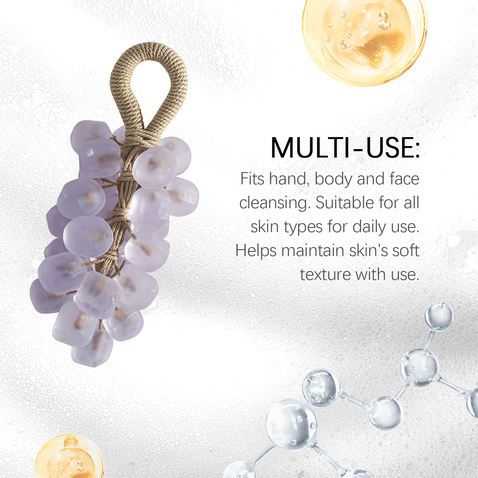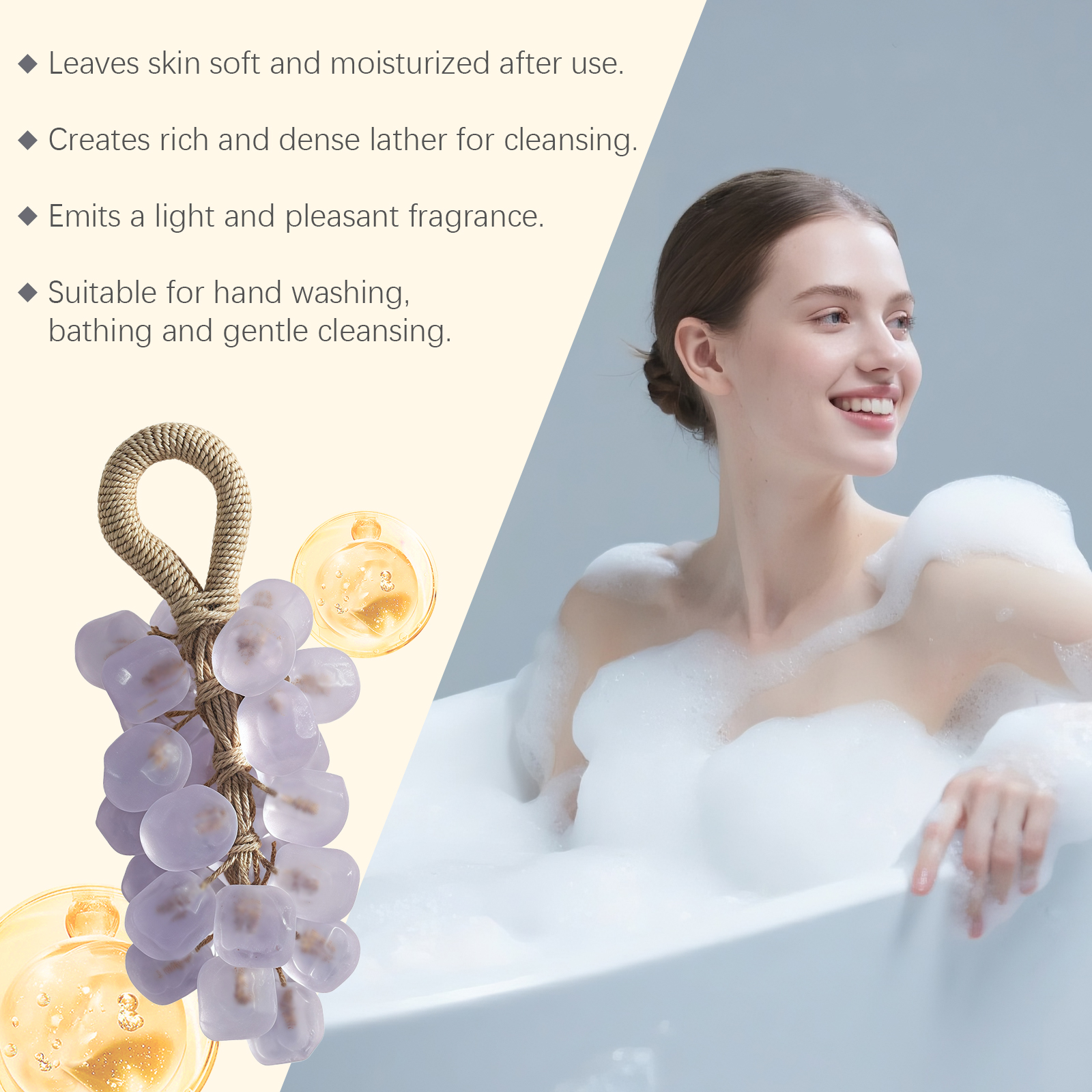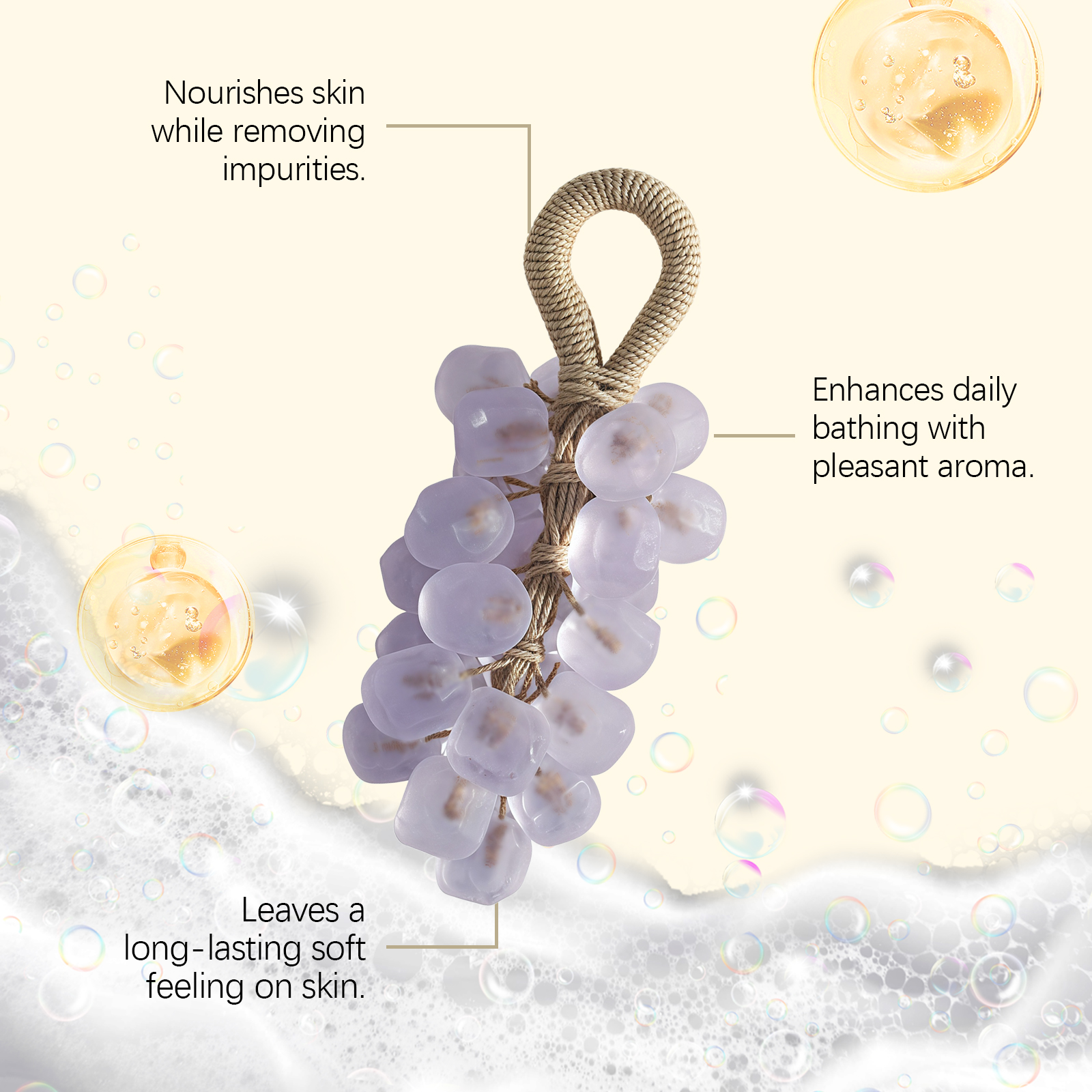 我们的薰衣草宝石葡萄皂,由棕榈油酸钠、甘油硬脂酸酯精心调配而成。专为舒缓不适并保持皮肤舒适,无需使用其他保湿产品;清洁后皮肤仍保持水润,清洁同时补充水分实现持久保湿,洁面后肌肤感觉自然水润光滑设计。使用方法极为便捷:1. 润湿皮肤,弄湿肥皂,然后揉搓起泡。2. 将泡沫涂抹于皮肤上,轻轻按摩片刻。3. 用清水彻底冲洗干净。并且它可以散发出柔和宜人的香气,提供奢华的沐浴体验,使用后有助于提神醒脑,舒缓身心。