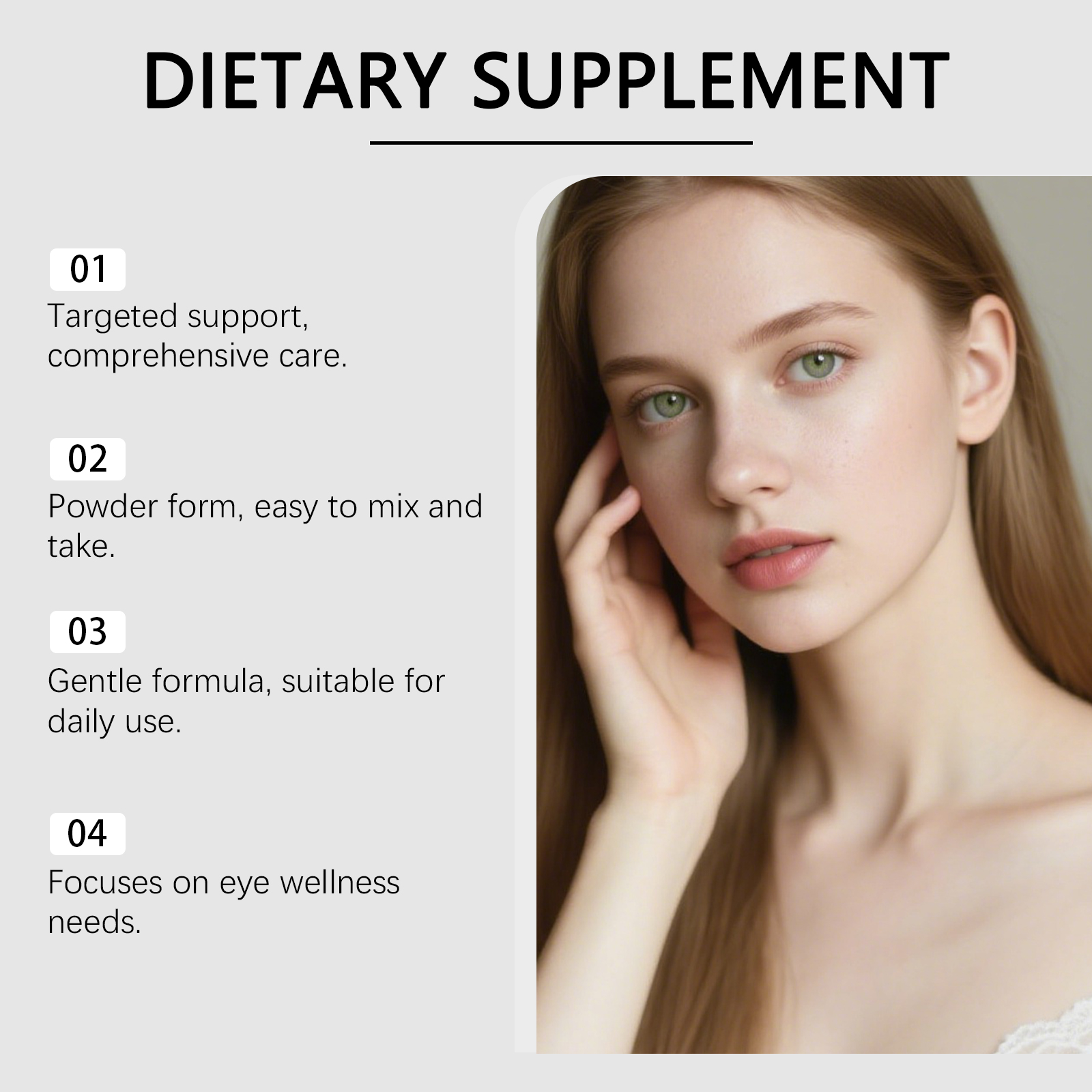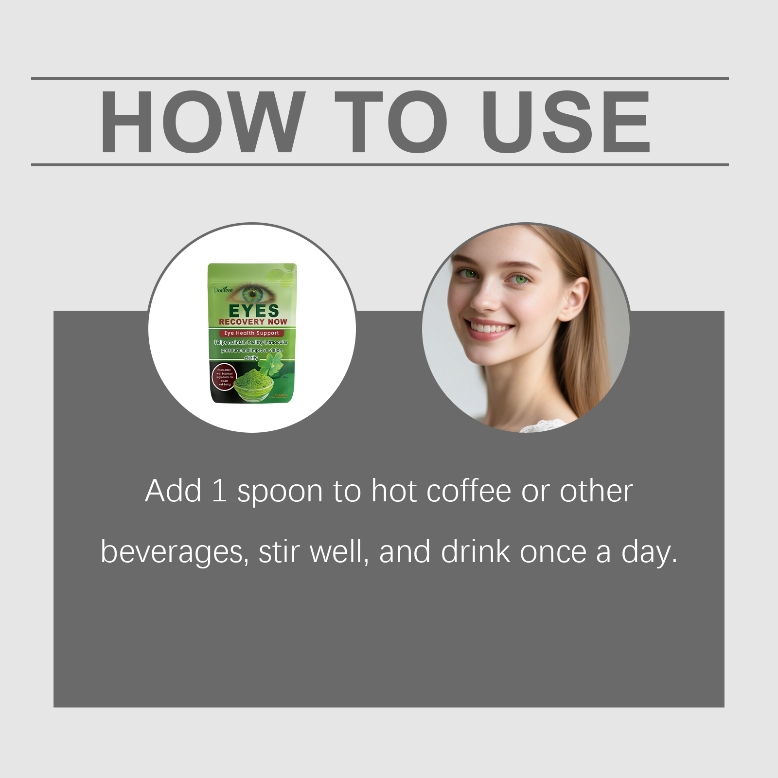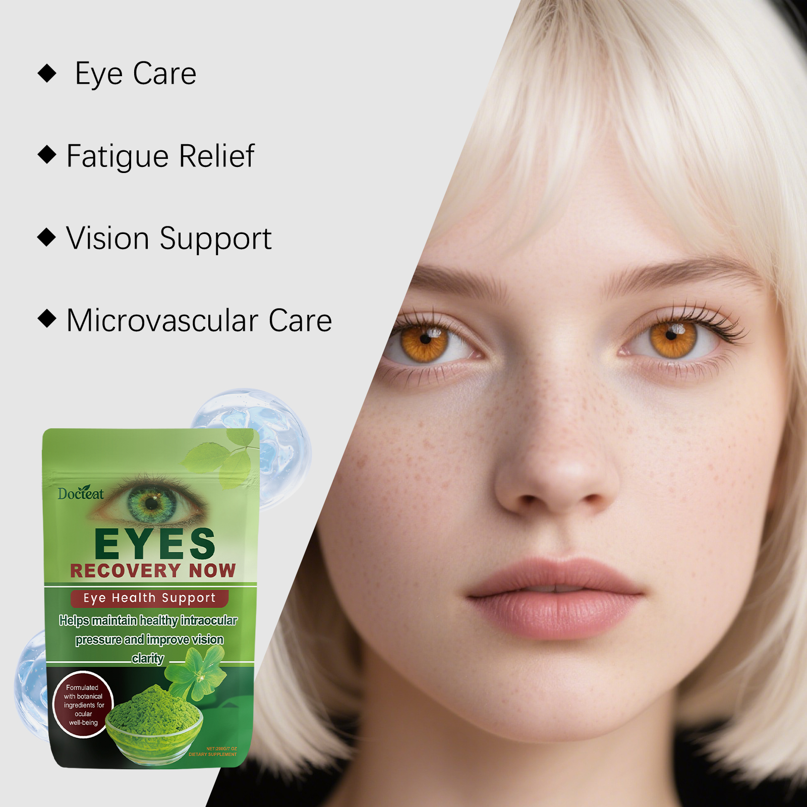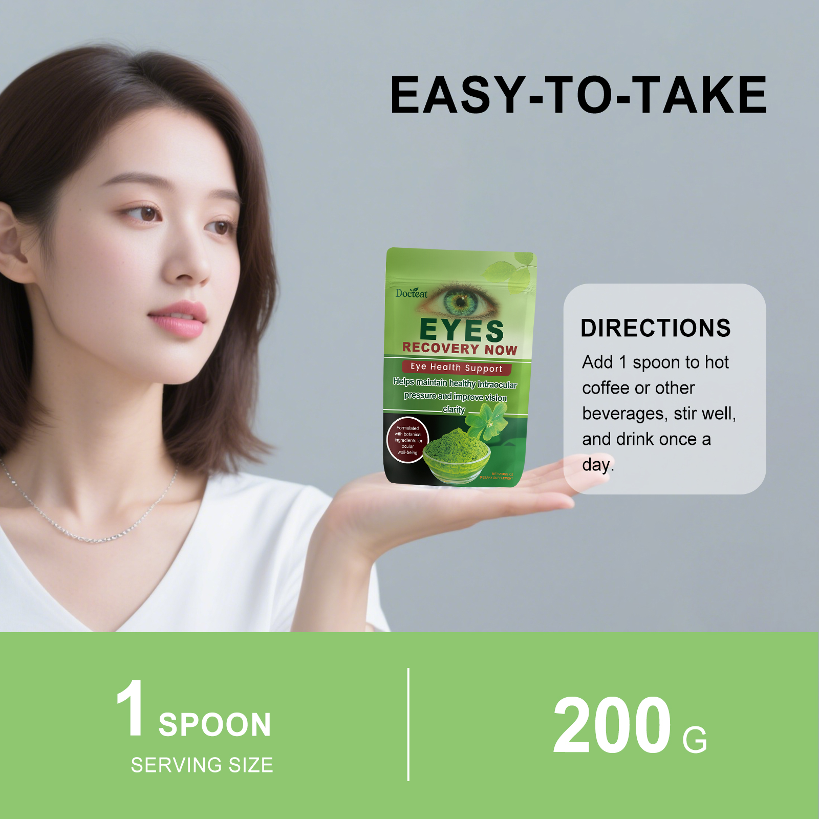 我们的眼部养护粉,由维生素A、维生素C精心调配而成。专为支持整体眼部健康,缓解眼睛疲劳设计。使用方法极为便捷:取1勺加入热咖啡或其他饮品中,搅拌均匀,每日饮用一次。并且它可以有助于改善视力,专注于整体眼部健康支持。