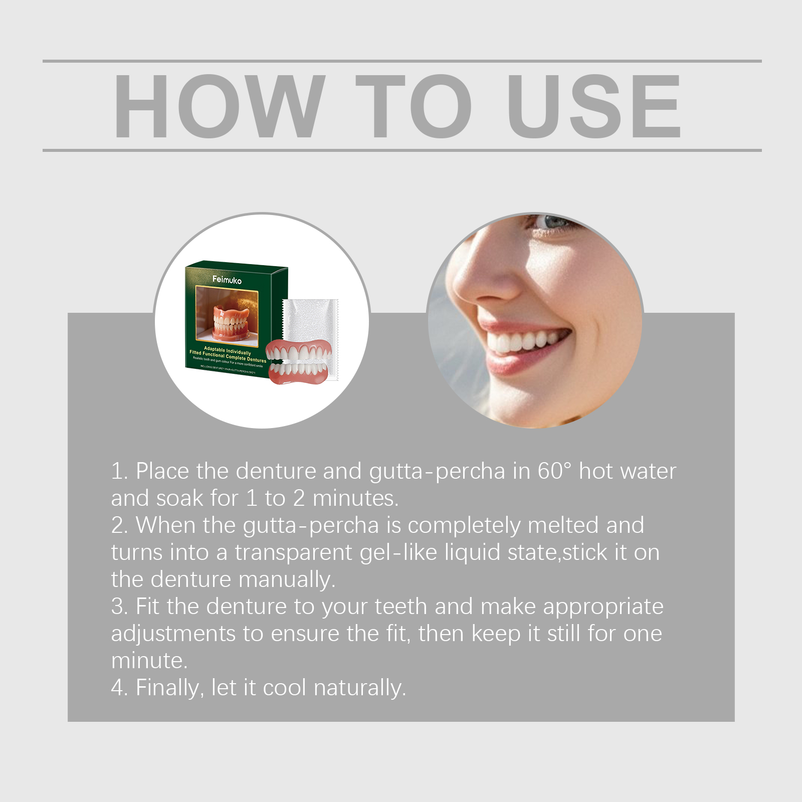 我们的假牙修饰套装,由树脂精心调配而成。专为舒适贴合,适合日常佩戴,高耐用性,长期使用无损耗设计。使用方法极为便捷:1.将义齿和牙胶棒放入60°C热水中浸泡1至2分钟。2.当牙胶尖完全熔化并变为透明凝胶状液体时手动将其粘贴到义齿上。3.将假牙贴合您的牙齿,并进行适当调整以确保密合,然后静置一分钟。4.最后,让其自然冷却。并且它安装简便,无需复杂步骤,适用于各种牙齿形状,通用性强。