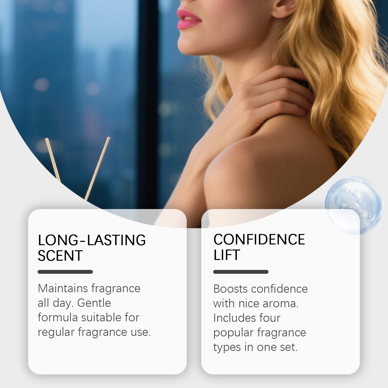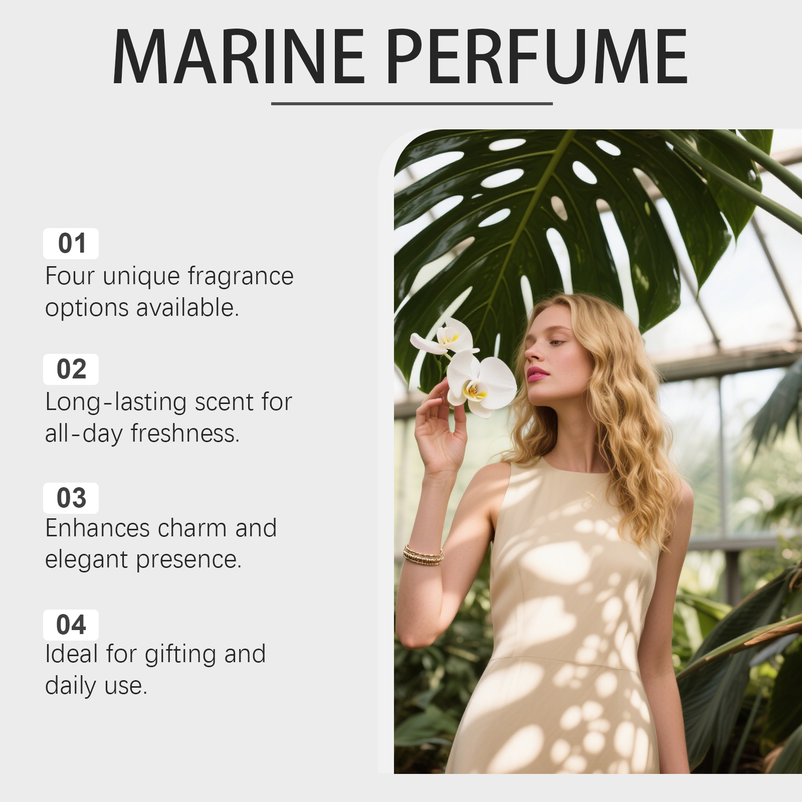 我们的海洋沁润淡香水,由丙二醇、甘油精心调配而成。专为全天候保持香气,温和配方适合日常使用香水,通过宜人的香气提升自信。一套包含四种流行香刑设计。使用方法极为便捷:将香水喷洒在头发、手腕、颈部和耳后等部位或是可以将香水喷雾喷洒在空中再走进香雾中,让香水喷雾均匀地弥漫全身,留下芳香。并且它具有独特的香氛配方,小巧包装,便于随身携带使用,香味柔和持久,不会过于浓烈。