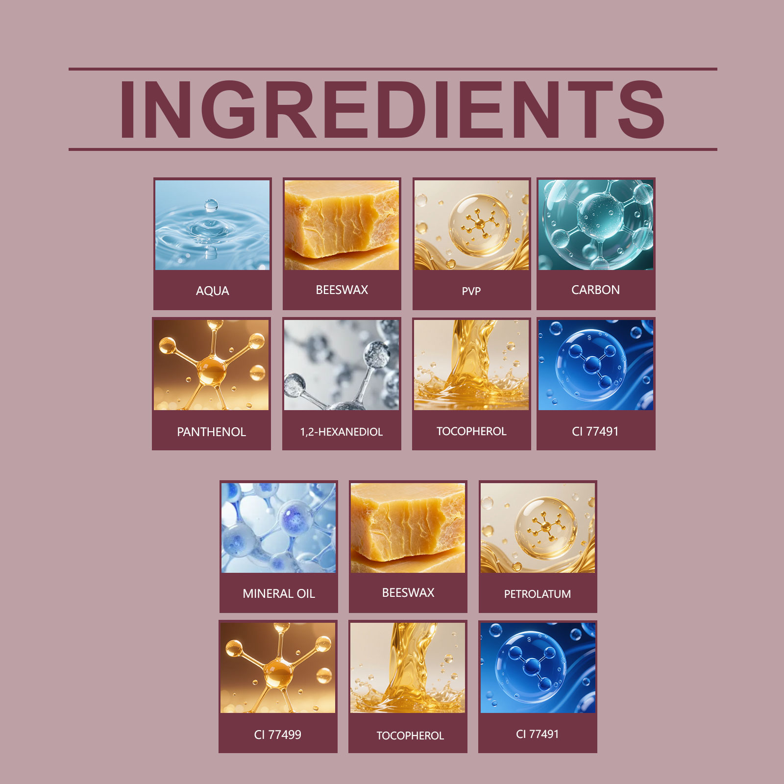 | 成分 | 黑色睫毛膏:蜂蜡、聚乙烯吡咯烷酮,唇膏:矿油、蜂蜡 |