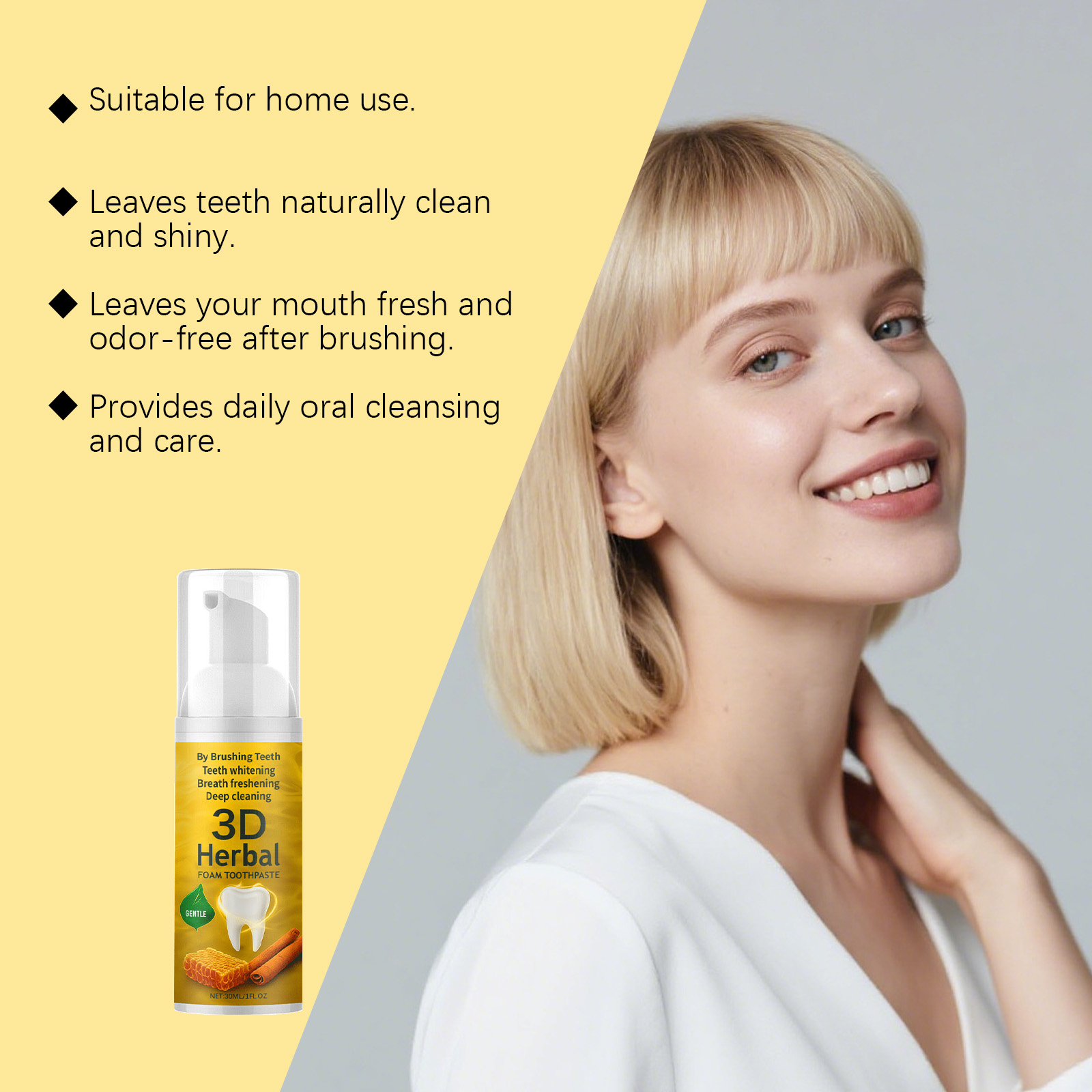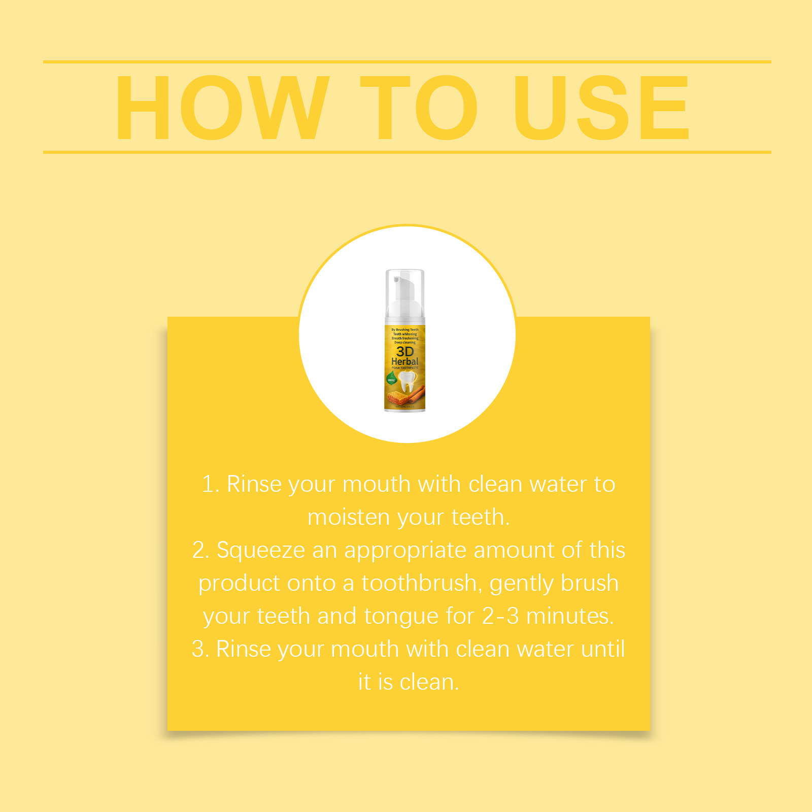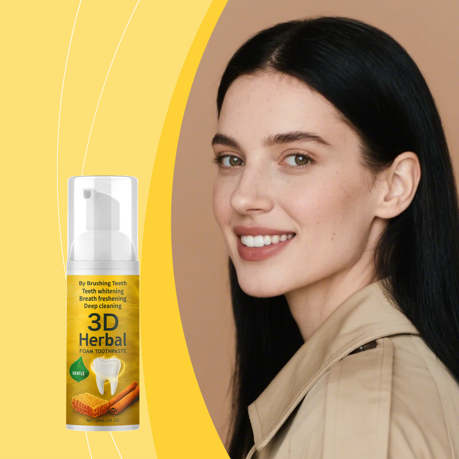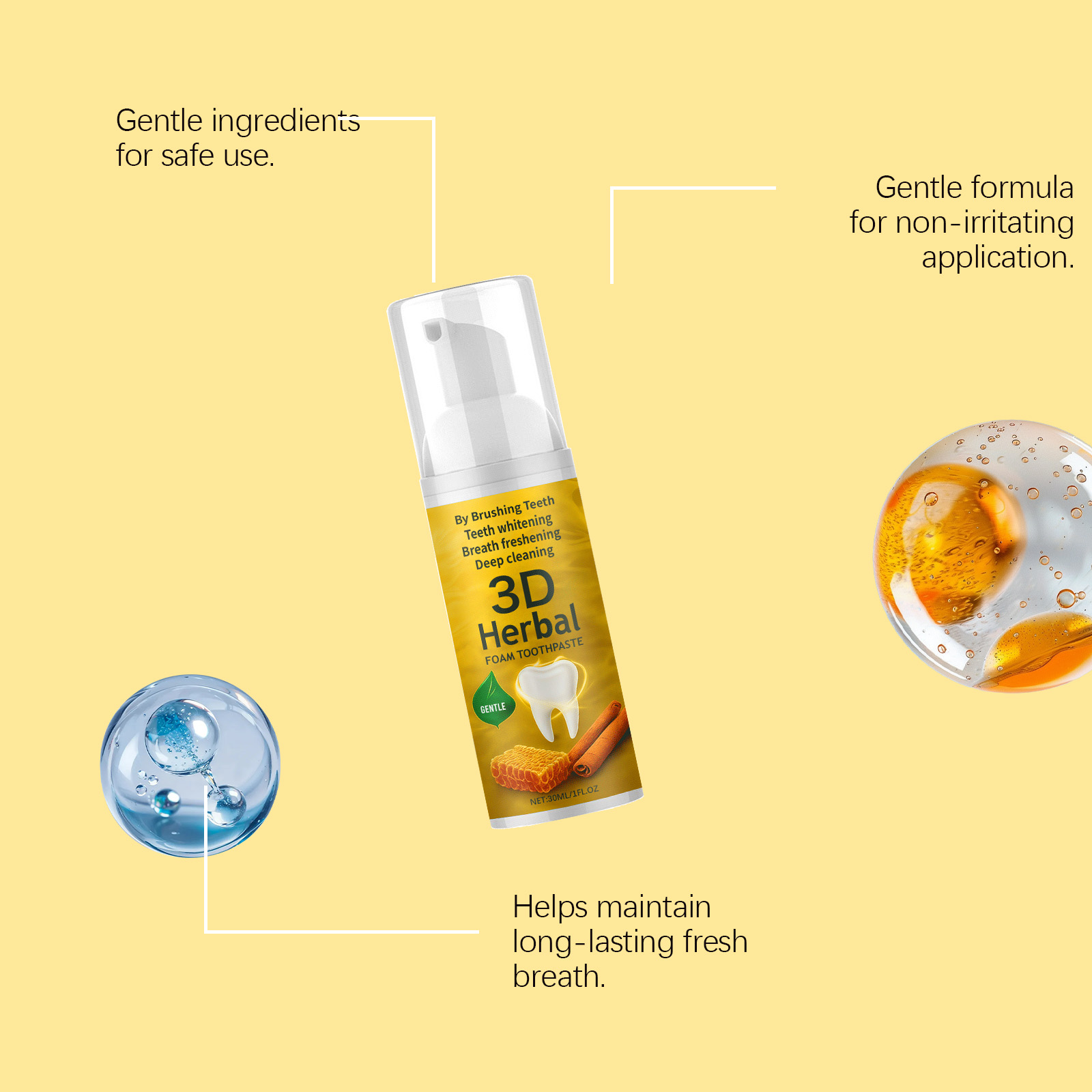 我们的草本泡沫牙膏,由蜂蜜提取物、肉桂提取物精心调配而成。专为清凉舒缓牙齿设计。使用方法极为便捷:1.用清水漱口,以湿润牙齿。2.将适量本产品挤在牙刷上,轻轻刷牙和舌头2-3分钟。3.用清水漱口直至口腔干净。并且可以支持口腔健康。