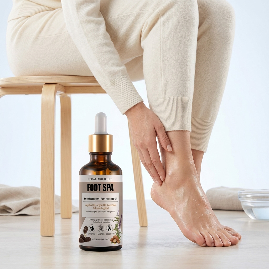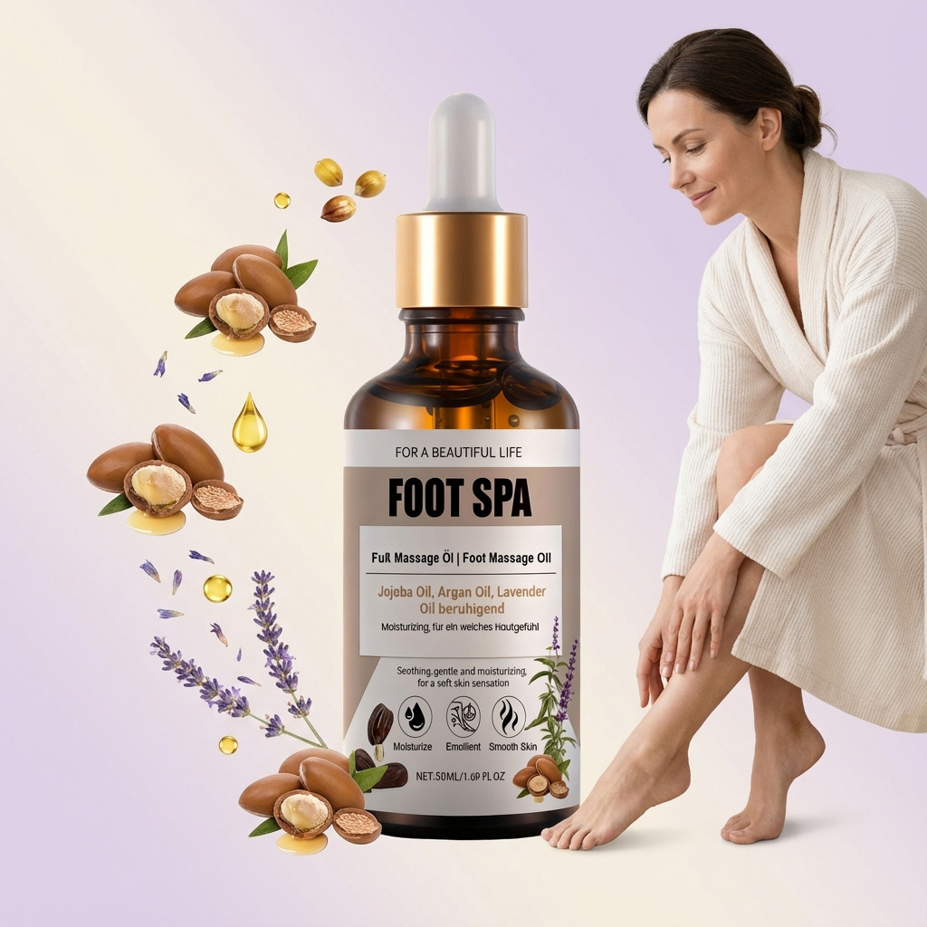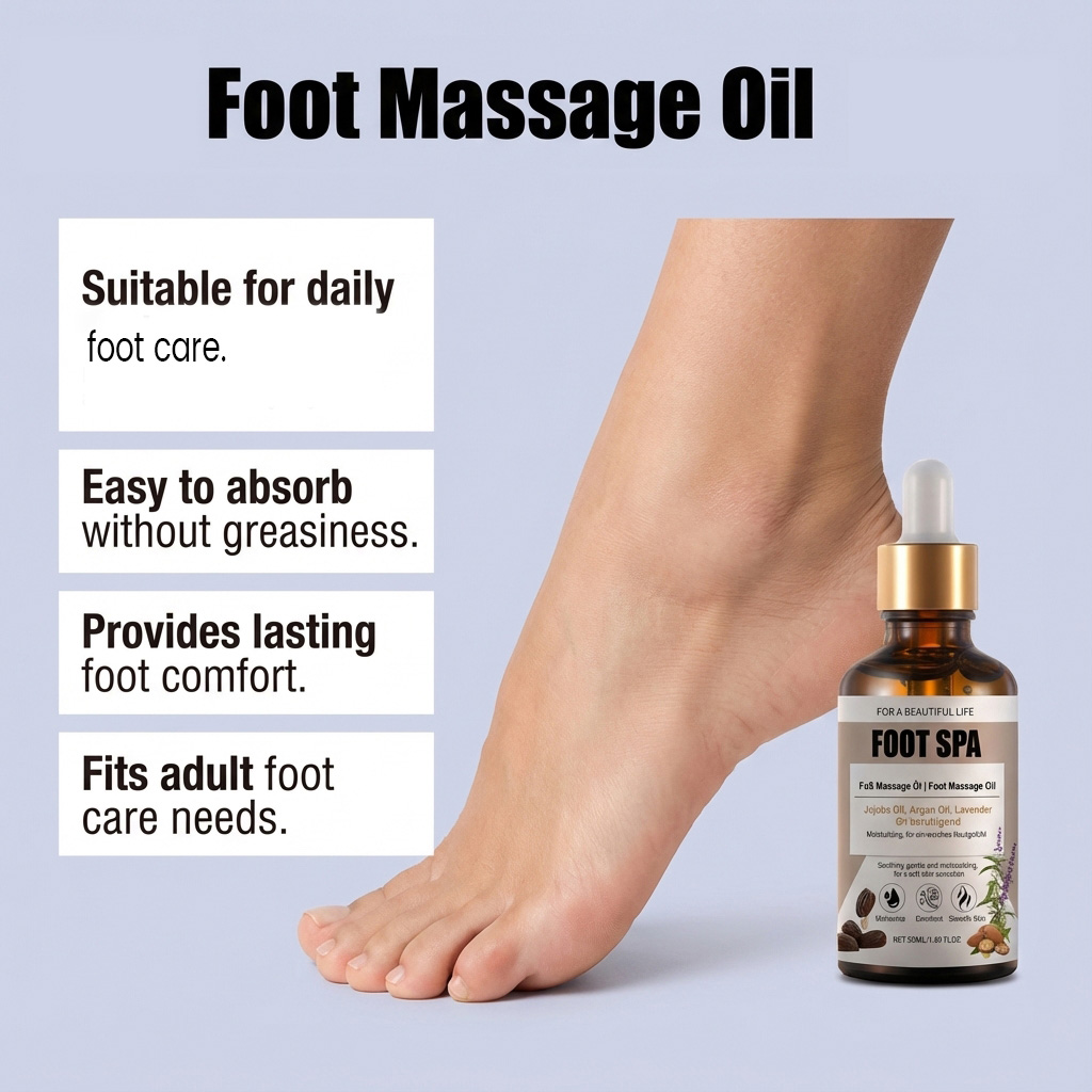 我们的足部按摩精油,由刺阿干树仁油、薰衣草油精心调配而成。专为缓解足部疲劳设计。使用方法极为便捷:清洁并擦干双脚,去除死皮细胞,在掌心取适量精油,双手搓揉10-15秒,然后均匀涂抹于脚部。并且有助于保持足部皮肤柔软。