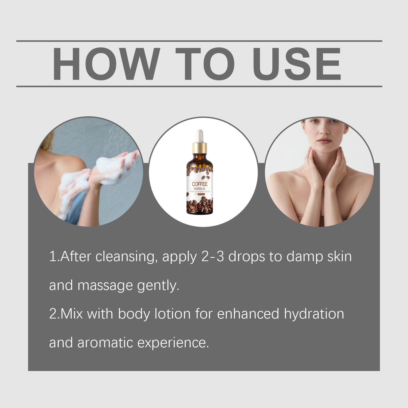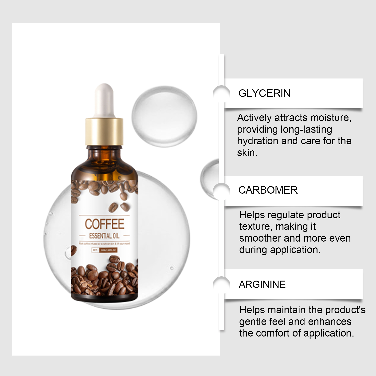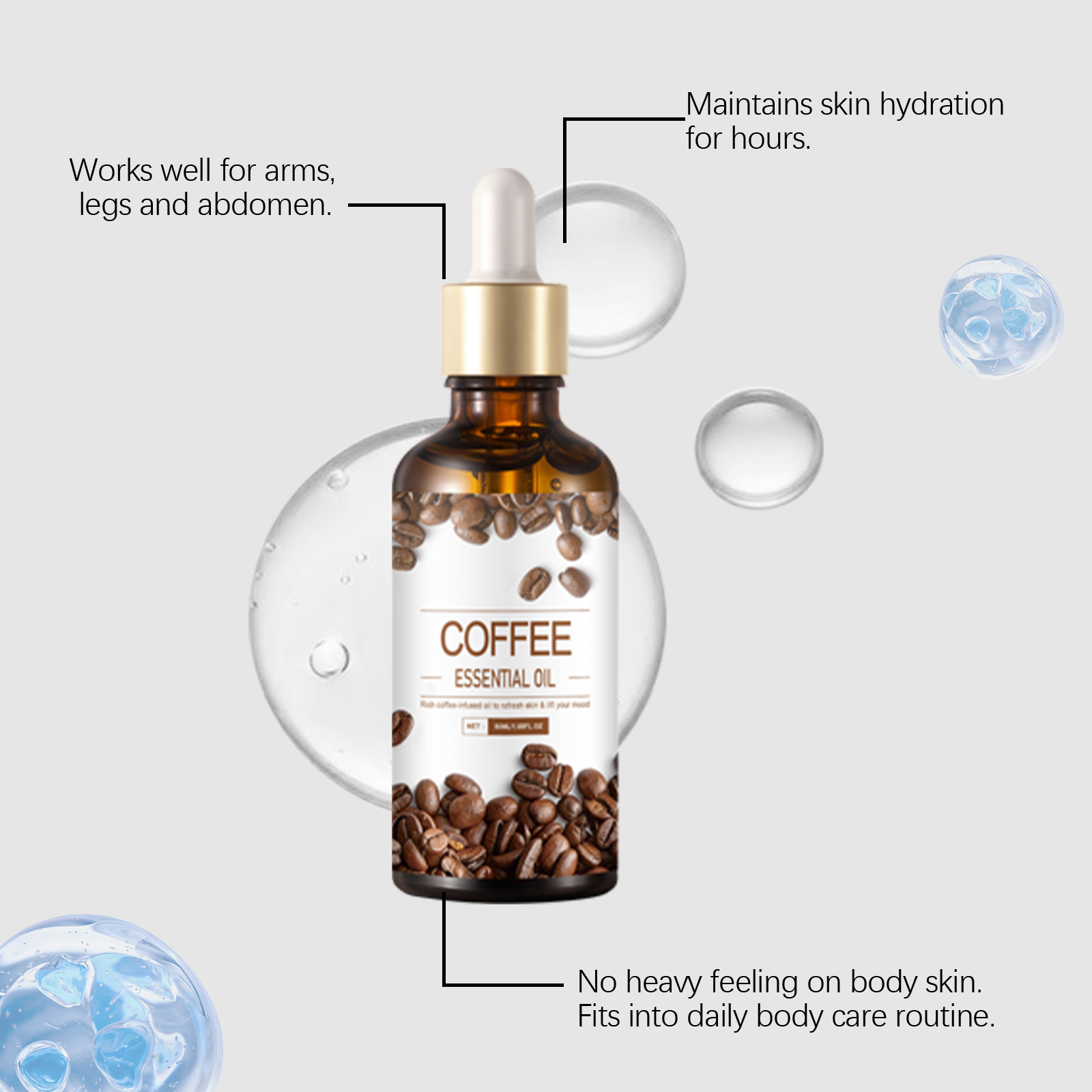 我们的身体保湿精油,由精氨酸、咖啡提取物精心调配而成。专为提供持久保湿设计。使用方法极为便捷:1.清洁后,取2-3滴涂抹于湿润肌肤并轻柔按摩。2.与身体乳混合,以增强保湿效果和芳香体验。并且有助于提升身体肌肤紧致度,适用于所有身体部位。