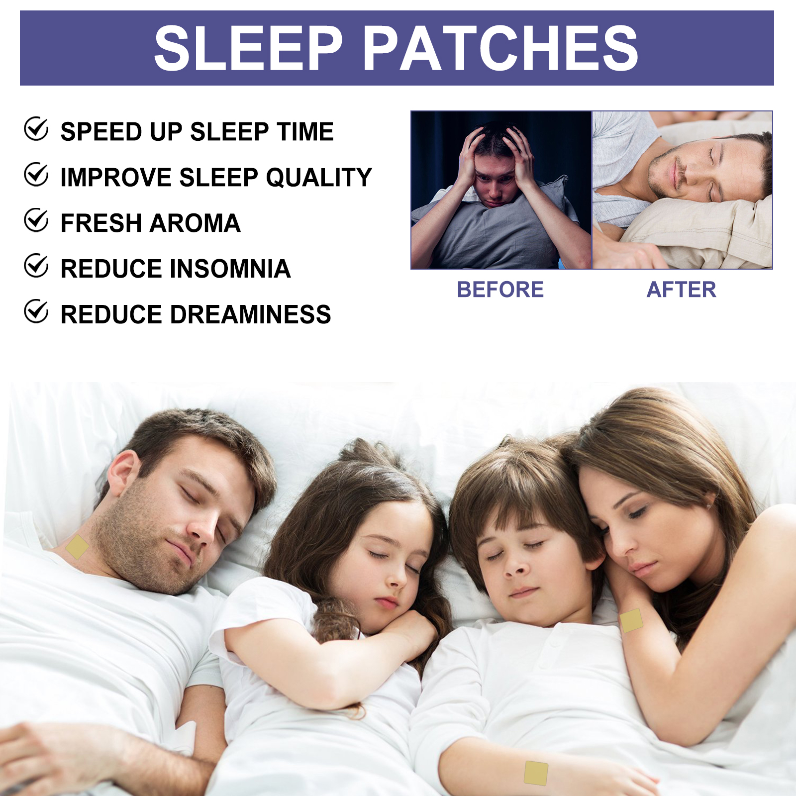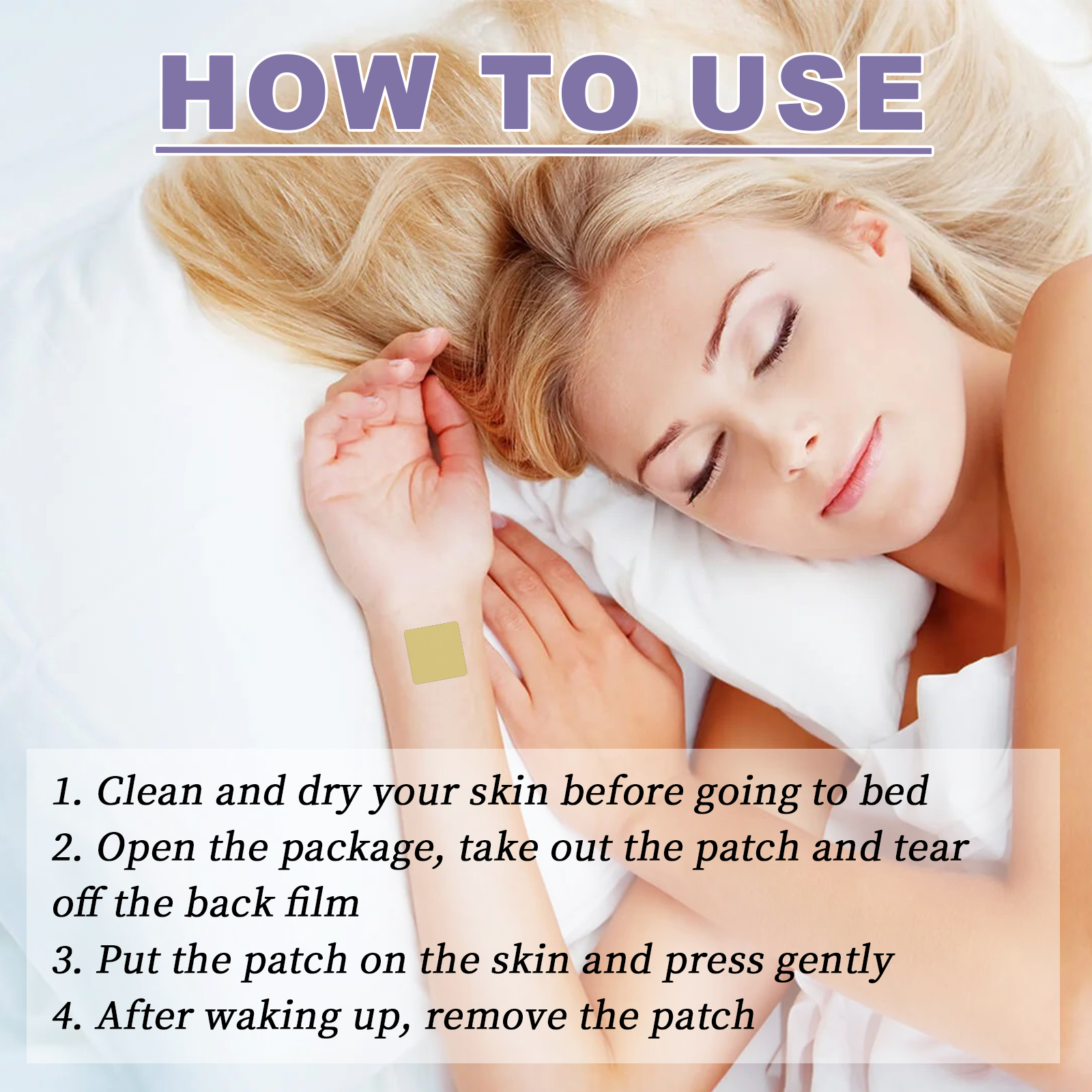我们的睡眠贴含有薰衣草、缬草、啤酒花。它可以助于睡眠,防止半夜醒来,减少失眠、多梦等,提高睡眠质量,使用方便,气味清新,享受舒适的睡眠。它的使用方法很简单:睡觉前清洁并擦干皮肤,打开包装,取出贴片,撕下背面的薄膜,把贴片贴在皮肤上,轻轻按压,醒来后,取下贴片。并且可以护理身体。