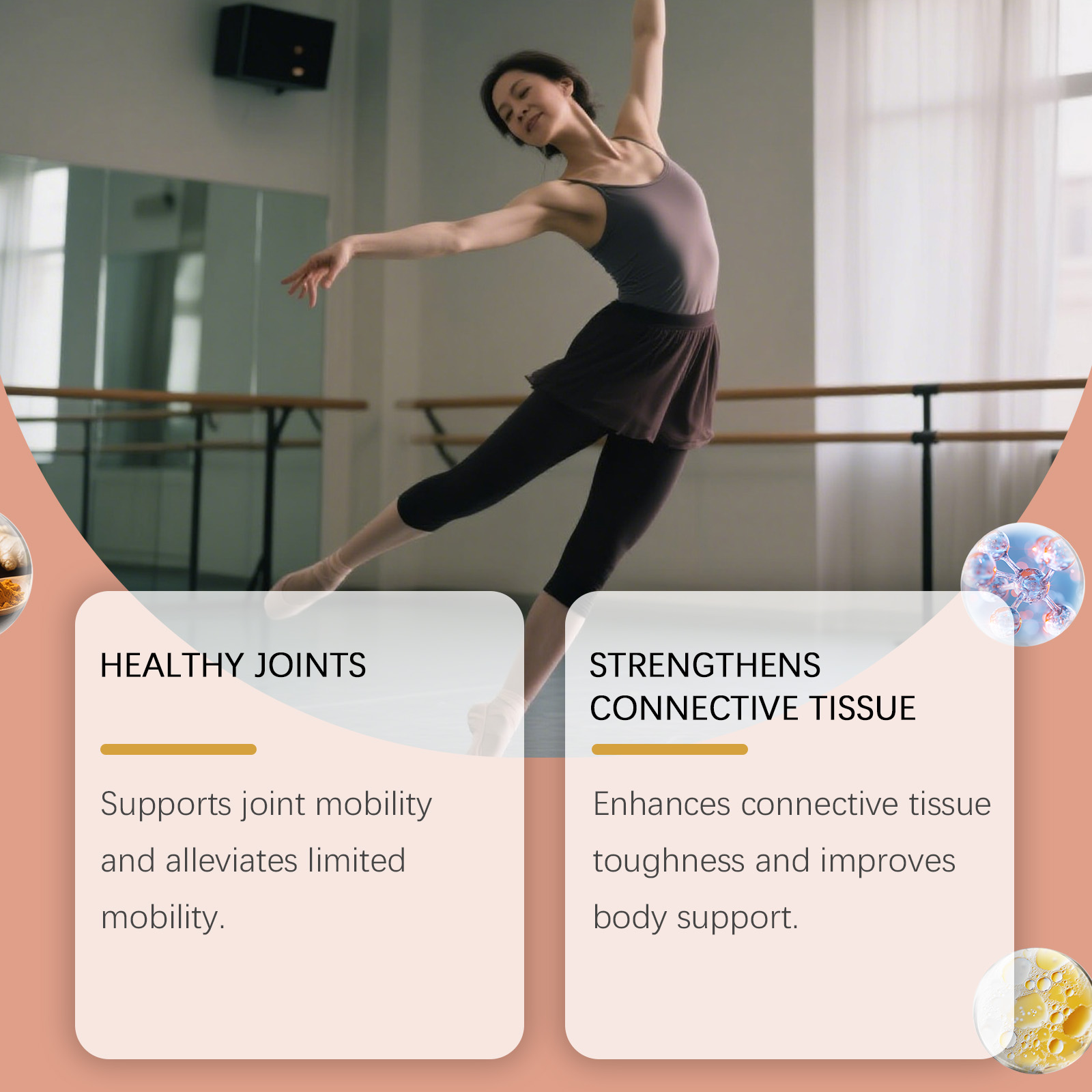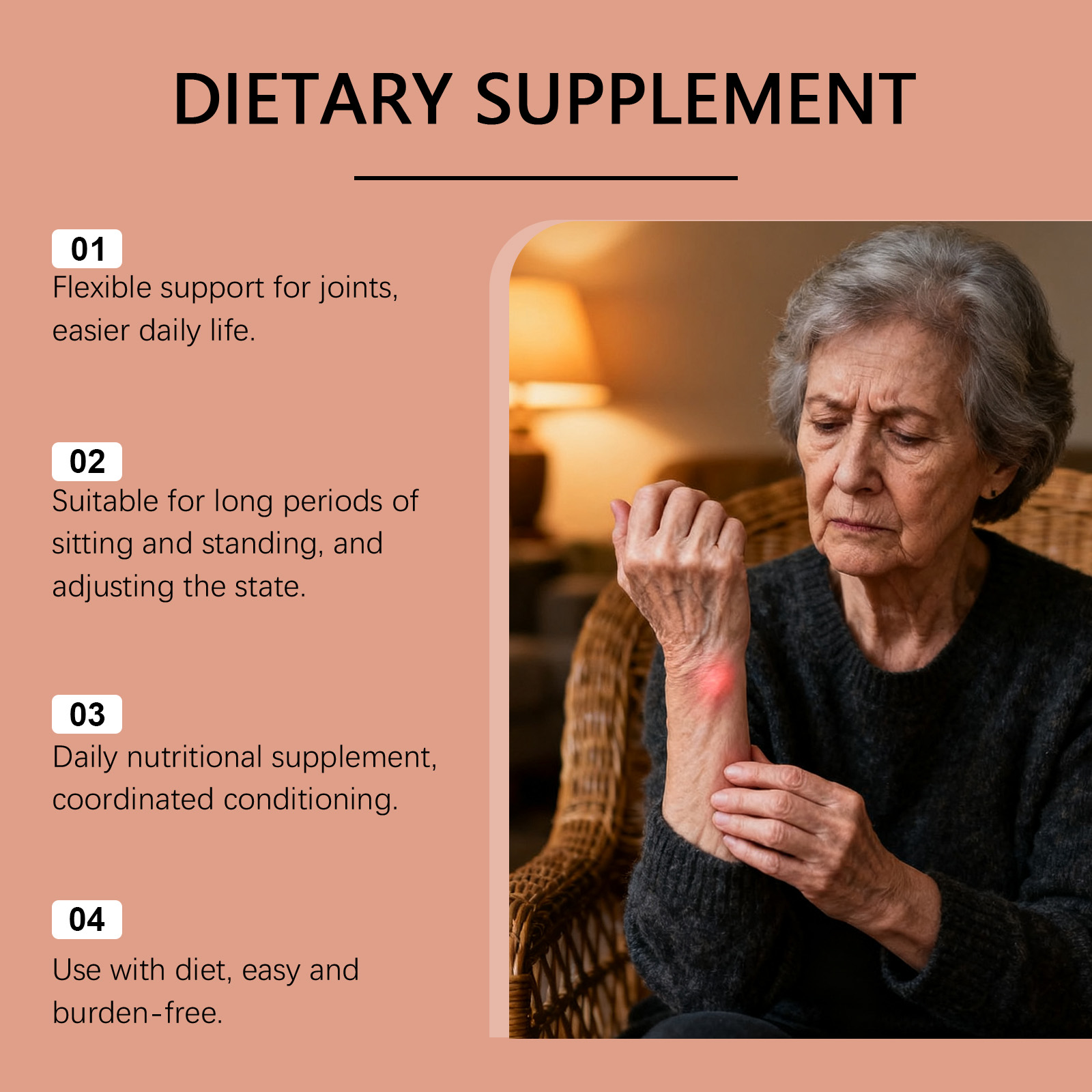 我们的关节支持胶囊,由硫酸氨基葡萄糖、硫酸软骨素精心调配而成。专为支持关节活动并缓解活动受限,增强结缔组织韧性并改善身体支撑设计。使用方法极为便捷:每天一次,每次3粒。并且它可以适合长期使用,有助于维持关节健康,帮助保持关节灵活性,使日常活动更轻松。