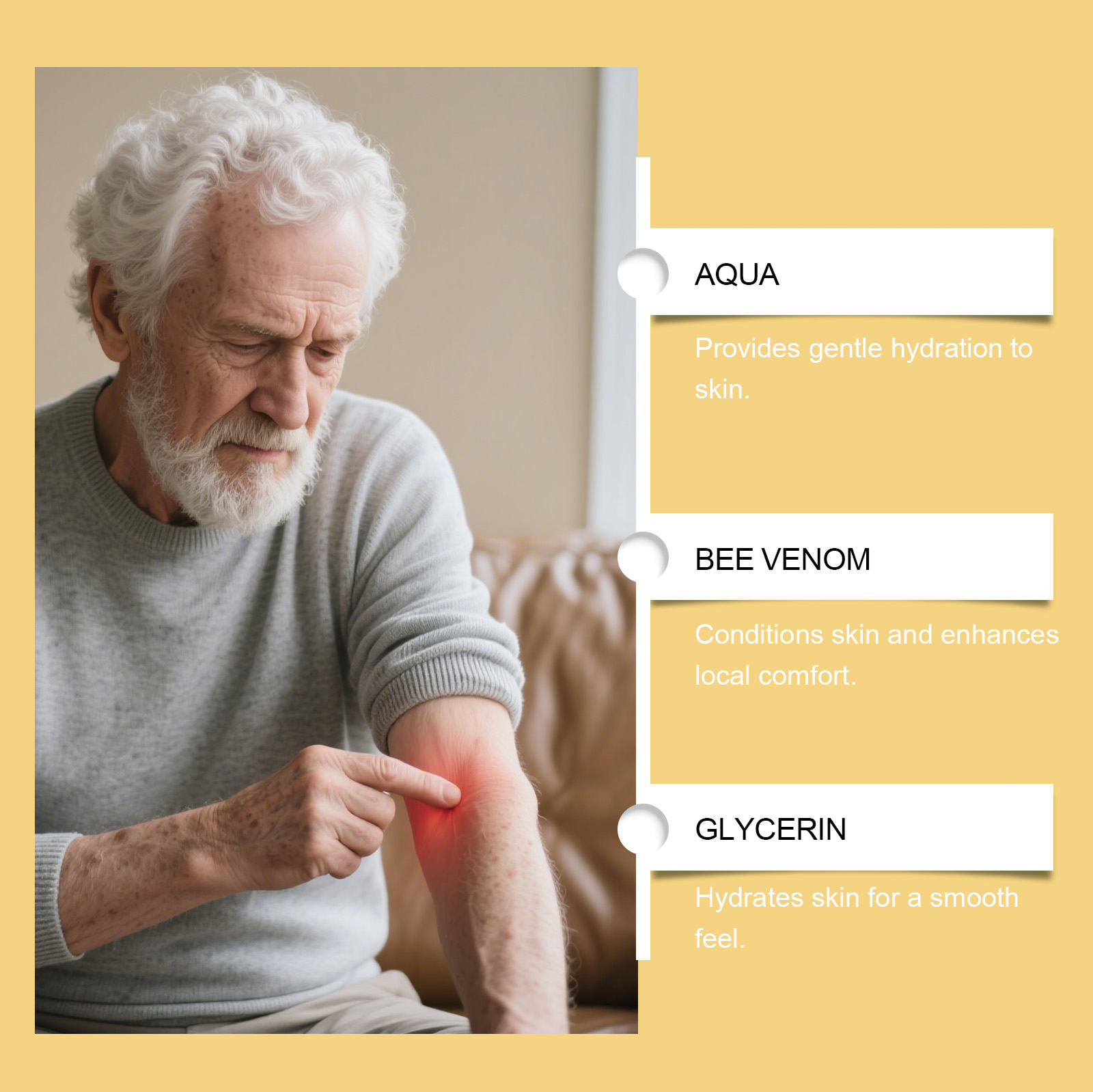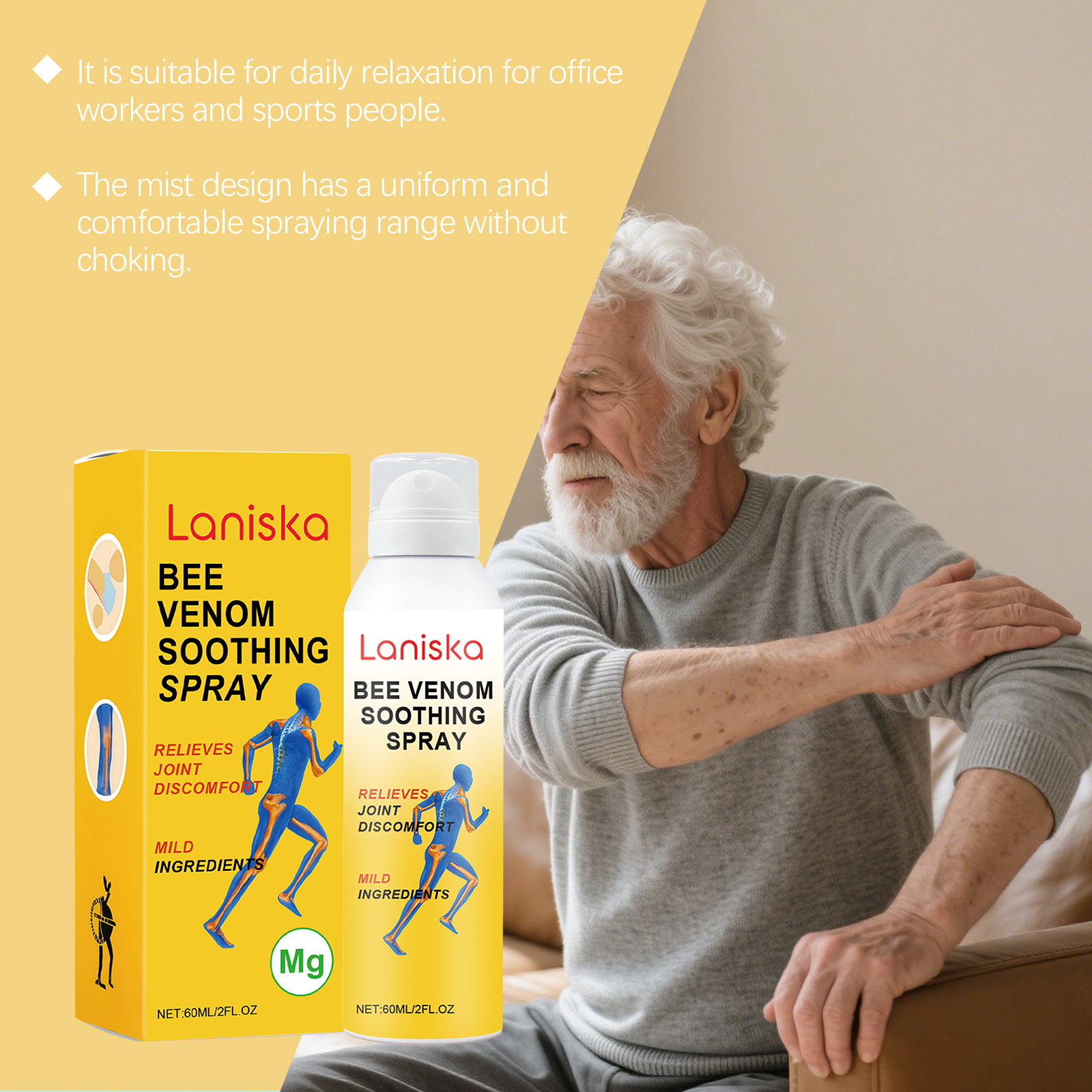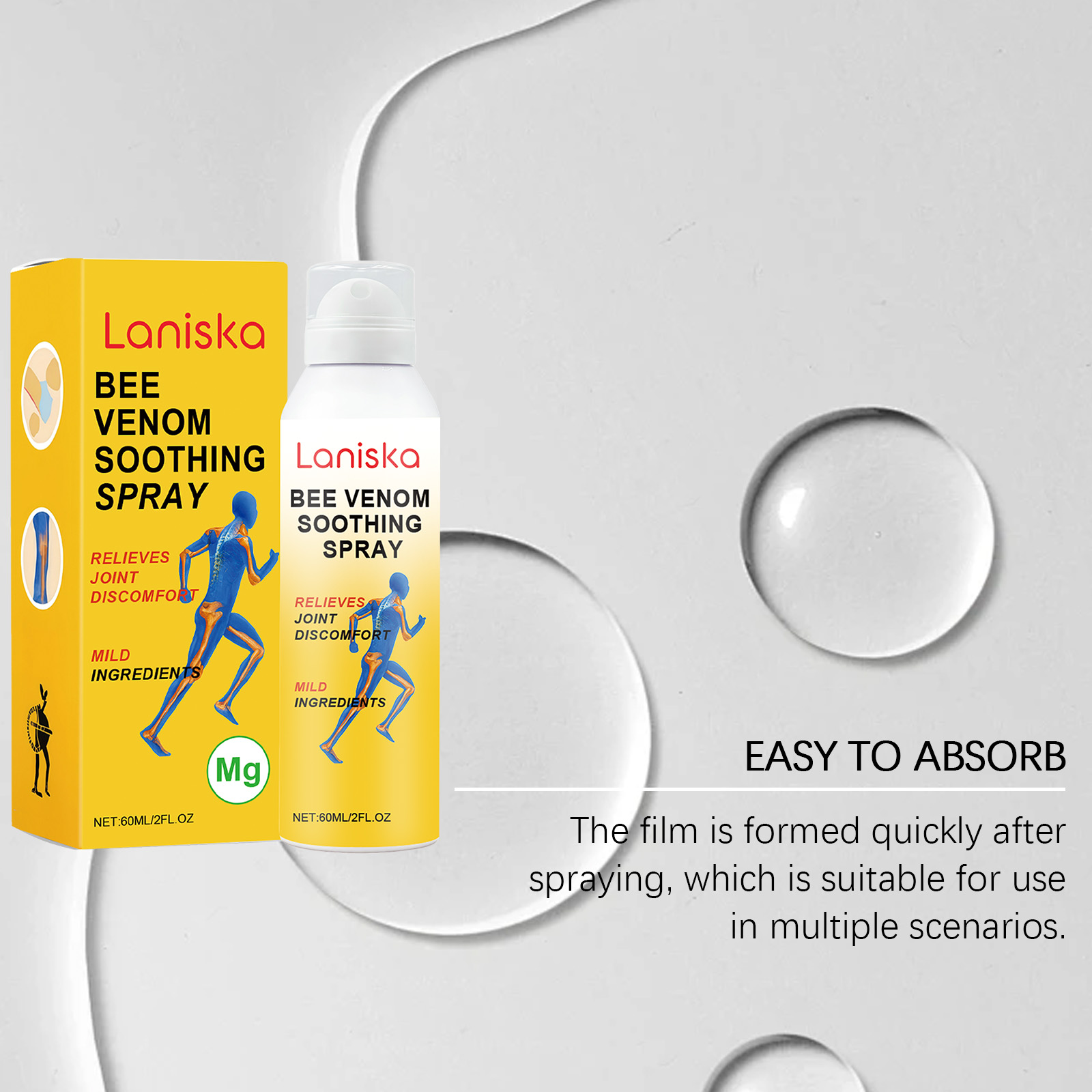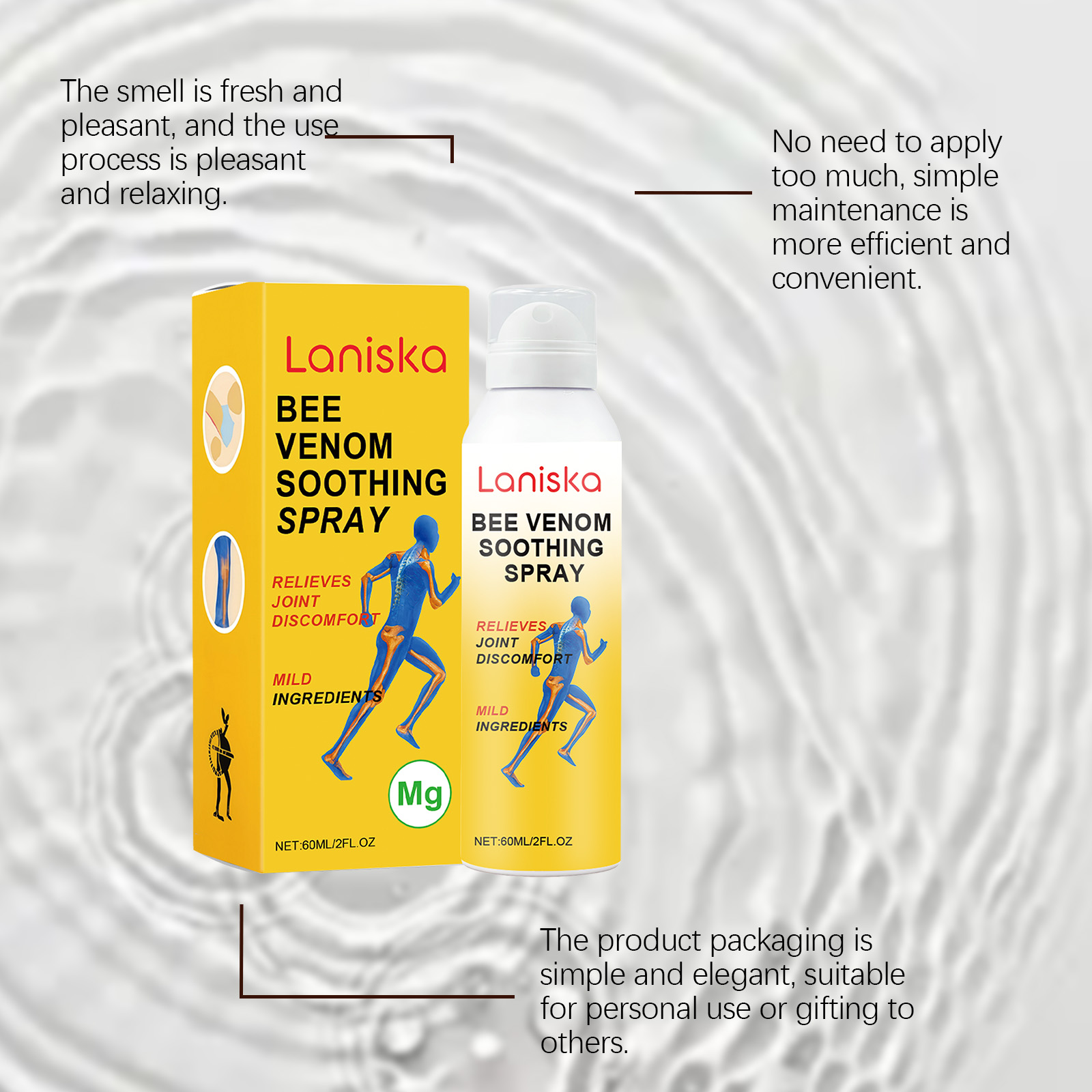 我们的关节护理喷雾,由蜂毒、氯化镁精心调配而成。专为舒缓关节设计。使用方法极为便捷:清洁并擦干皮肤,在受影响的关节部位喷洒适量产品,并轻轻按摩直至完全吸收。并且它产品包装简约优雅,适合个人使用或赠送给他人。