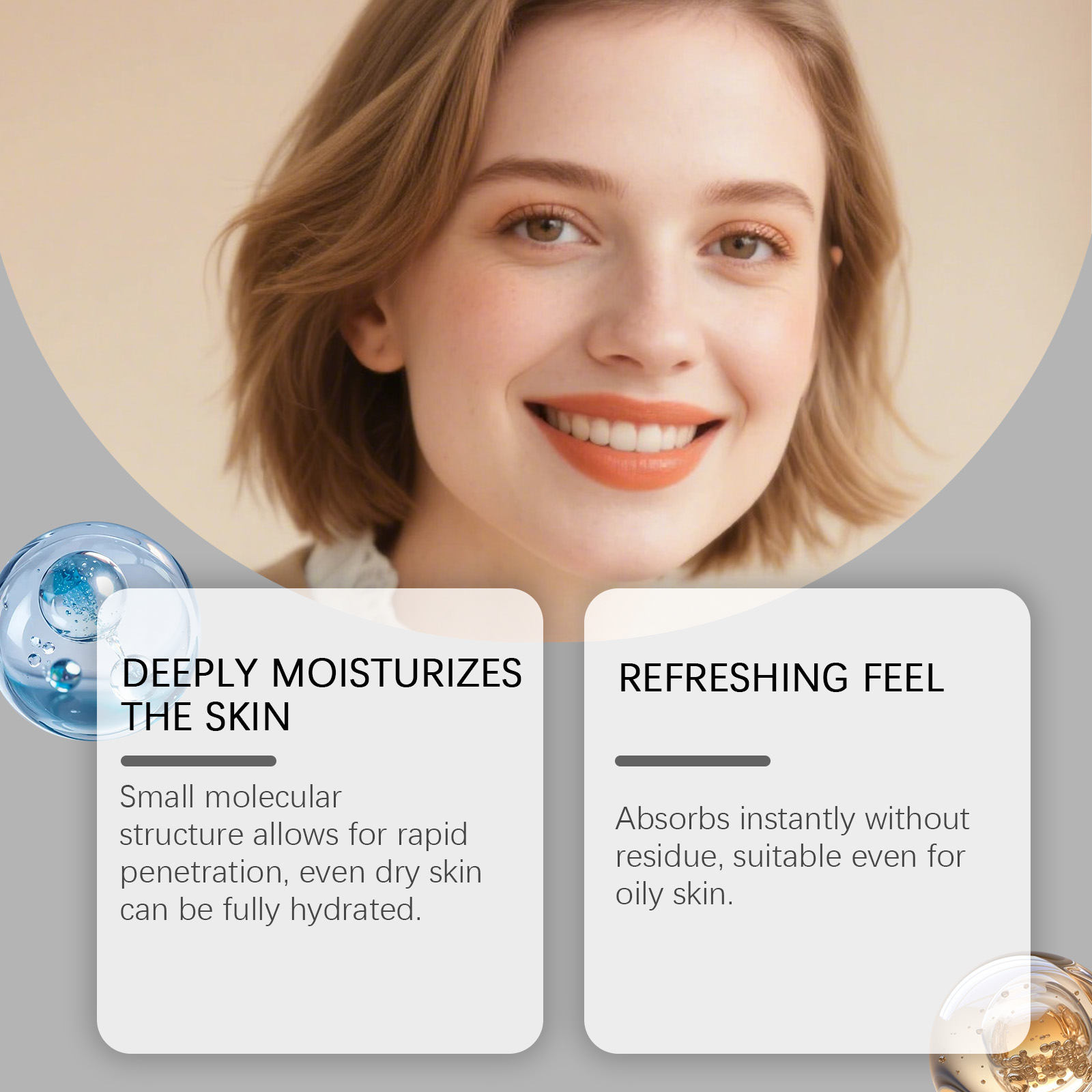 我们的玻尿酸精华液,由透明质酸、石榴果提取物精心调配而成。专为全天候保持水分设计。使用方极为便捷:1.清洁后,取2-3滴均匀涂抹于面部。2.用指尖轻轻拍打至吸收,按摩可增强效果。3.早晚使用,之后涂抹保湿霜以锁住水分。并且可以防止干燥和脱皮。