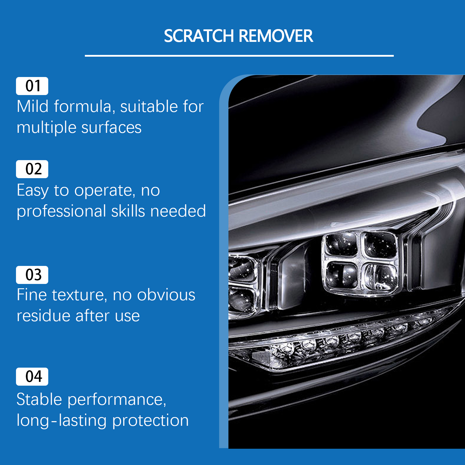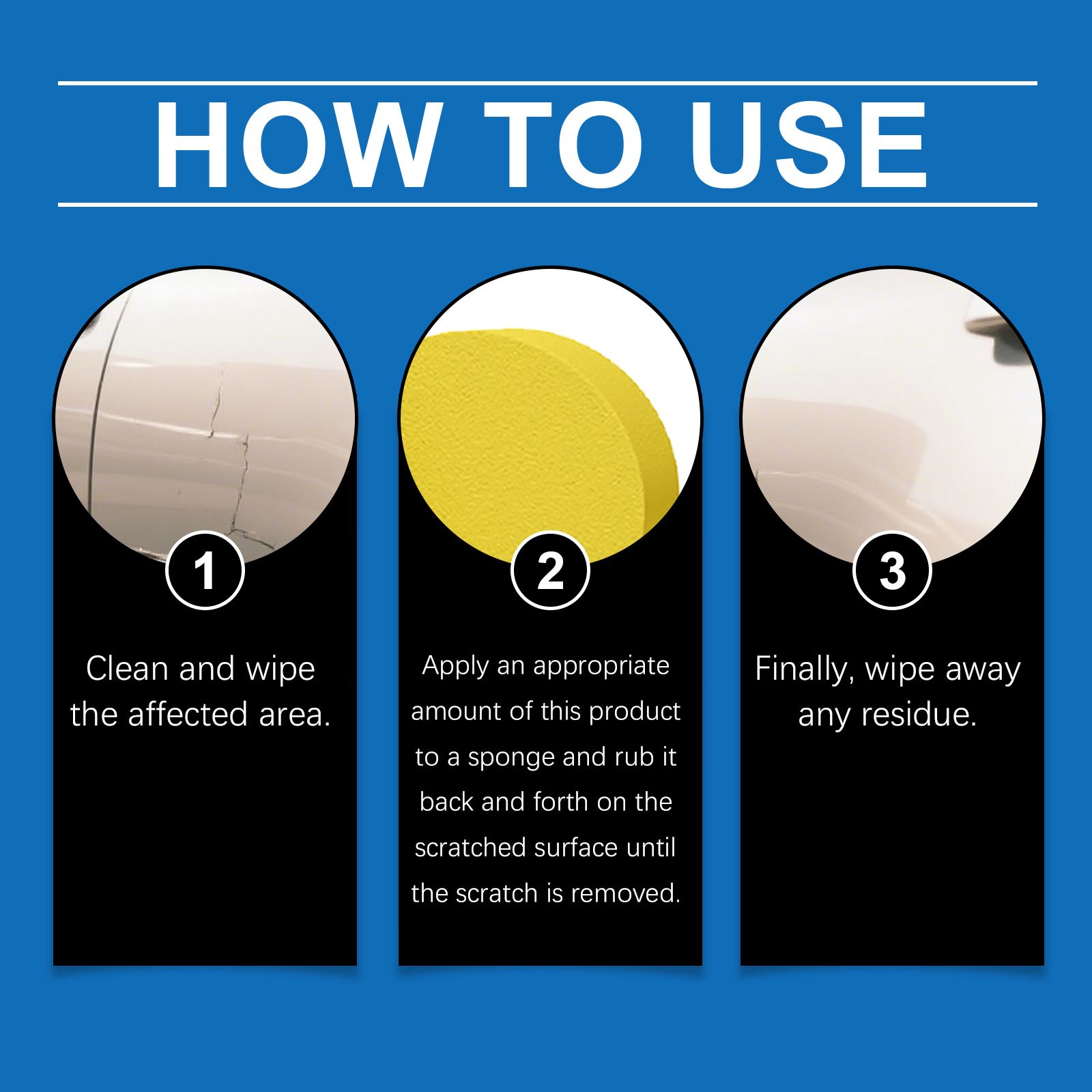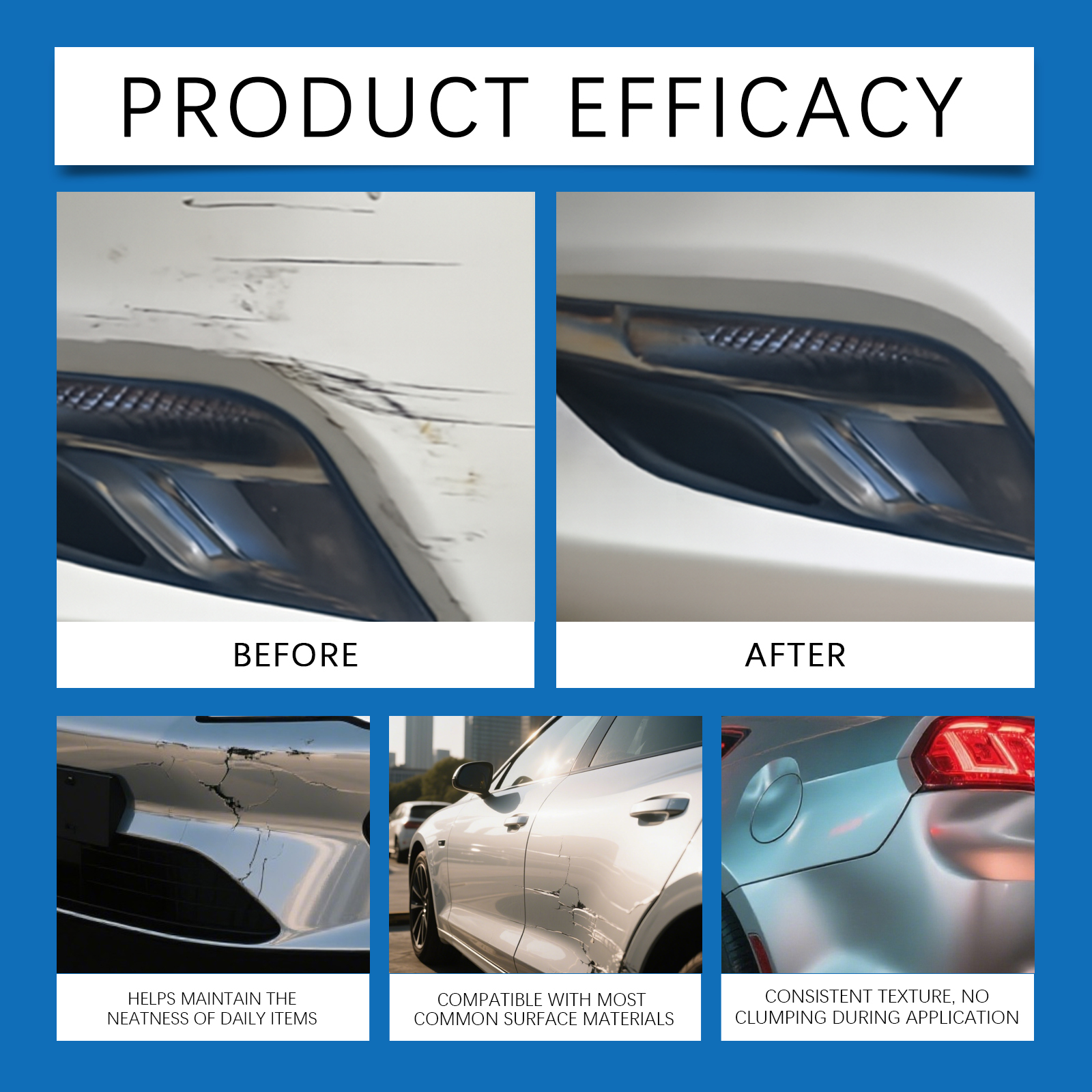我们的划痕修补膏,由氧化铝、含硅聚合物精心调配而成。专为保护表面的同时改善外观设计。使用方法极为便捷:清洁并擦拭受影响区域。将适量本产品涂抹于海绵上,来回擦拭刮痕表面直至刮痕被清除。最后,擦去任何残留物。并且它简单步骤,快速上手,适用于汽车、家具等更多场景。