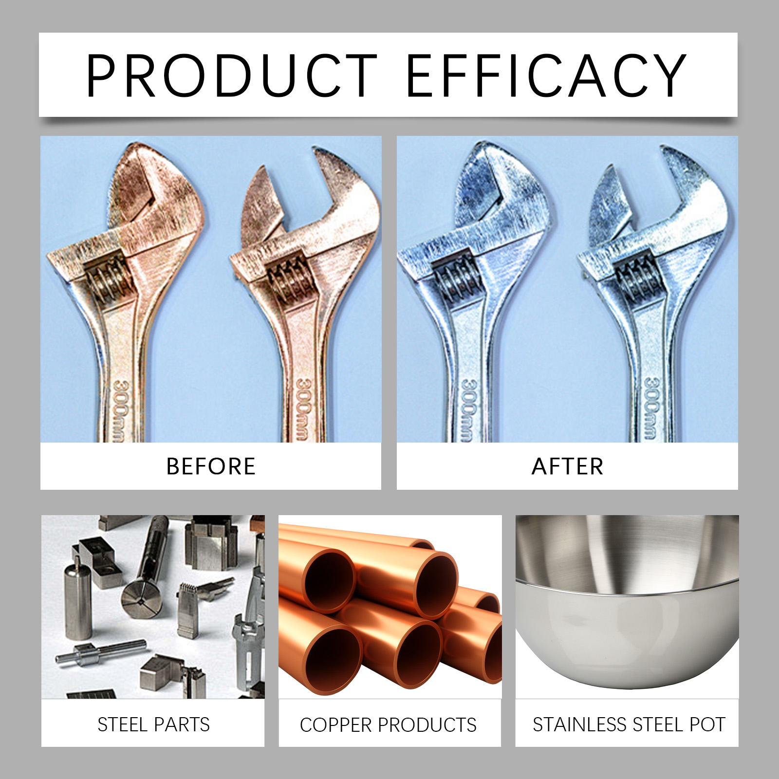 我们的多金属除锈清洁剂,由羟基乙酸, 羟基乙叉二磷酸精心调配而成。专为去除锈迹,恢复金属的原始外观设计。使用方法极为便捷:首先,清洁金属表面。将清洁剂喷洒在生锈区域,等待5-10分钟。用清水擦拭或冲洗。并且采用特别配制,用于修复氧化和划痕,形成保护膜并增强金属耐用性。