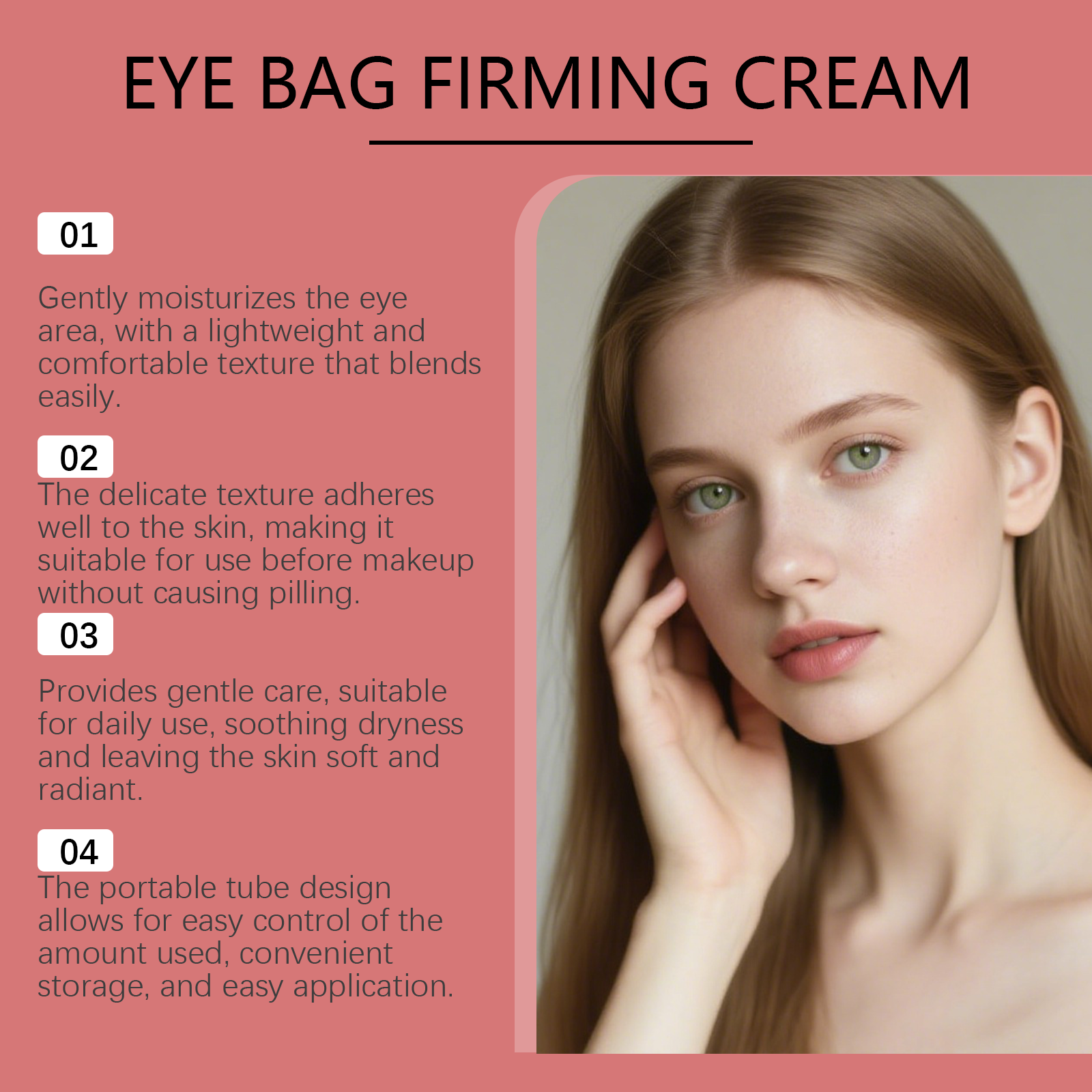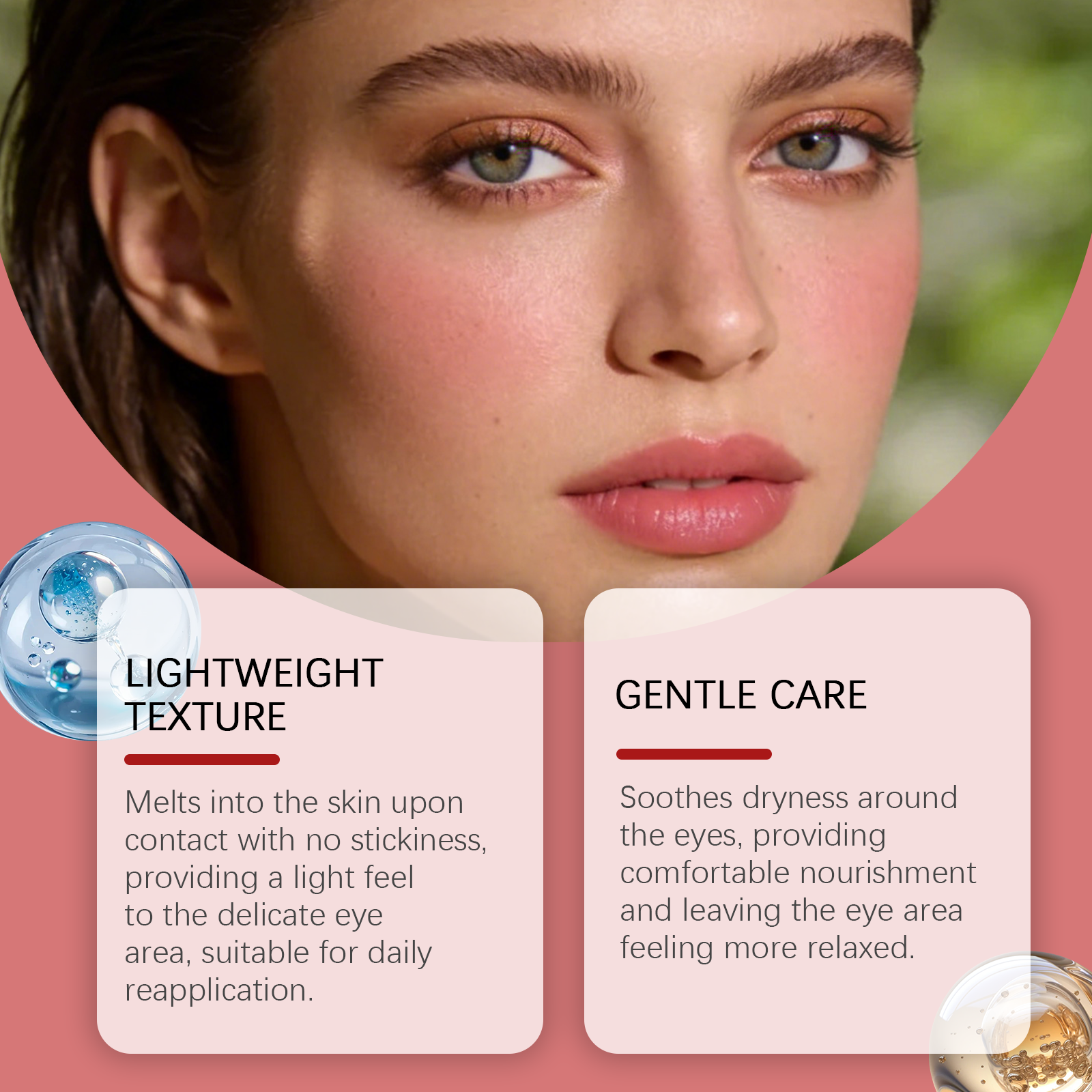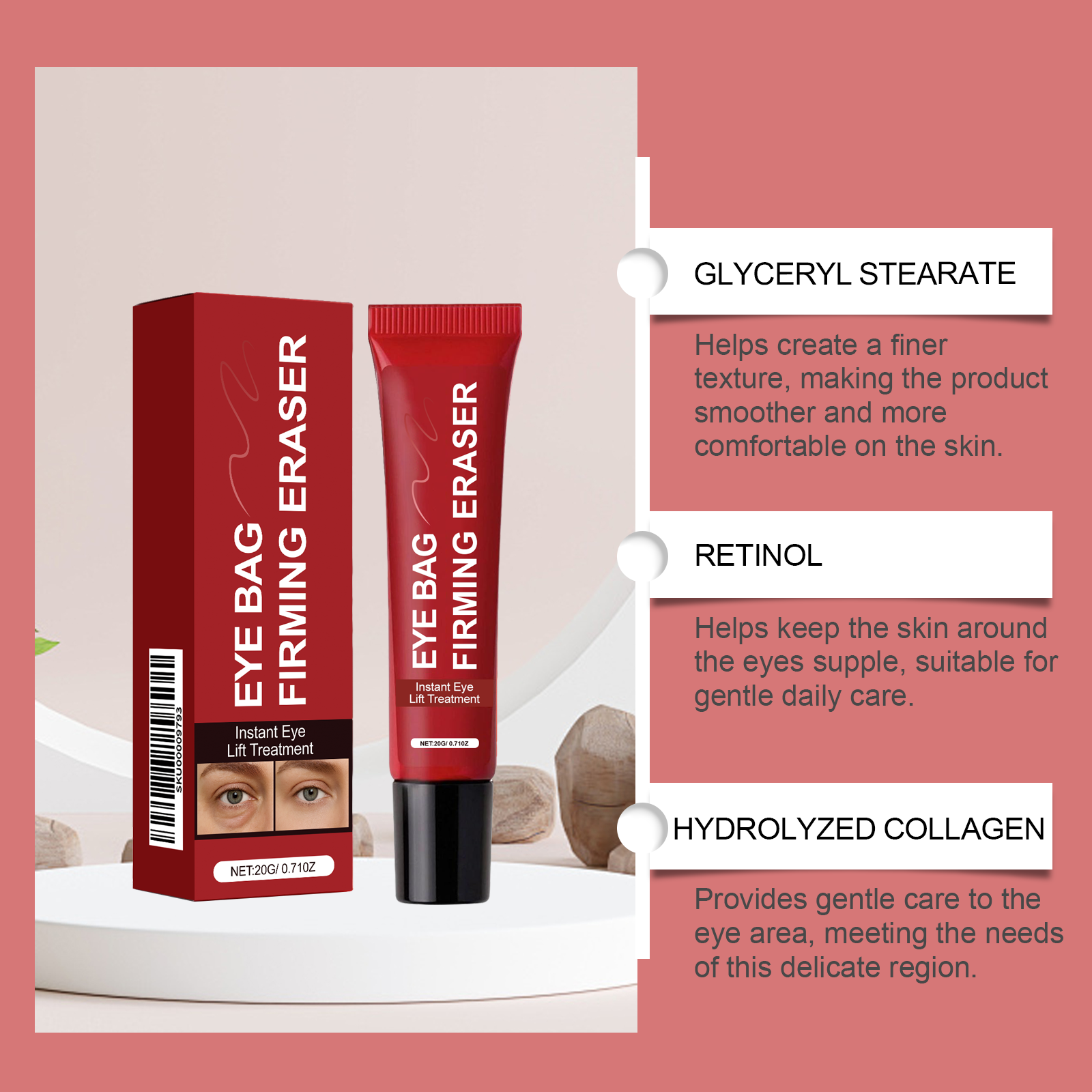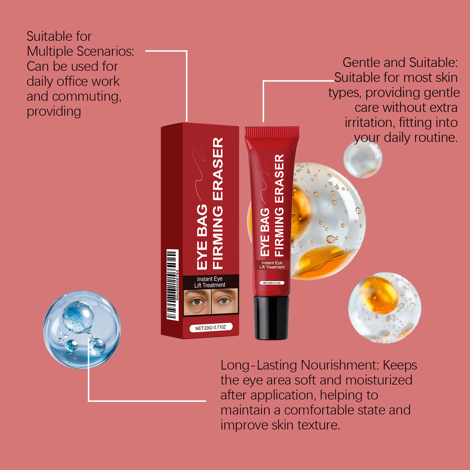 我们的保湿眼霜,由视黄醇、水解胶原精心调配而成。专为舒缓眼部周围的干燥,提供舒适的滋养,使眼周区域感觉更加放松设计。使用方法极为便捷:清洁并擦干眼部周围的皮肤。取一粒绿豆大小的本品量,用指尖温热后,再均匀涂抹于眼部周围。以圆周运动方式轻轻按摩,从外眼角向内眼角方向进行,直至完全吸收,同时注意勿拉扯或拉伸皮肤。并且可以为眼部区域提供温和护理,满足这一娇嫩部位的需求。