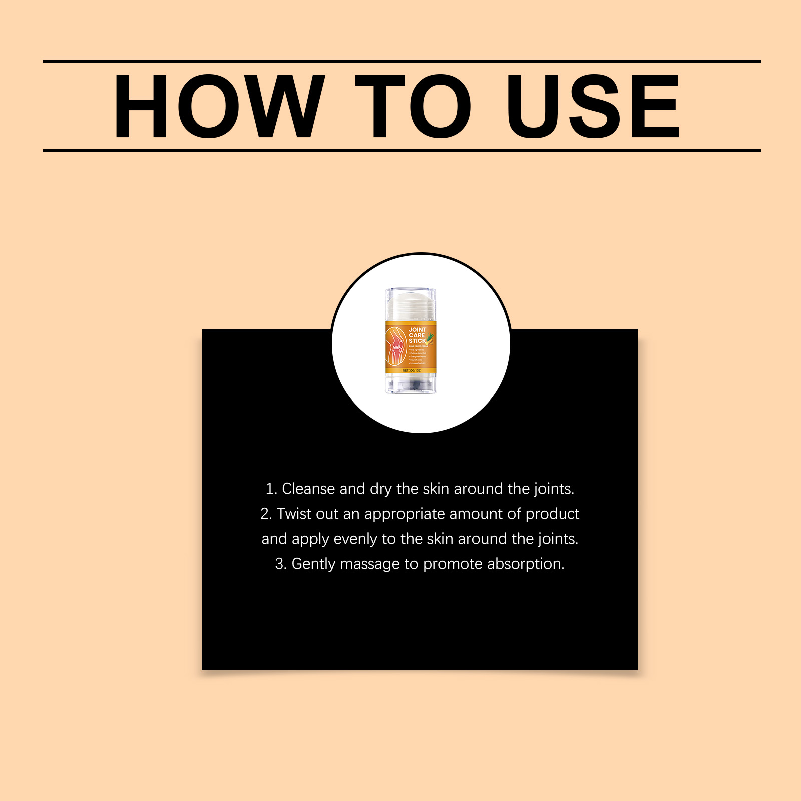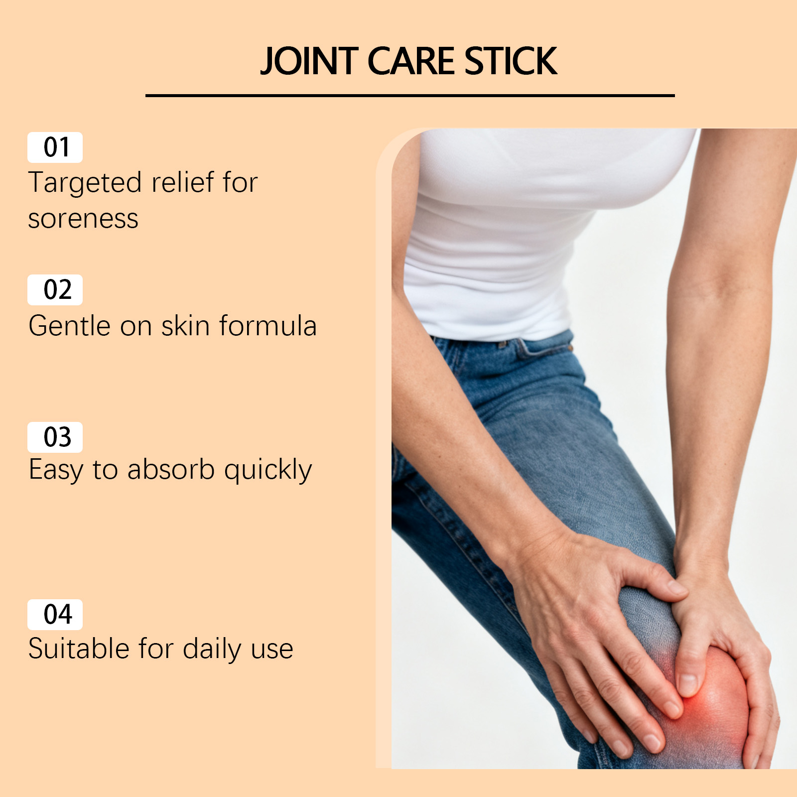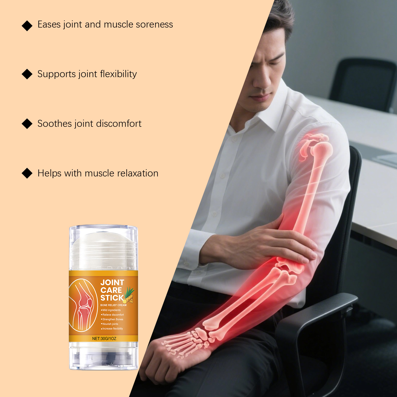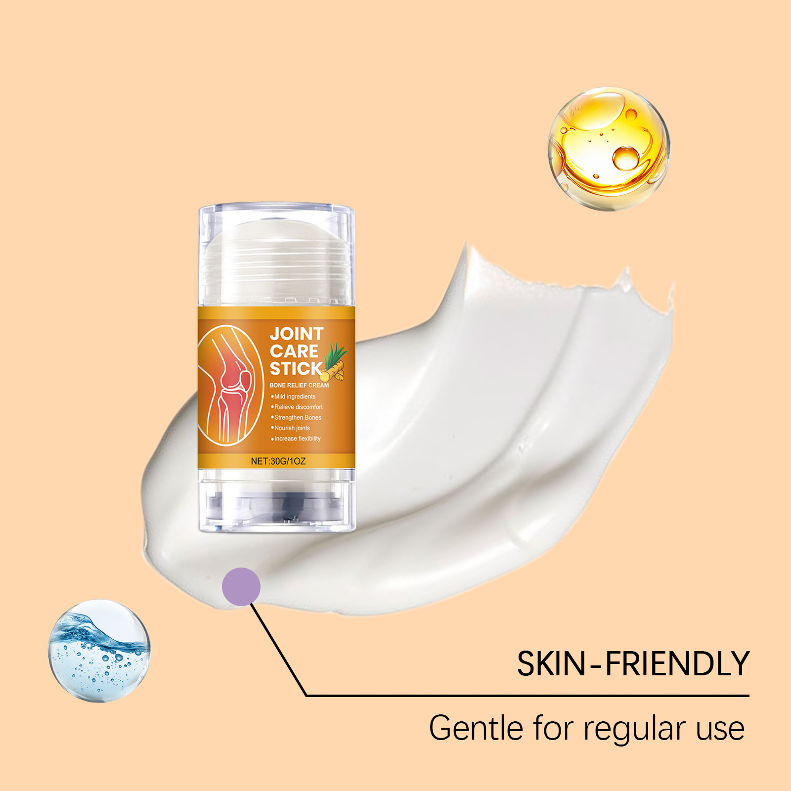 我们的身体护理棒,由生育酚(维生素E)、姜根提取物精心调配而成。专为酸痛的关节提供舒适感设计。使用方法极为便捷:1.清洁并擦干关节周围的皮肤。2.拧出适量产品并均匀涂抹在关节周围的皮肤上。3.轻柔按摩,以促进吸收。并且可以辅助关节顺畅活动。